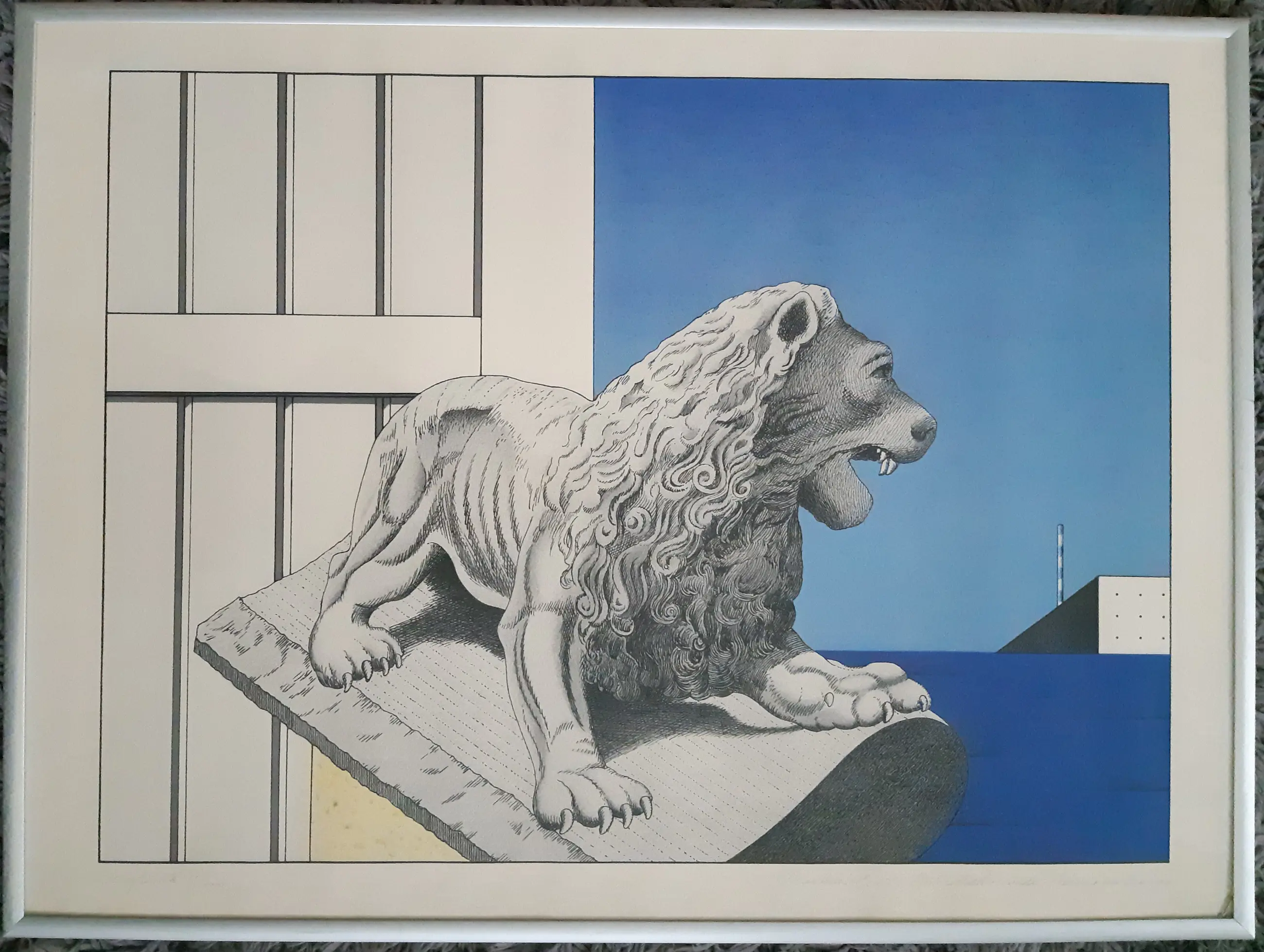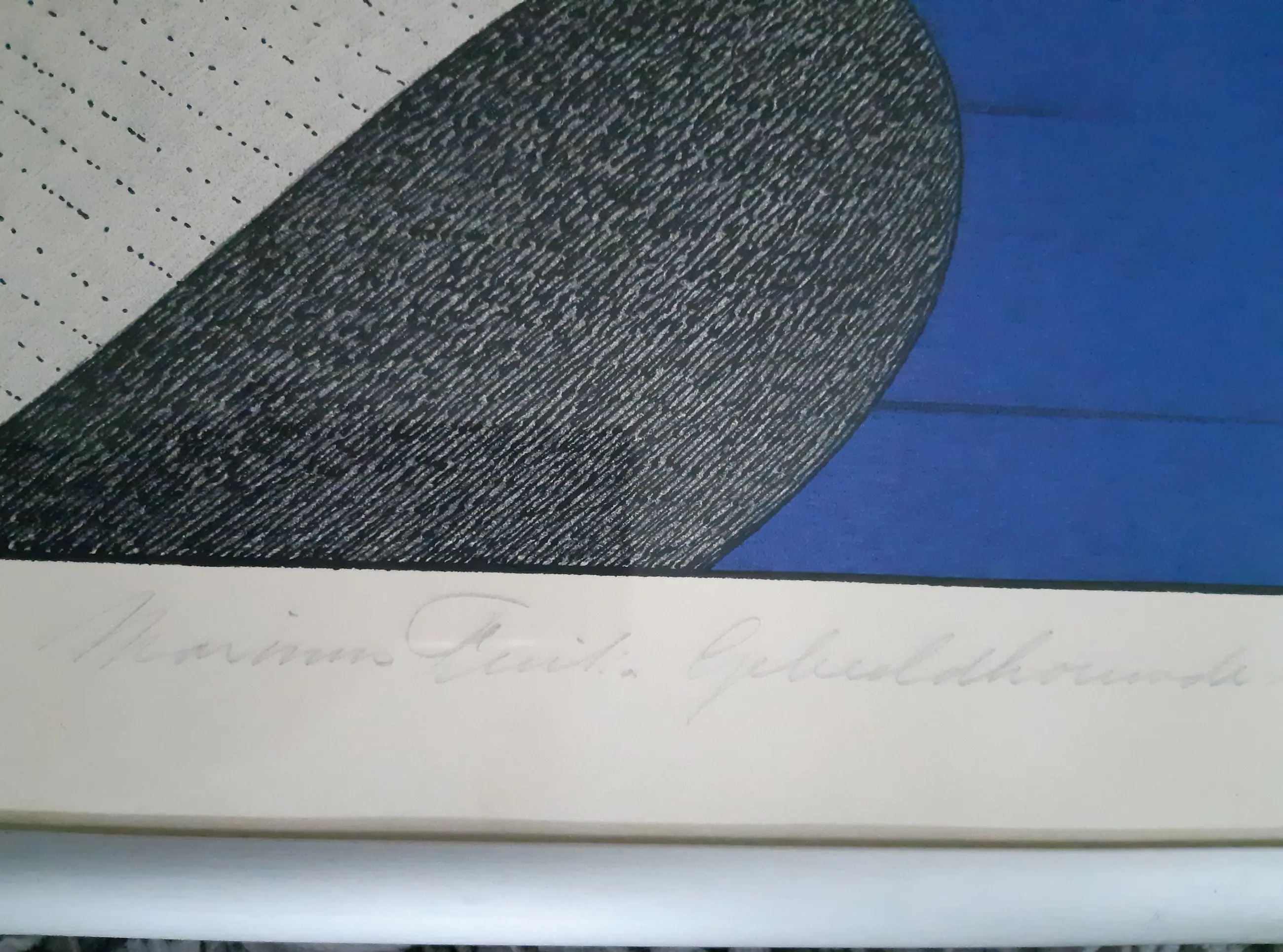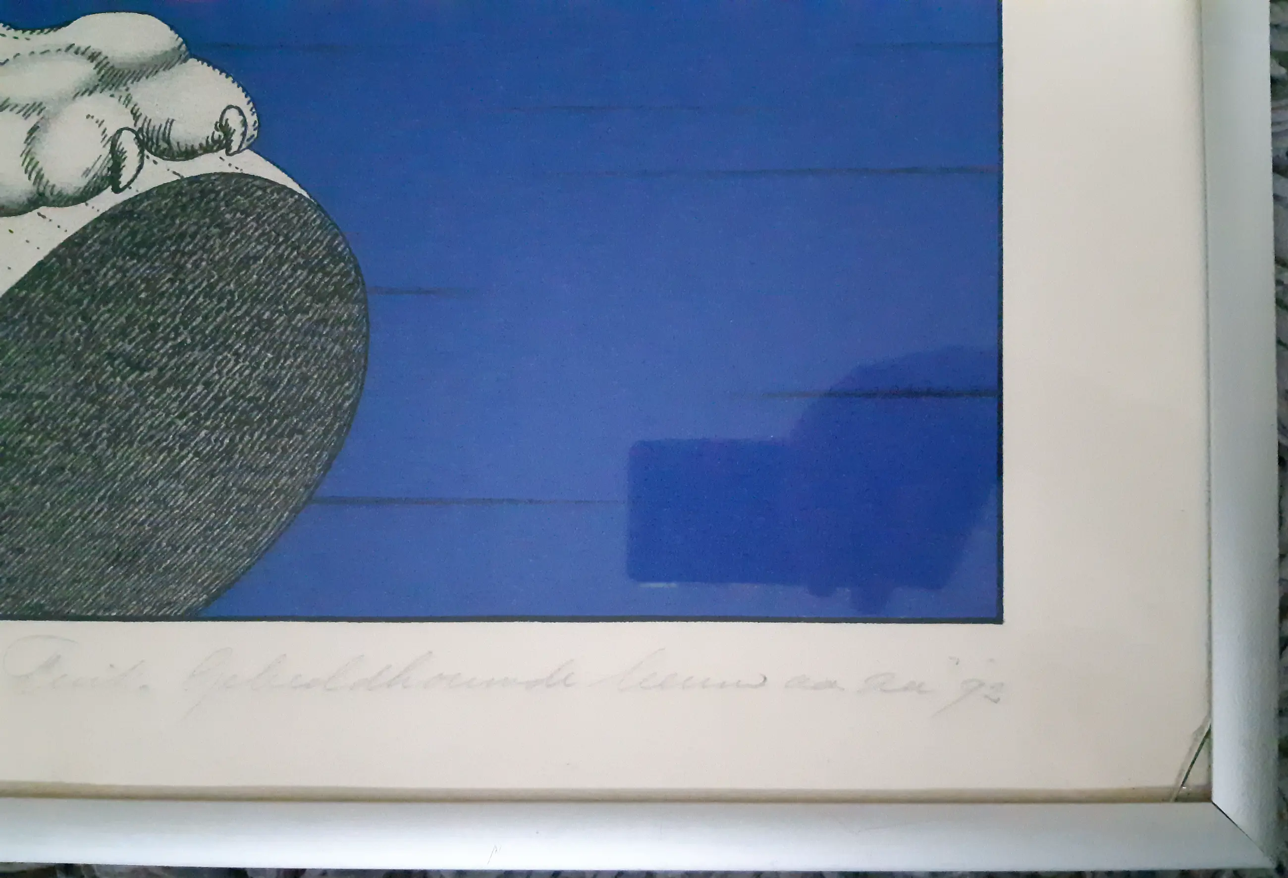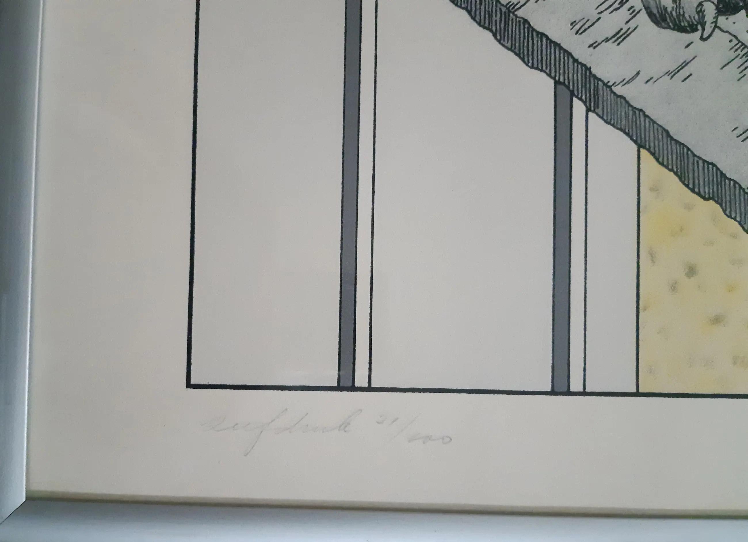 Grote zeefdruk van Marinus Fuit. Met potlood gesigneerd, gedateerd, genummerd en voorzien van titel en annotatie zeefdruk. Ingelijst in aluminium lijst. De conditie is goed, de zeefdruk is enigszins egaal vergeeld, glas rechtsonder beschadigd (zie foto's). Op de foto's kunnen reflecties zichtbaar zijn.