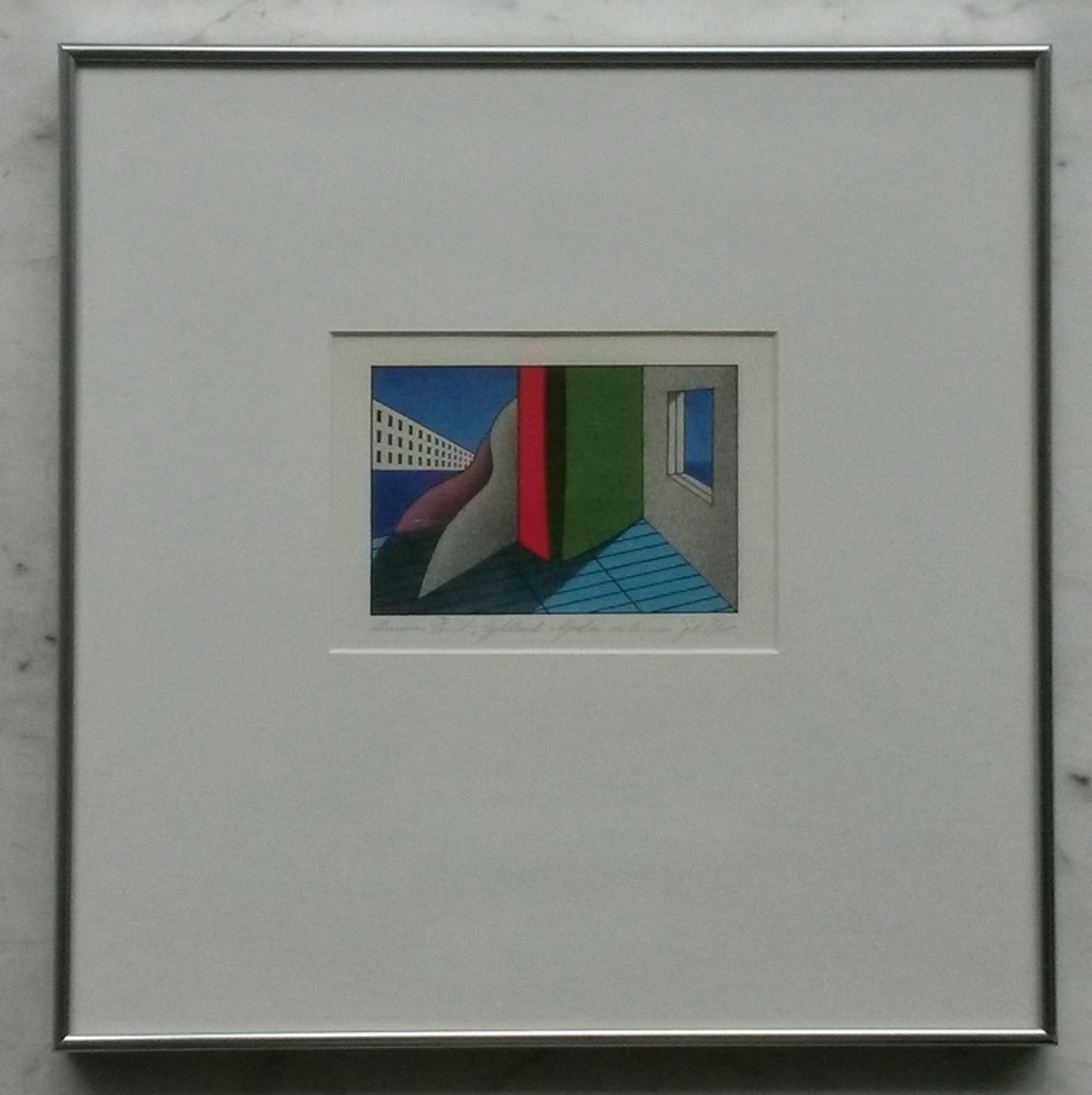Subtiele litho van Marinus Fuit, getiteld Gekleurd object in interieur. De kleuren zijn helderder dan op de foto's. Het werk is door de maker met potlood gesigneerd, van titel, jaartal ('96) en oplage (7/30) voorzien. De litho meet 7,5 x 11 cm en is met een zuurvrij passe partout ingelijst in een aluminium lijst van 30 x 30 cm. Werk en lijst verkeren in een onberispelijke staat.