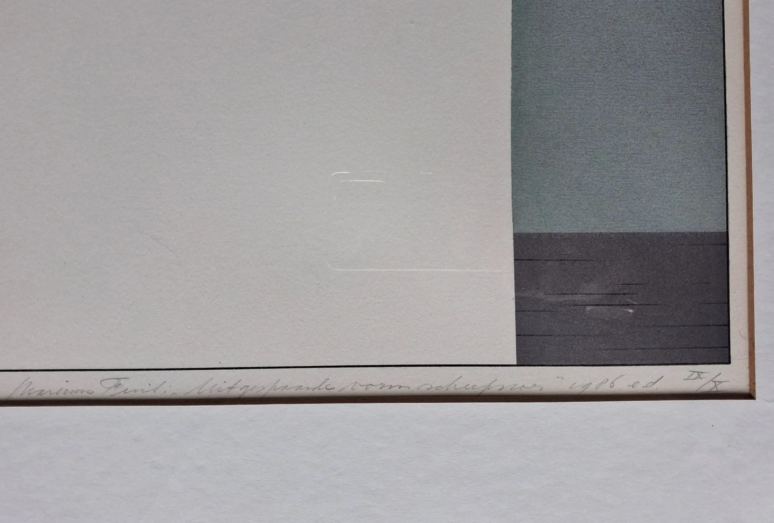 Bijna abstracte litho van Marinus Fuit, in een kleine oplage. Met potlood gesigneerd, genummerd, gedateerd en voorzien van titel en annotaties e.d. en 4 kl. Ingelijst in aluminium Barth-lijst. De conditie van het geheel is zeer goed. Op de foto's kunnen reflecties zichtbaar zijn.