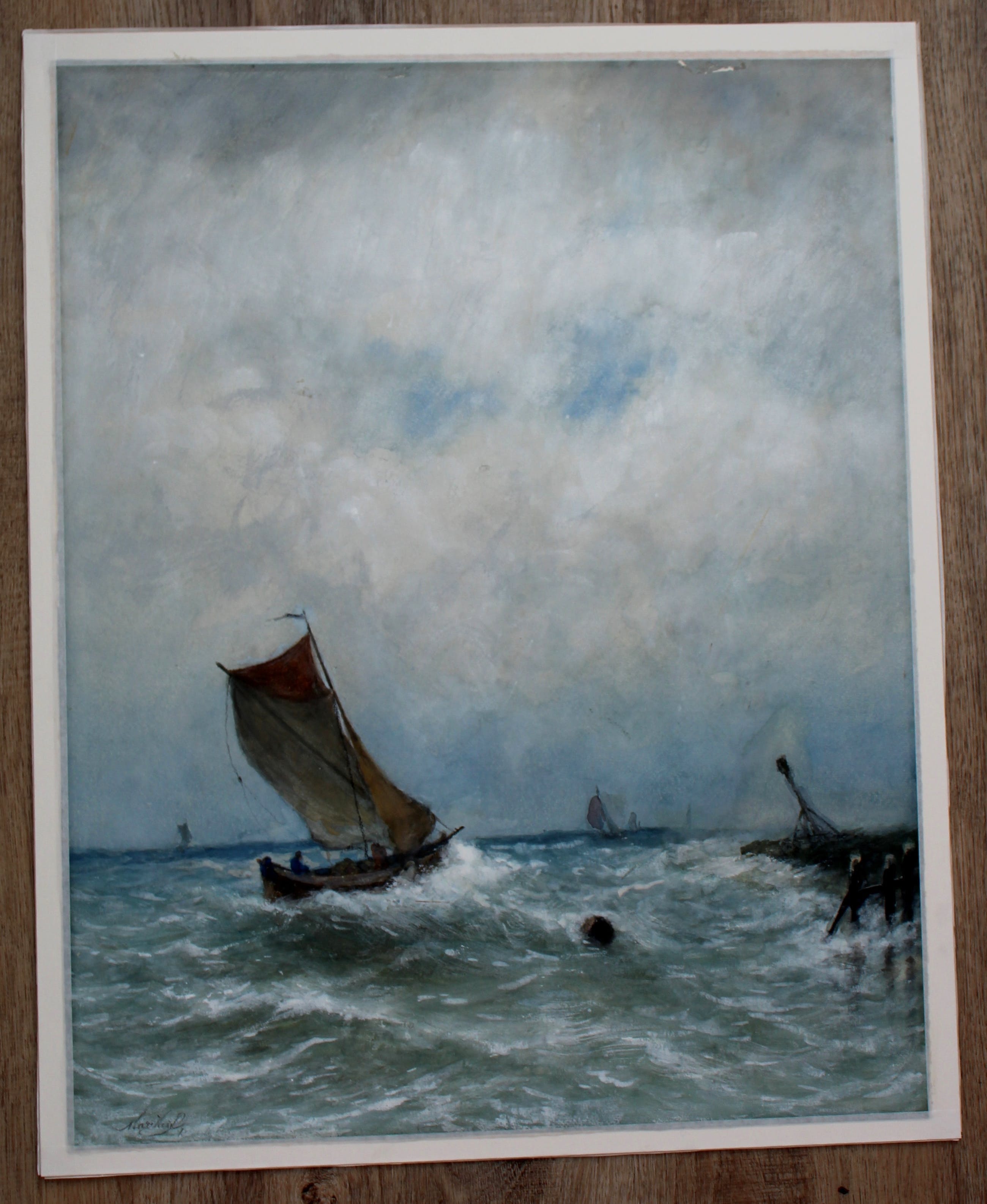 Mooie aquarel van Marinus Heijl Titel: Op zee. Afmetingen voorstelling: H60 x b48 cm. Afmetingen board: 64 x 51 cm. Het werk is linksonder door de kunstenaar gesigneerd. De authenticiteit van het, aangeboden, werk wordt volledig gegarandeerd. Een certificaat van echtheid kan, op aanvraag, worden gemaild. Herkomst: collectie ABN AMRO
