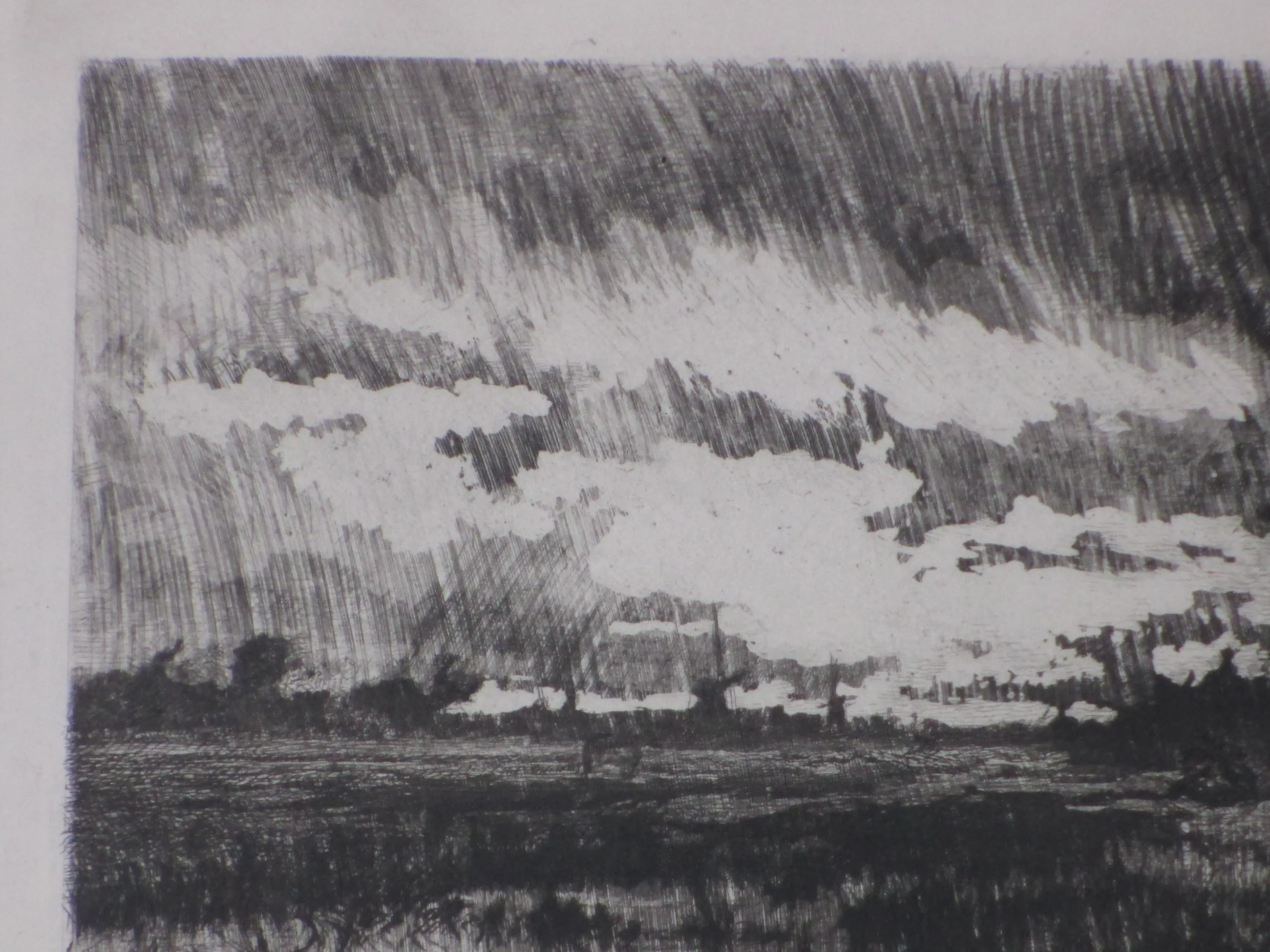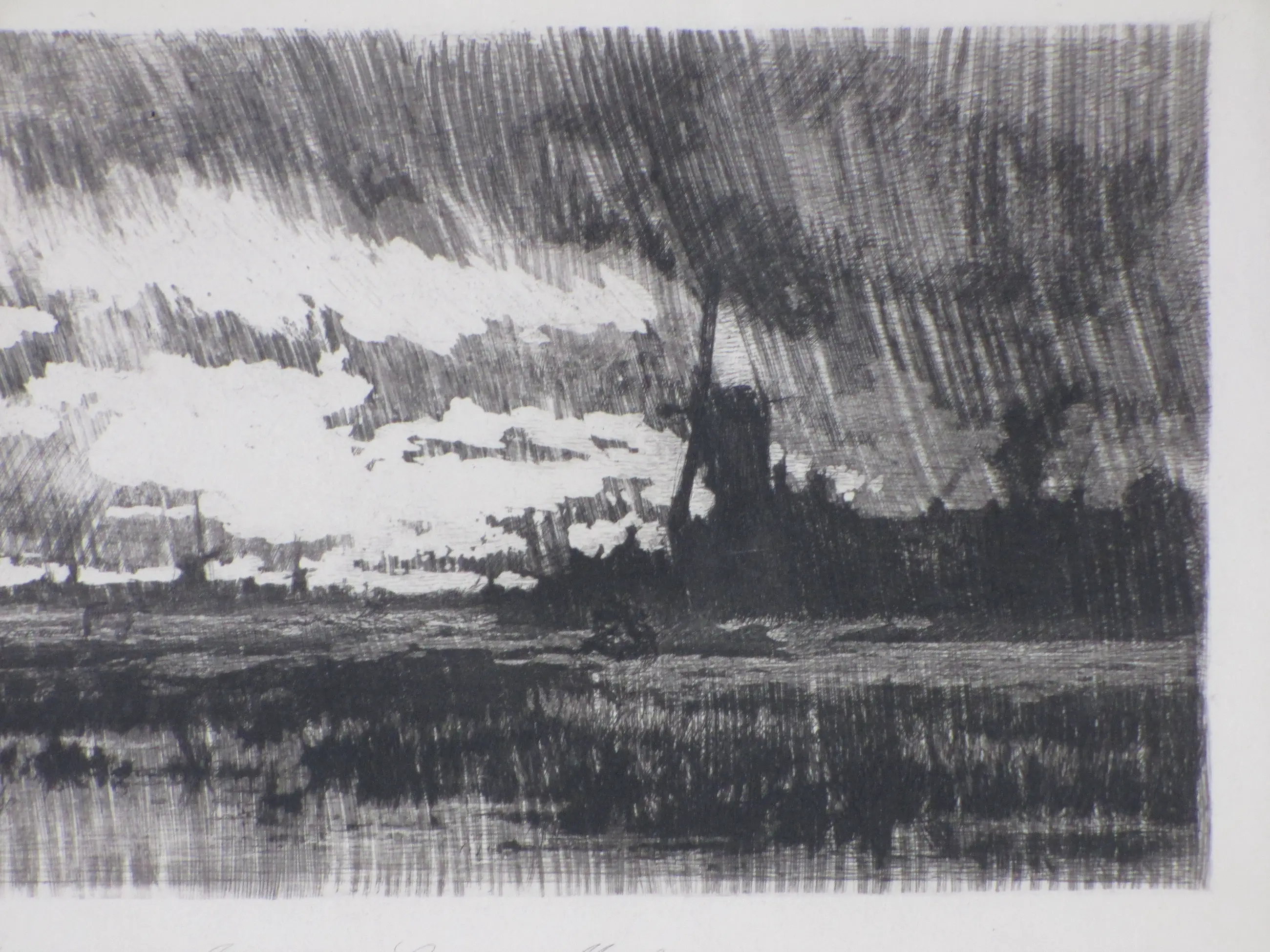 Ets op chine-collé door Marinus HeijlVoorstelling van regen in de polderLosbladig, beeldmaat 13x22,5, bladmaat 30x44Gesigneerd l.o. in de druk 'Mar. Heijl'Getiteld in de druk m.o. 'Aan den Coene - Molen'Blad heeft lichte foxing, buiten de voorstellingAuthenticiteit volledig gegarandeerd