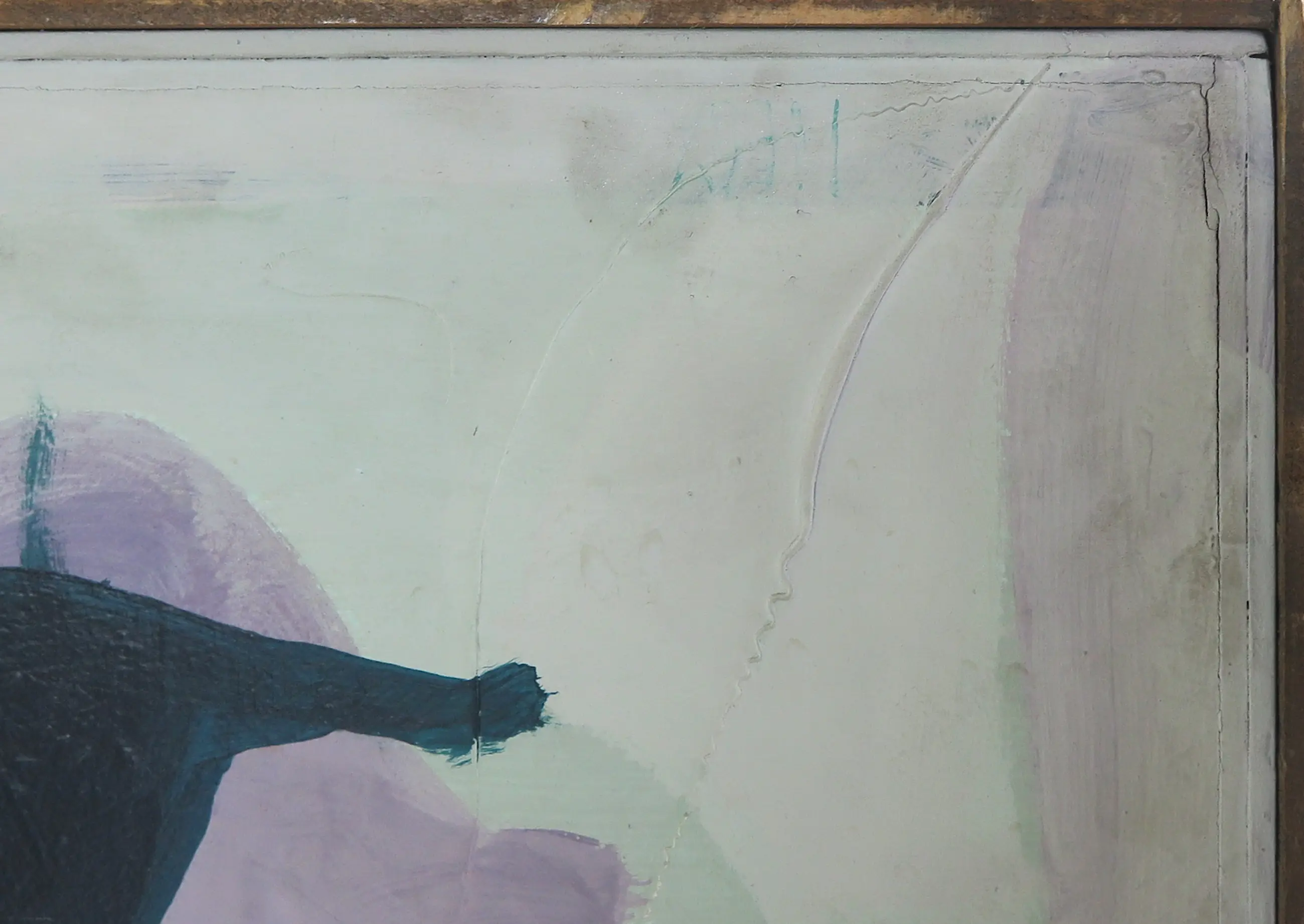 | Een aantal kleine plekjes verfschade en rechtsboven wat lijkt op scheurtjes in het paneel. De lijst is daarnaast onvolledig: onder ontbreekt een lat, en links is de lat gedeeltelijk afgebroken. | |