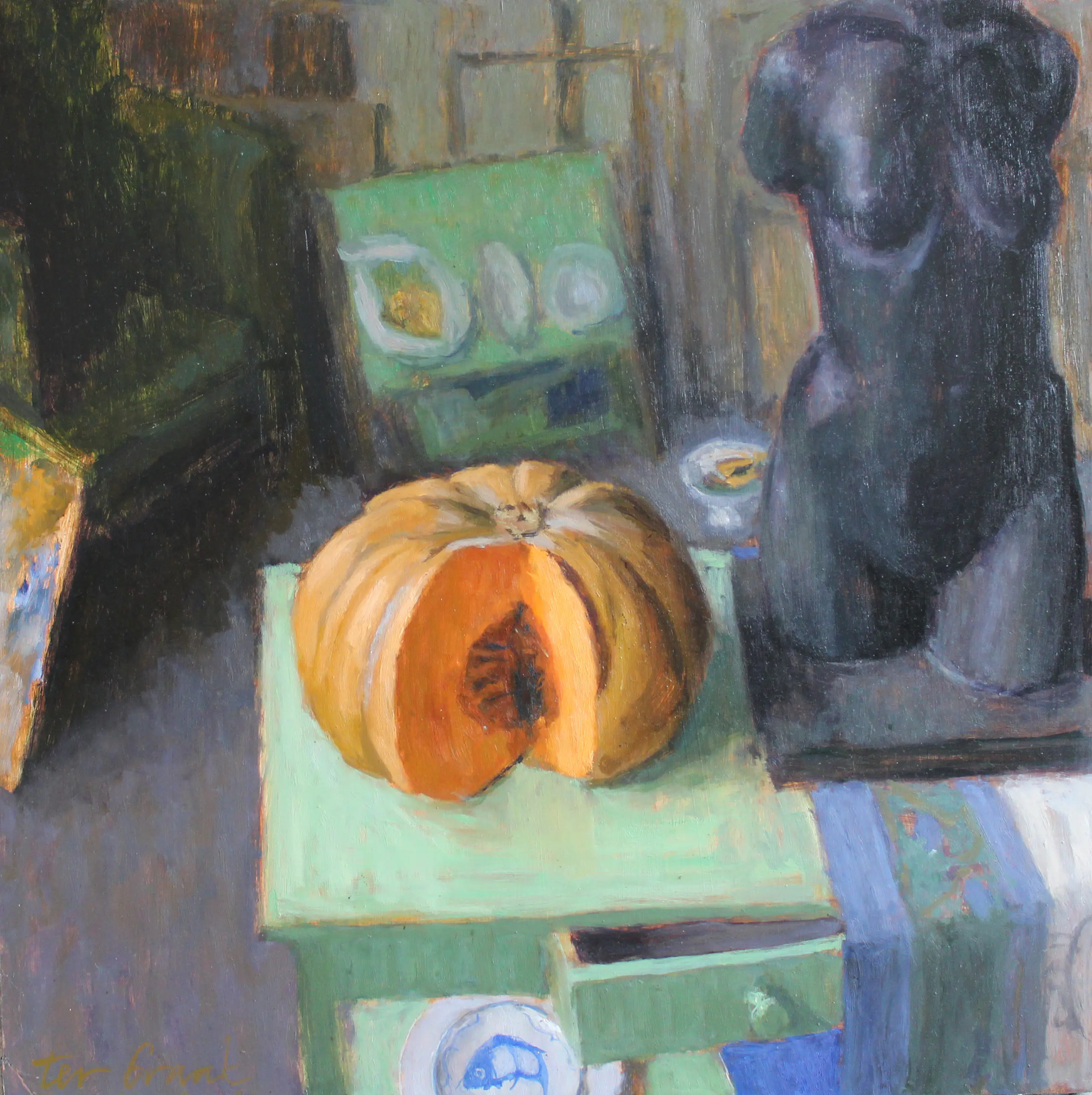 Een stilleven van Mario ter Braak is nooit zomaar een stilleven. Het is een zorgvuldig gecomponeerde scène, waarin vruchten de orde scheppen en associaties oproepen. Dit is een vroeg werk van deze succesvolle Noordelijke Figuratief.