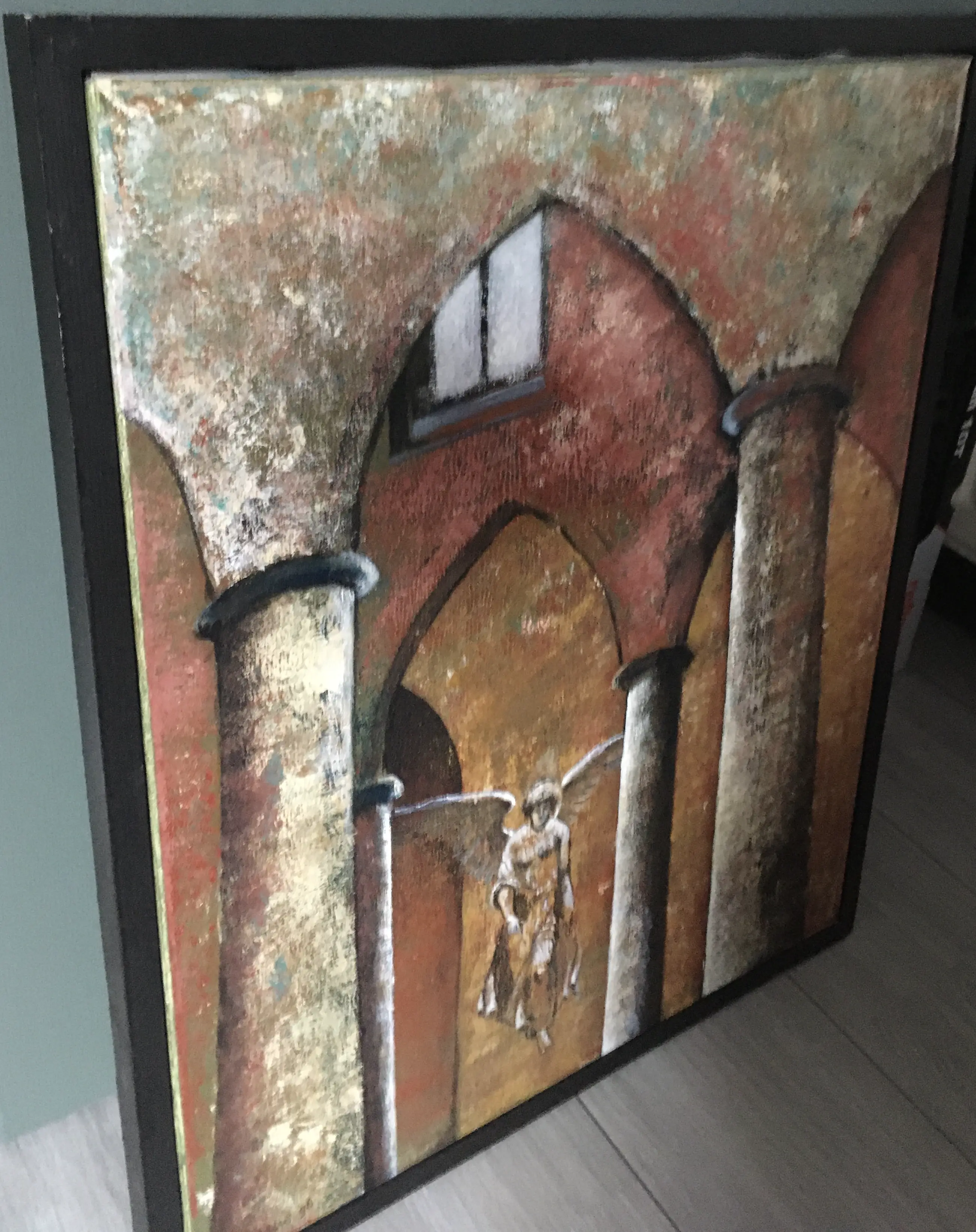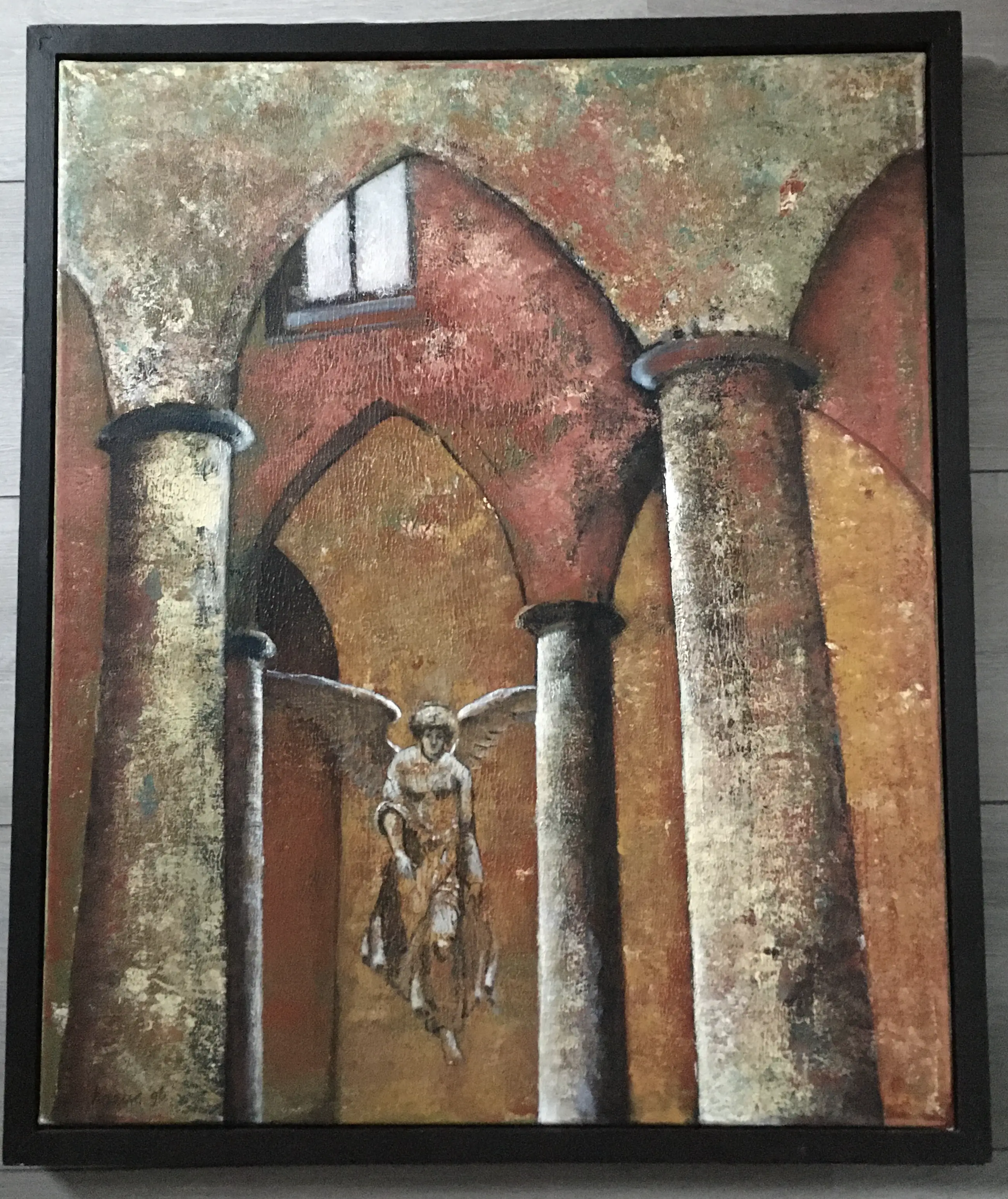 Schilderij van Marion Kraus. Stl leven in een gebouw met engel in beeld.