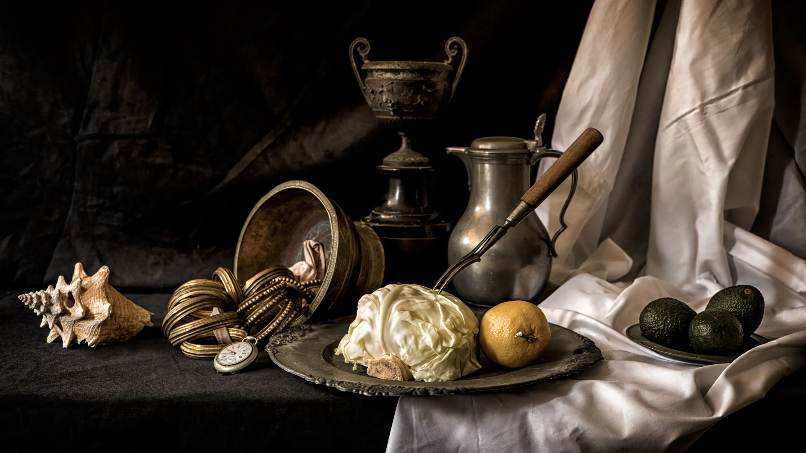 Stilleven fotografie geinspireerd op de 17 eeuw net als in die tijd is er gebruik gemaakt van symboliek zoals het klokje - gedenk te sterven- het zoet-de kan met drank - en het zuur - de citroen.