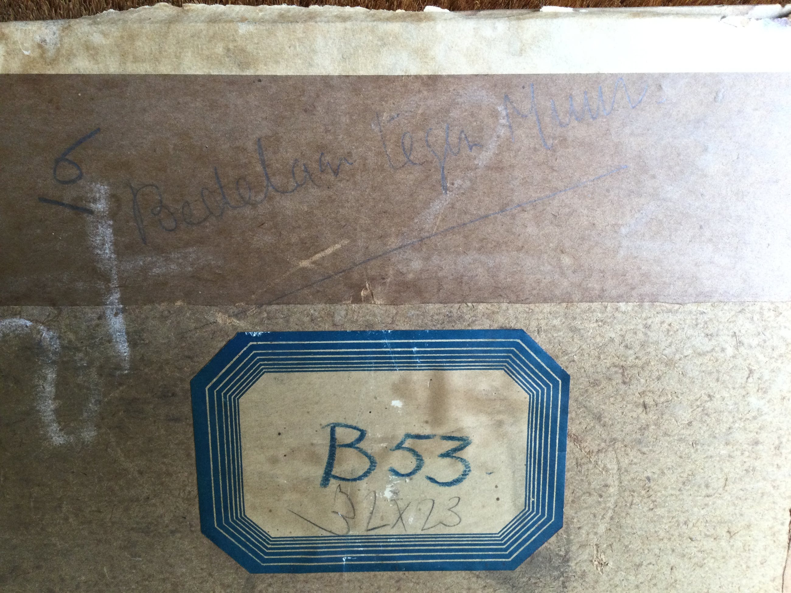 | Papier rafelig langs de randen, verkleurd door de tijd, zonder lijst, achtertik los. | |