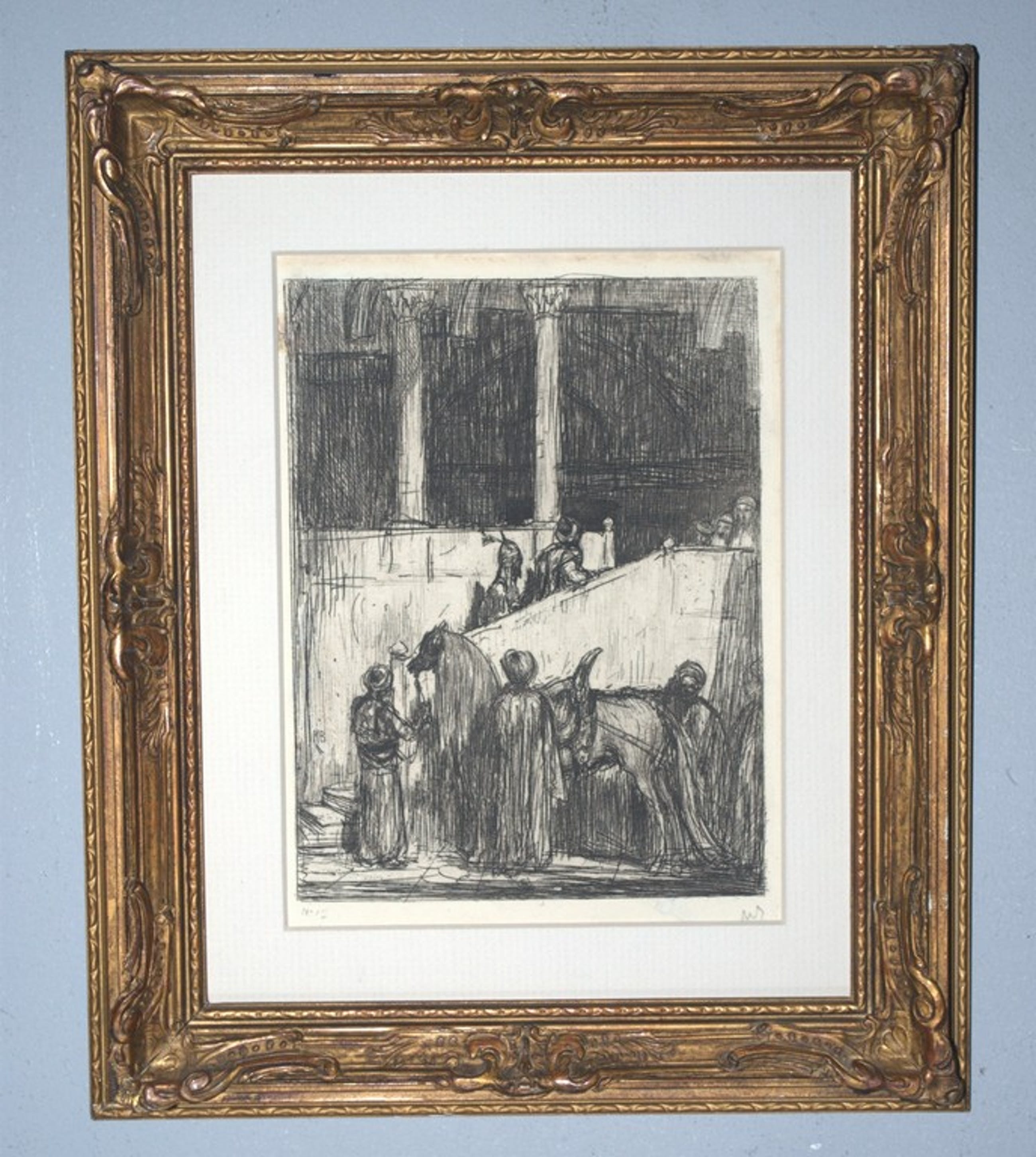 Achter glas en passepartout, in een prachtige lijst met een enkele kleine reparatie, 31x26 cm.