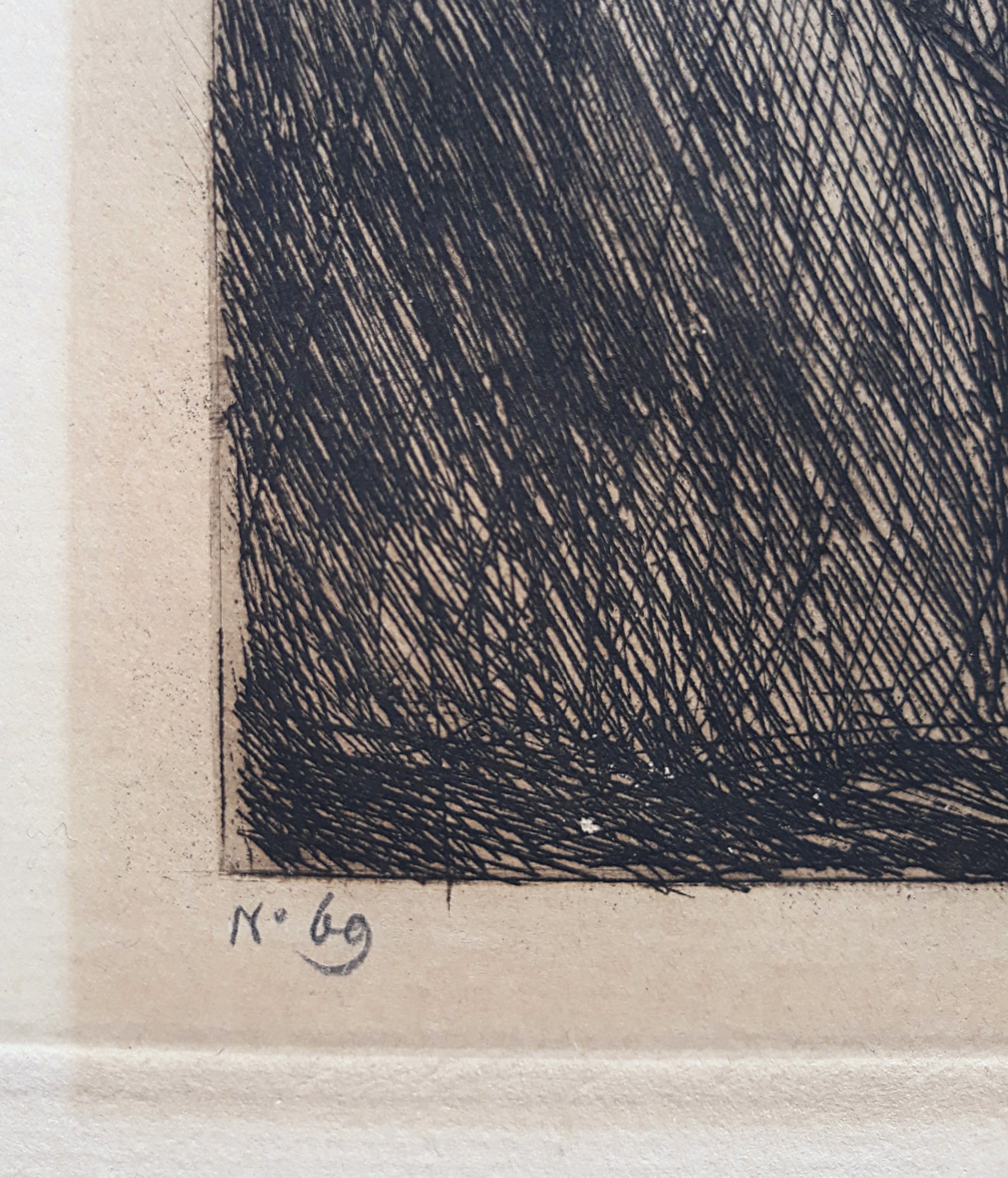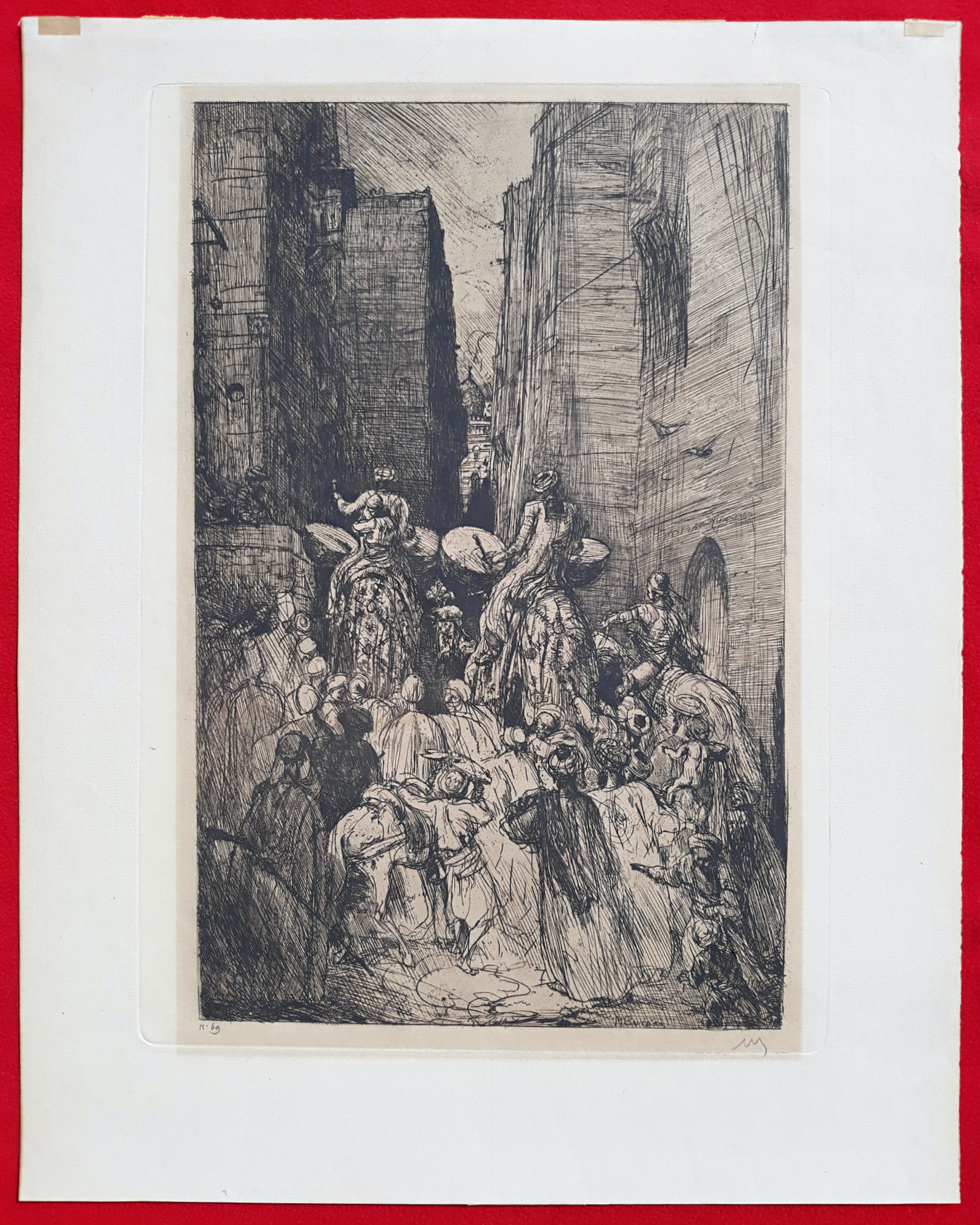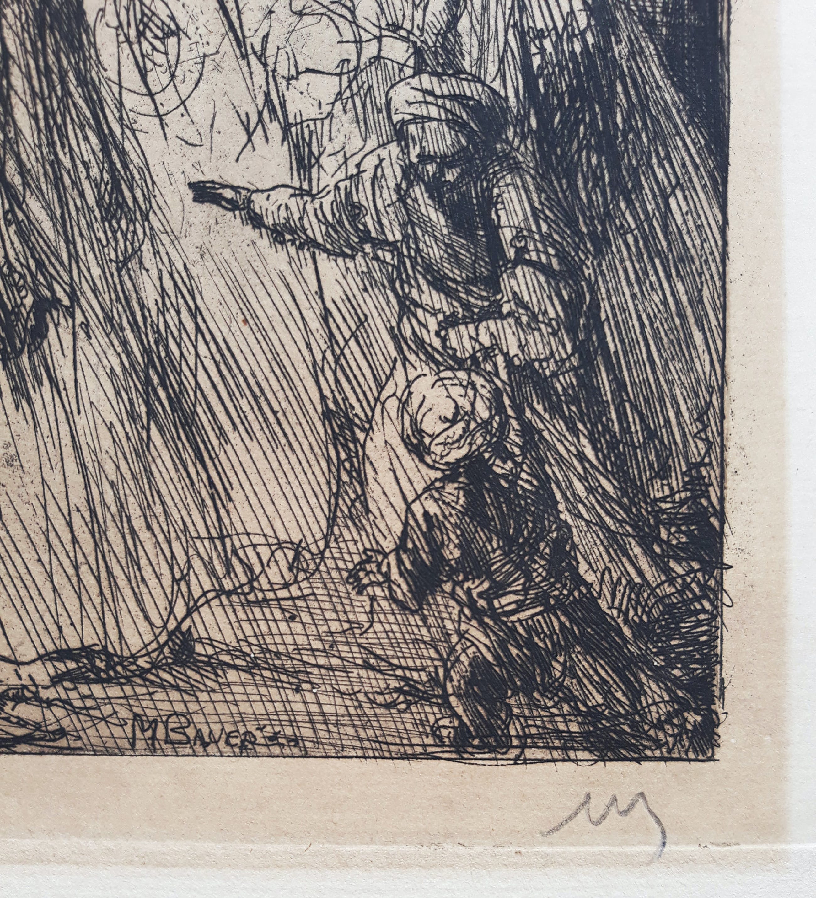 Karakteristieke compositie van Marius Bauer uit 1900. Ets op papier, met potlood gemonogrammeerd rechtsonder en genummerd linksonder (“No 69”). In goede conditie; blad heeft ingelijst gezeten want is sterker verkleurd binnen een vorig passe-partout en er zitten taperesten aan de rand bovenaan. Opnieuw ingelijst met passe-partout valt de verkleuring relatief weg. Literatuur: Van Wisselingh 126.