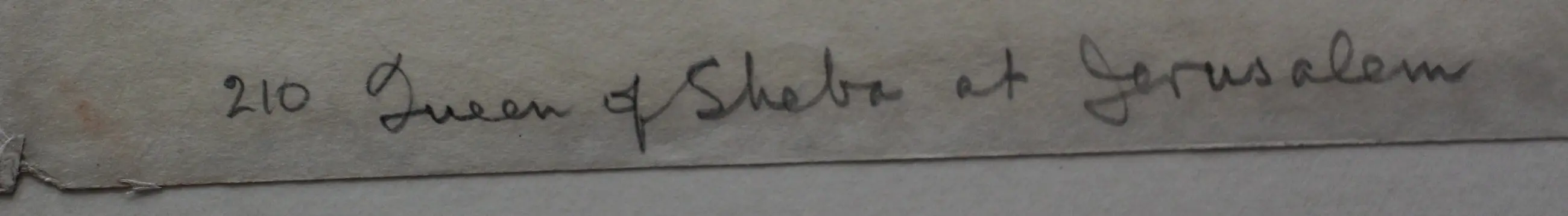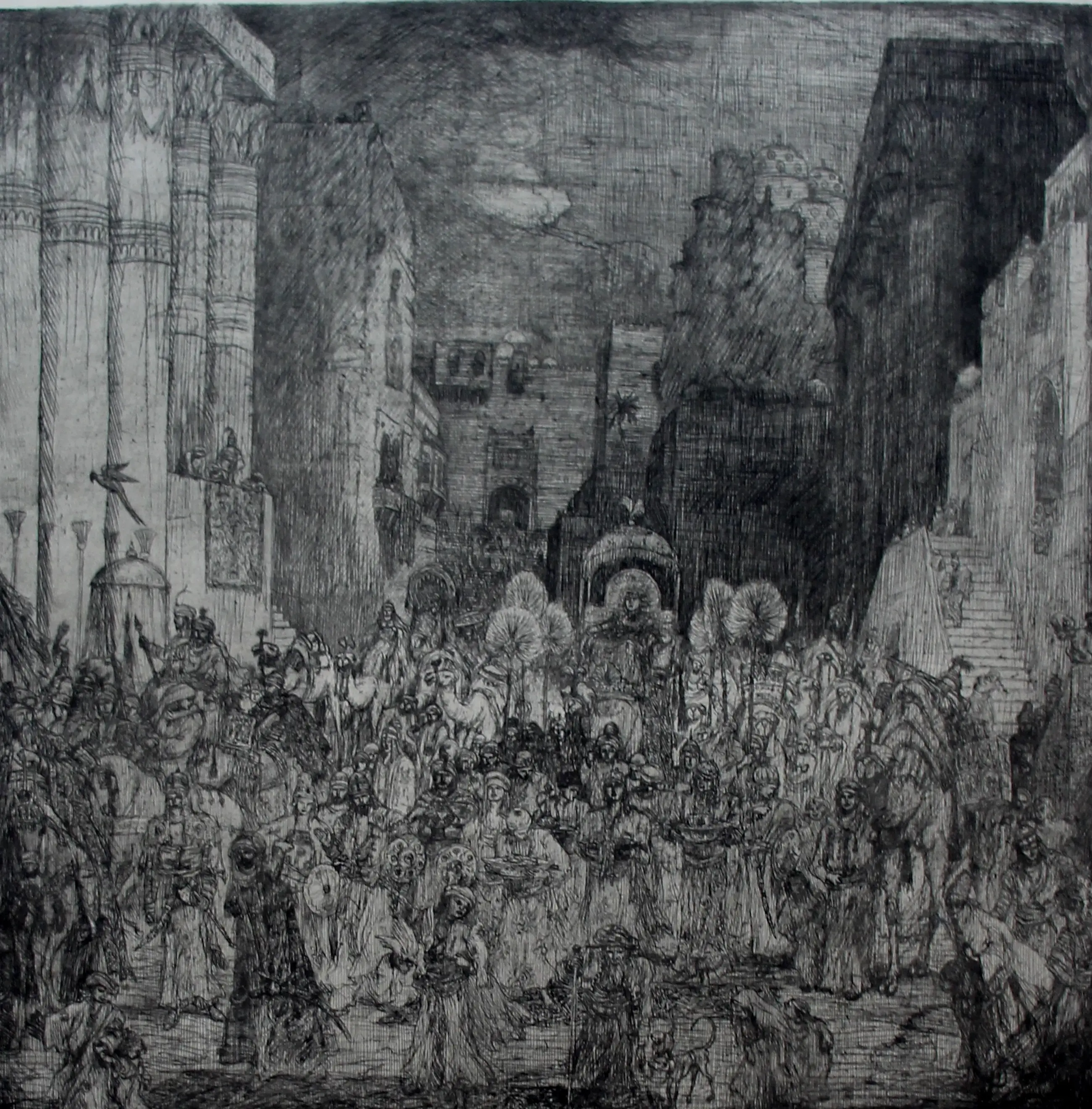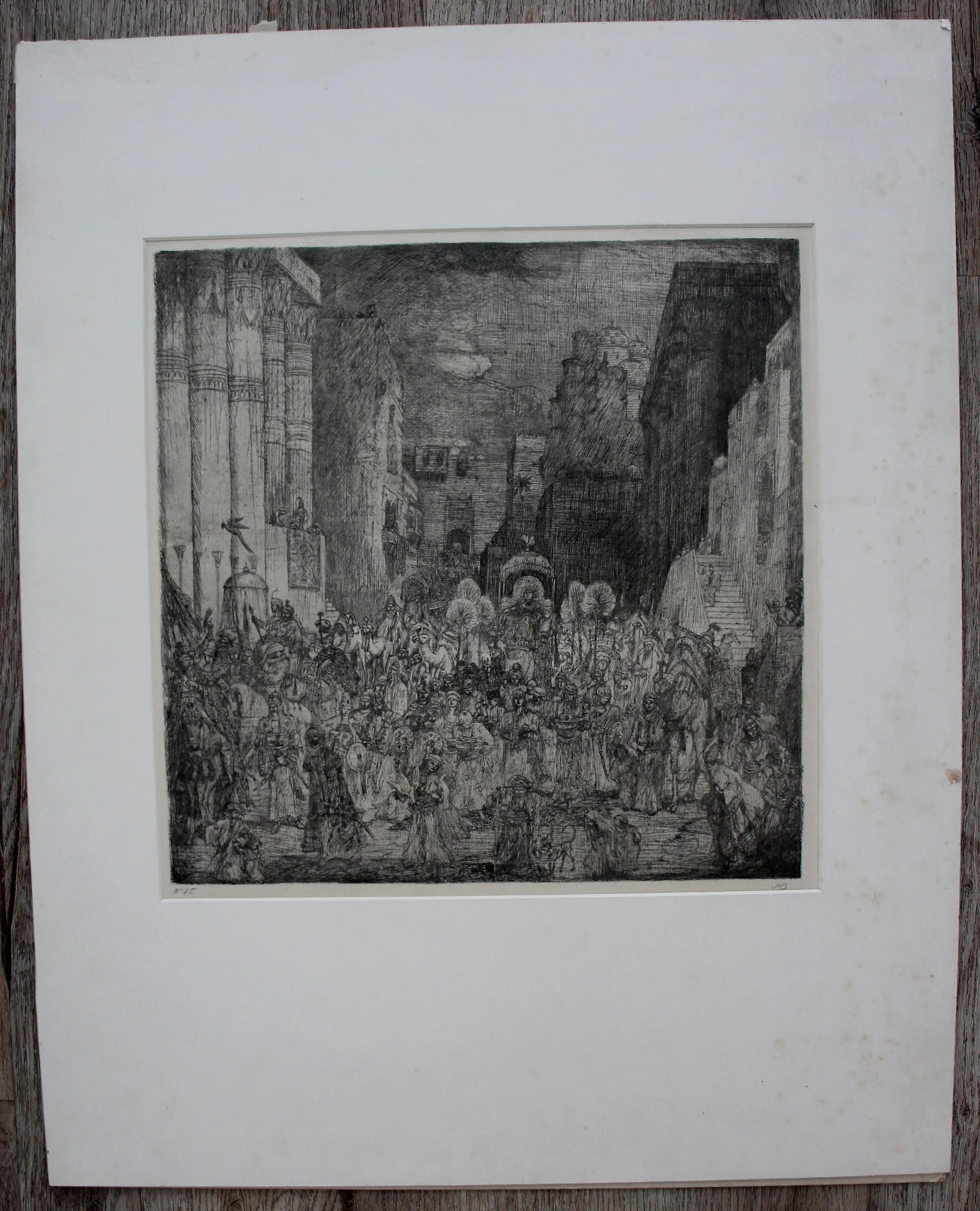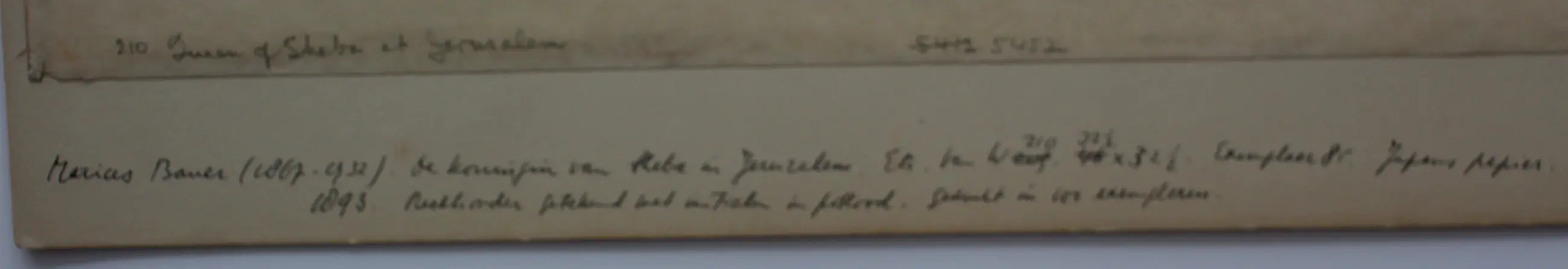 Ets van Marius Bauer. Titel: De koningin van Sheba te Jeruzalem. Jaar: 1893. No: 85(100 afdrukken). Afmetingen blad: H53 x b47cm. Afmetingen voorstelling: H32.5 x b32.5cm