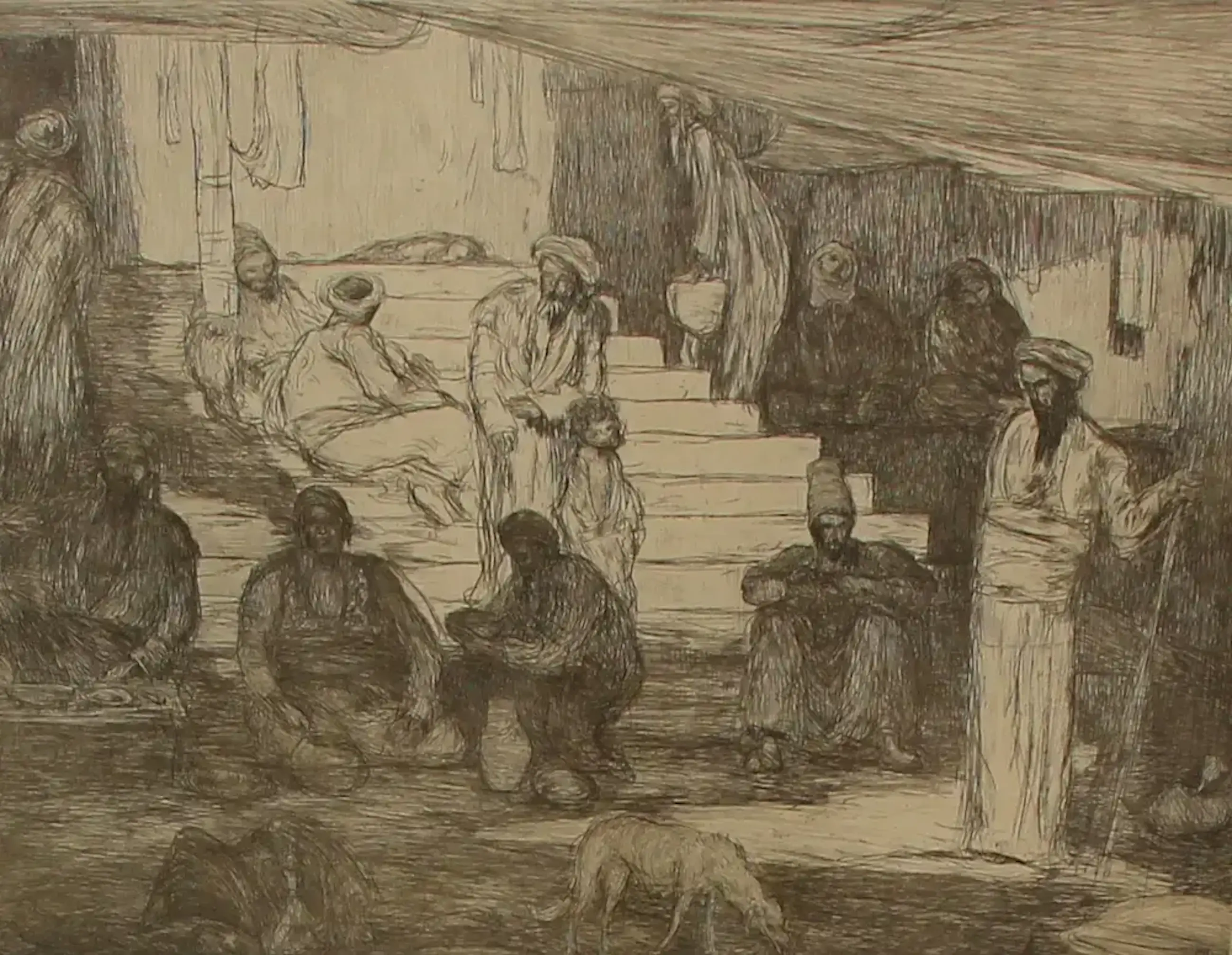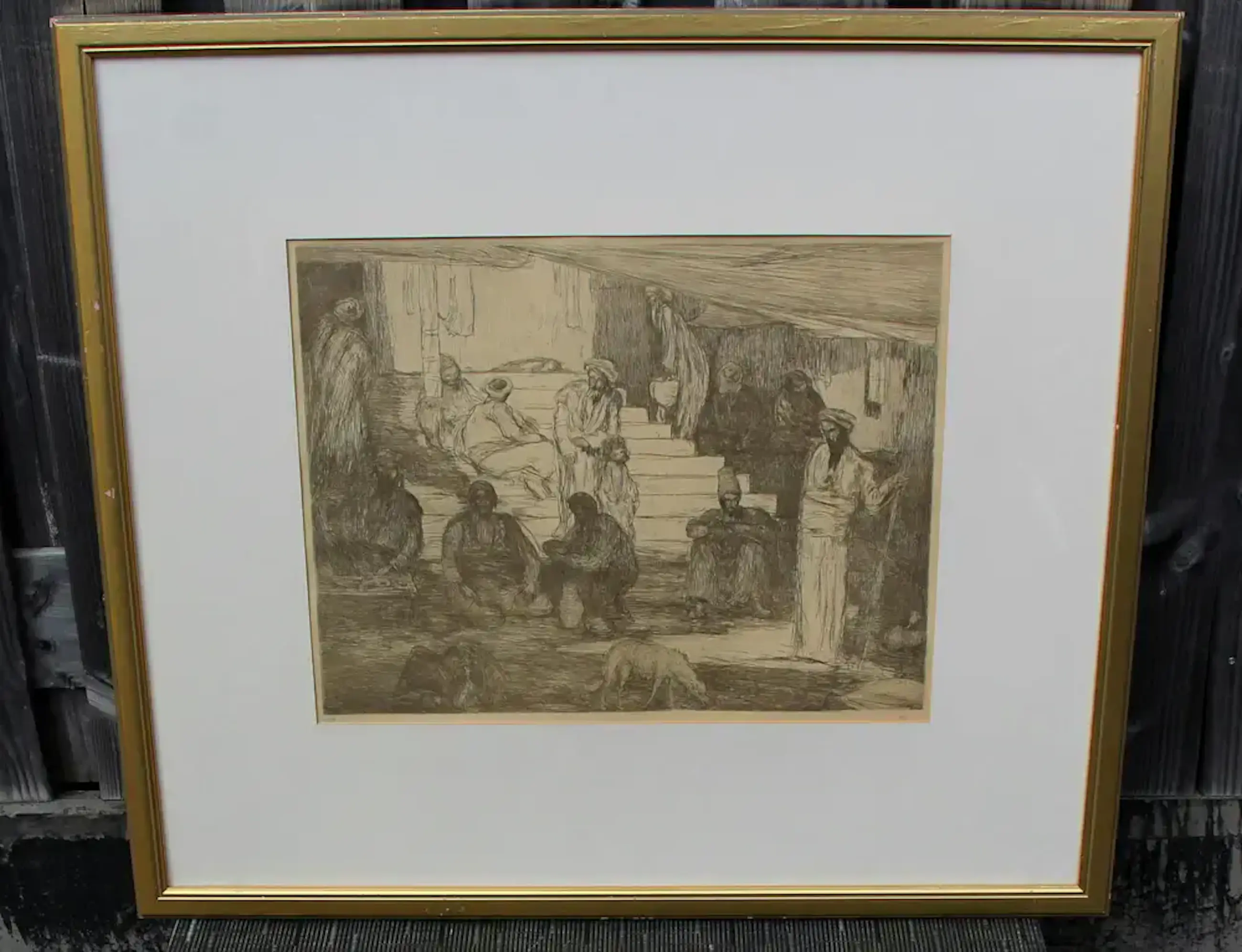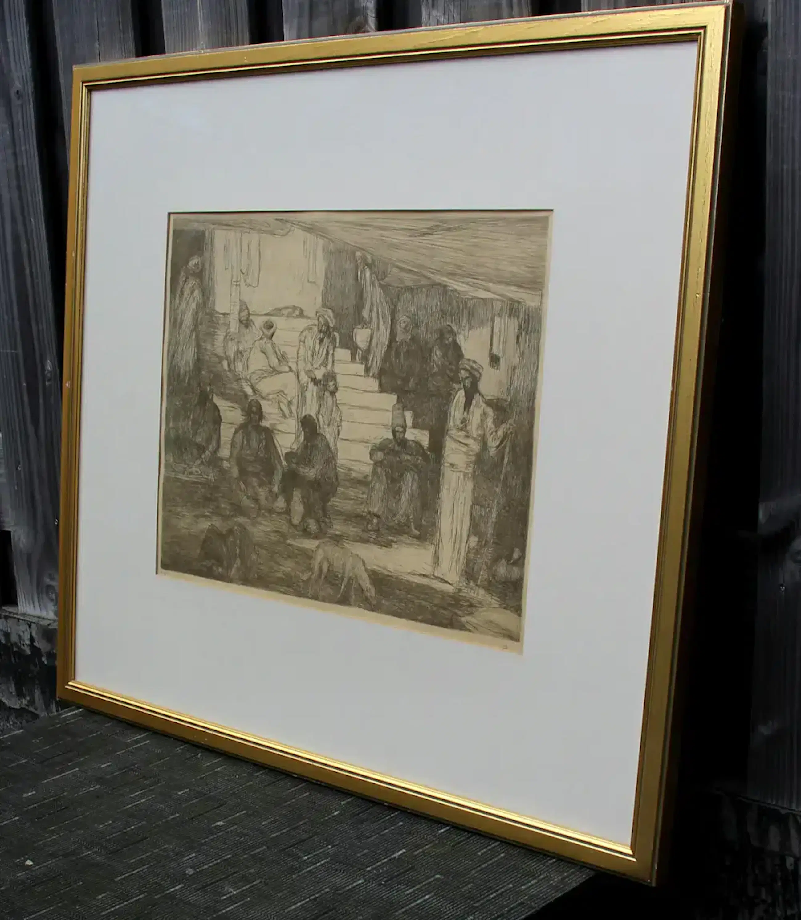 Ingelijste ets van Marius Bauer uit 1890. Titel: in Stamboel. Afmetingen incl lijst: H84,5 x b74,5cm. Afmetingen voorstelling: H39 x b50cm. Het werk is, rechts onderaan, gesigneerd door de kunstenaar en linksonder genummerd: no54 (totale oplage 100 stuks). De authenticiteit van dit werk wordt volledig gegarandeerd. Een certificaat van echtheid kan, op aanvraag, worden gemaild.