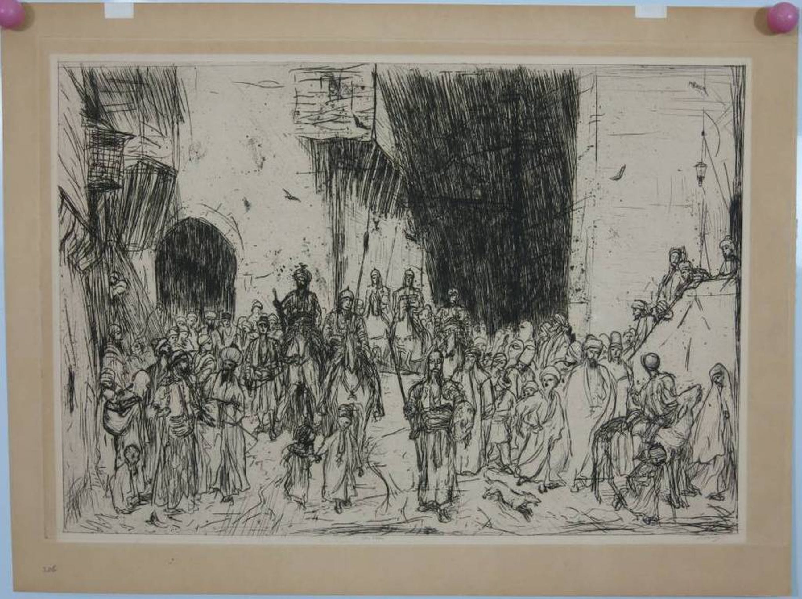 Het beeld is in perfecte heldere staat. In de bovenrand van het blad, buiten het beeld, zitten 2 kleine stukjes tape. En de randen van het blad zijn verkleurd, door eerdere inlijsting achter passe-partout (zie afbeelding). Ingelijst is dit niet/nauwelijks zichtbaar.
