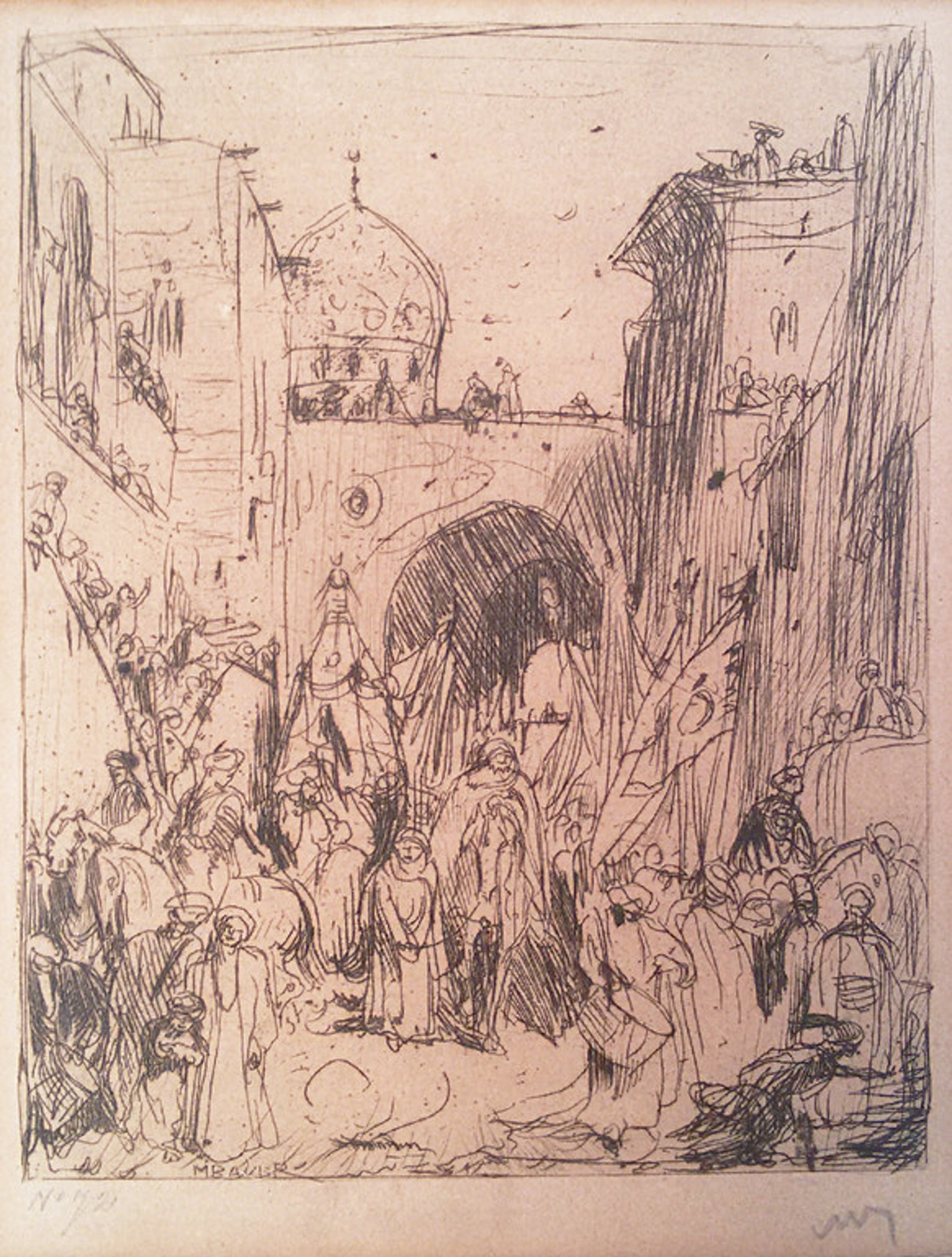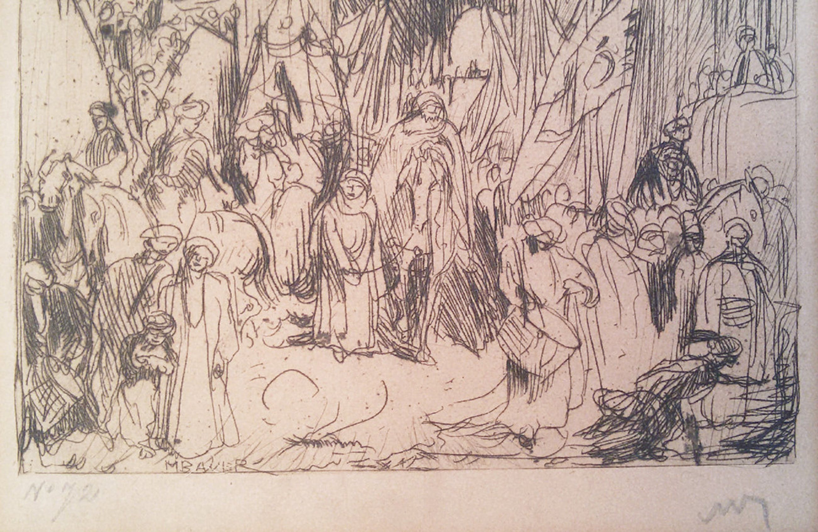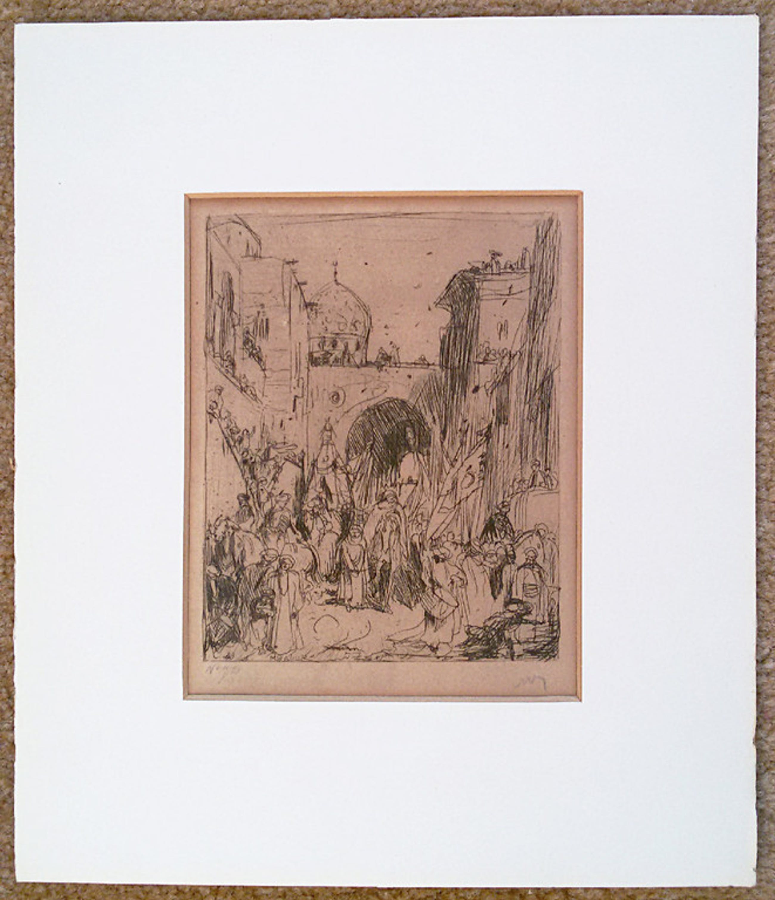 Kleine ets van Marius Bauer in passe-partout. Met potlood gesigneerd en genummerd “No. 72”. In goede conditie. Werk zit wel zeer solide in passe-partout en de ets zelf is logischerwijs vergeeld.