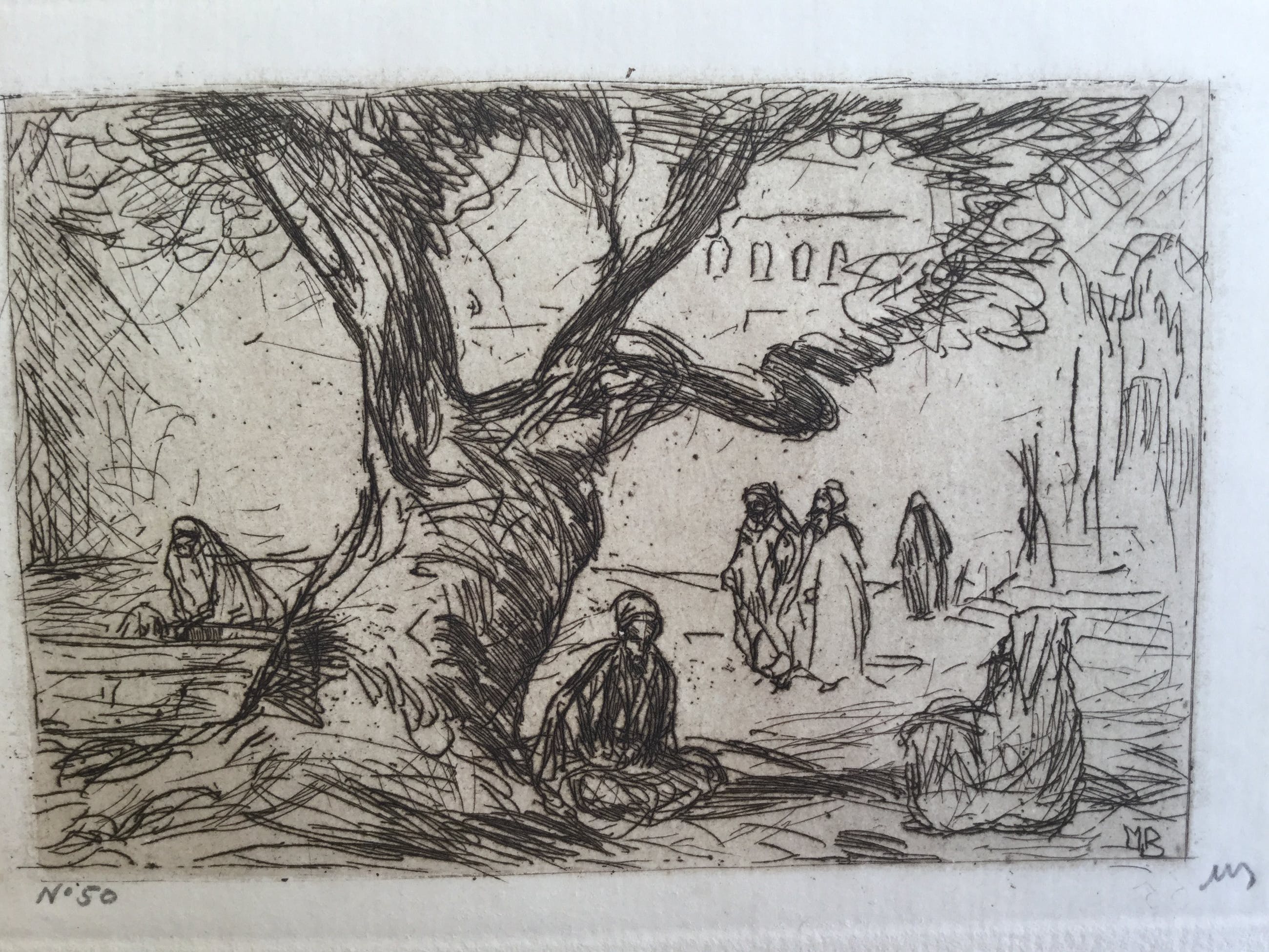 Fraaie ets van een mensen onder een boom van Marius Bauer, gemaakt tijdens een van zijn reizen naar het (verre) oosten. Hand gesigneerd.