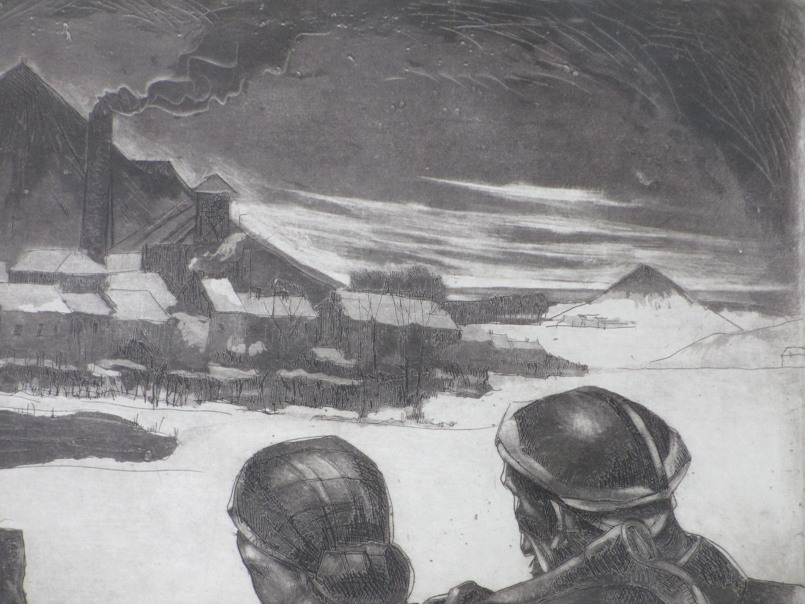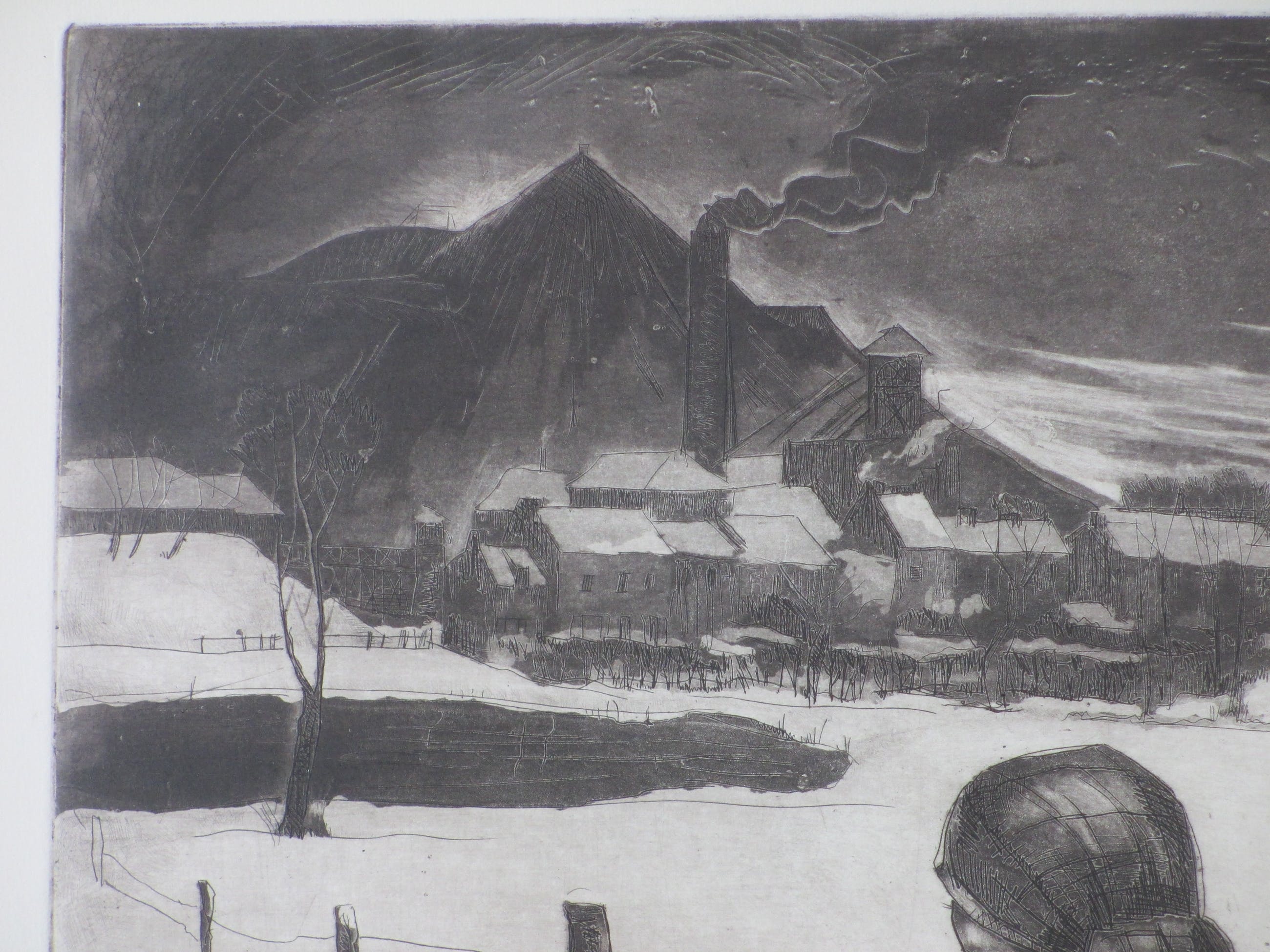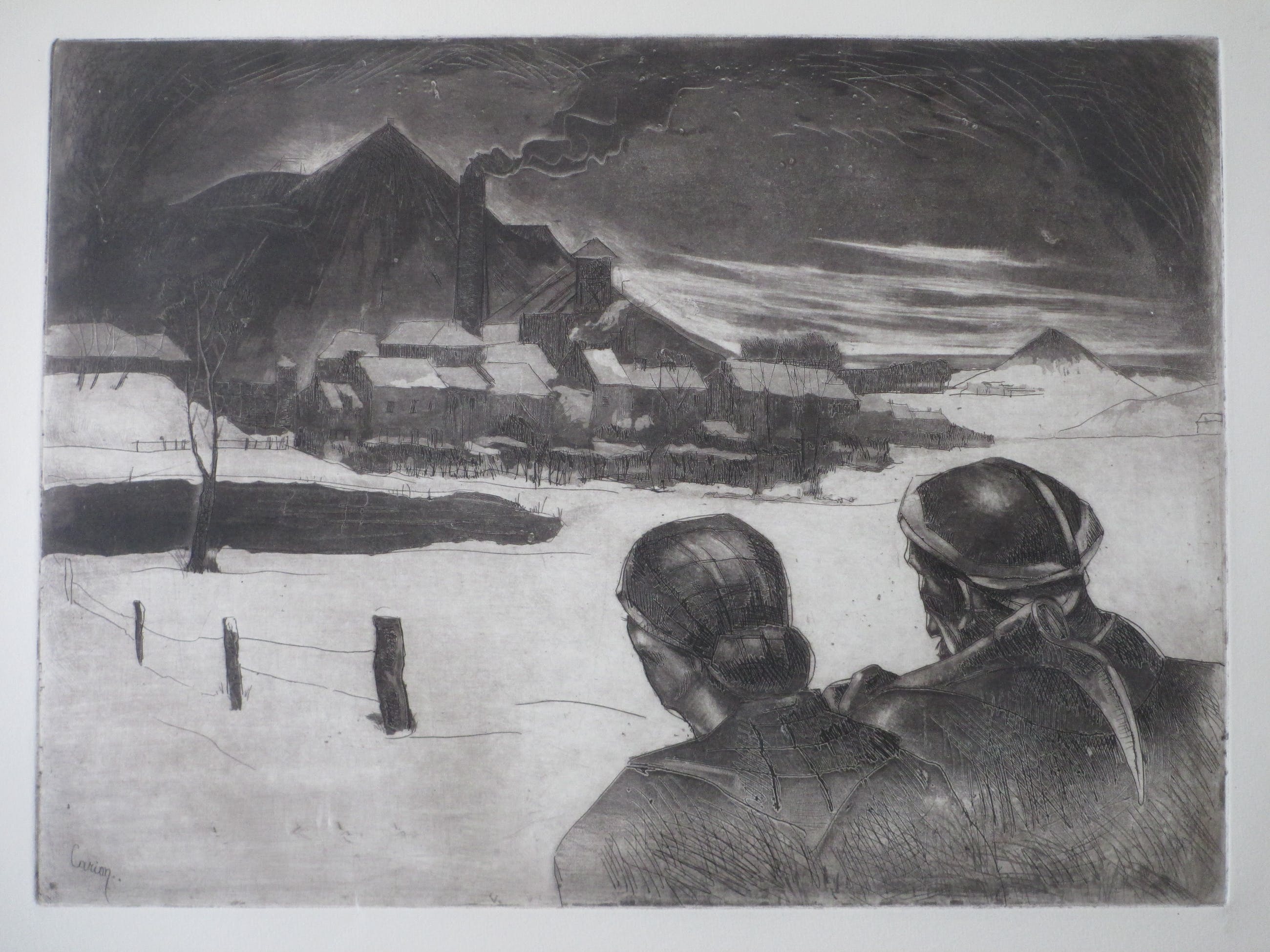Ets door Marius Carion Voorstelling van winter in de Borinage, met een mijnwerkerskoppel, starend naar de kolenmijn. Losbladig, beeldmaat 29x39, bladmaat 41x50 Gesigneerd l.o. in de druk 'Carion' Authenticiteit volledig gegarandeerd