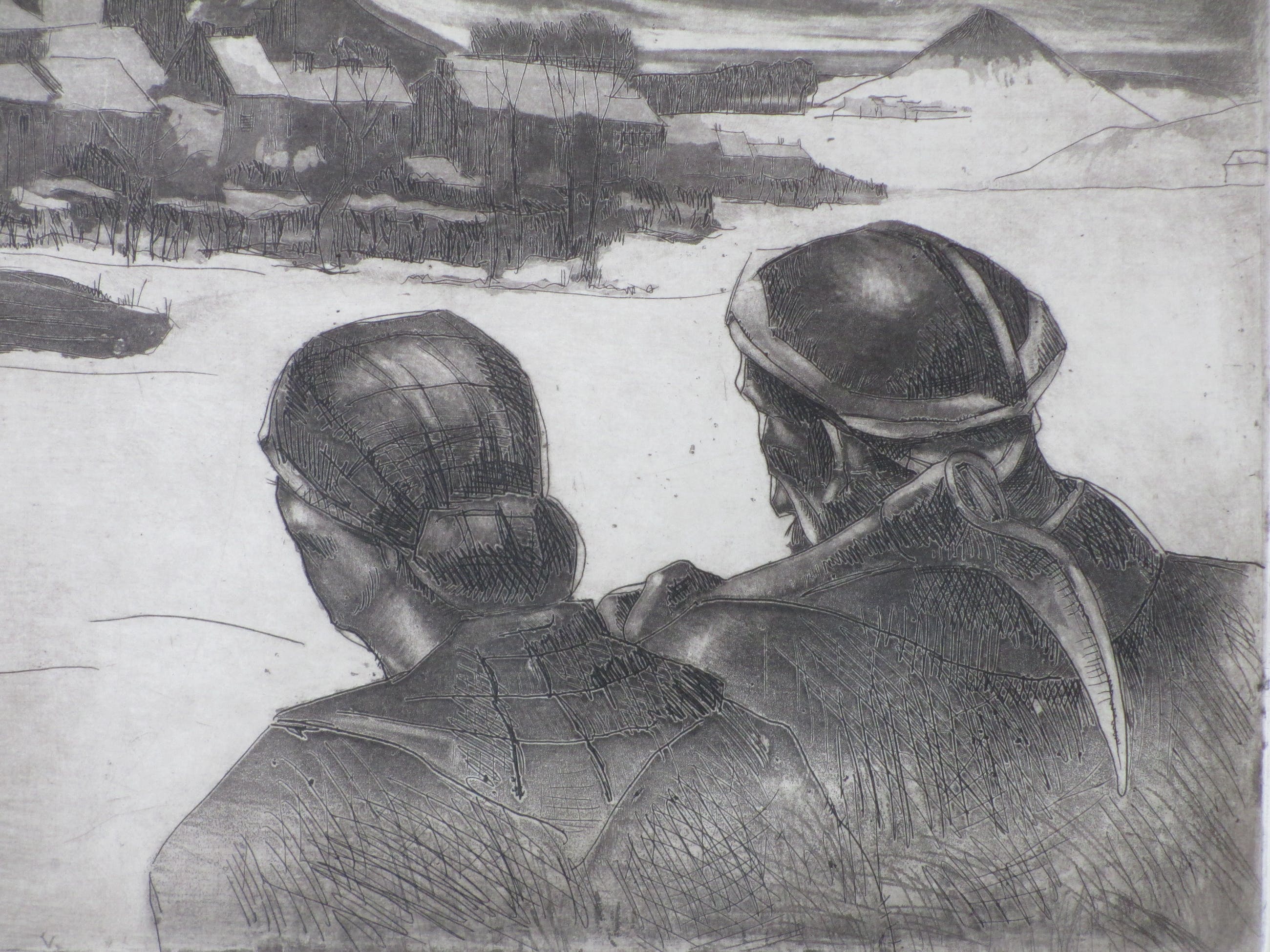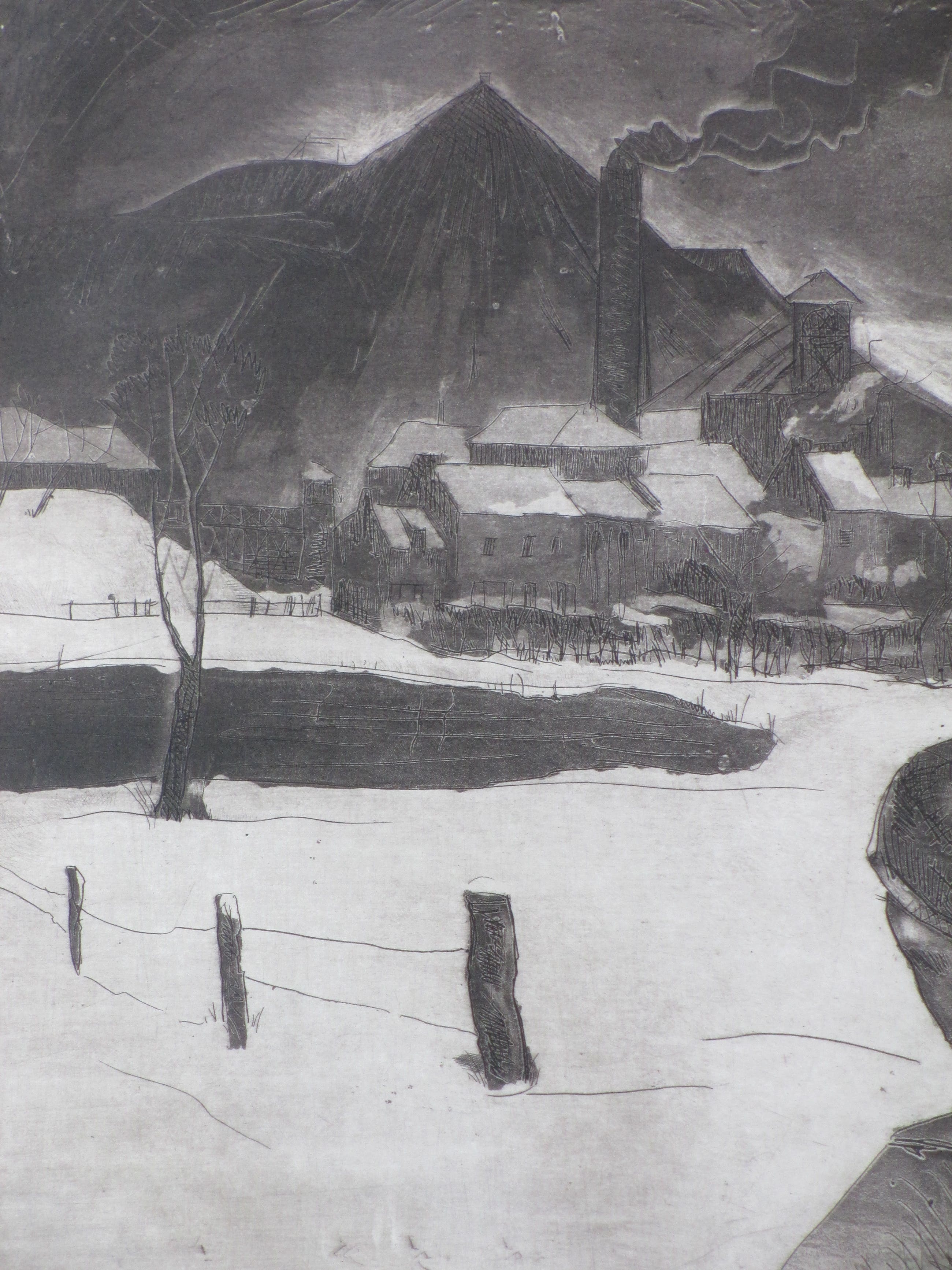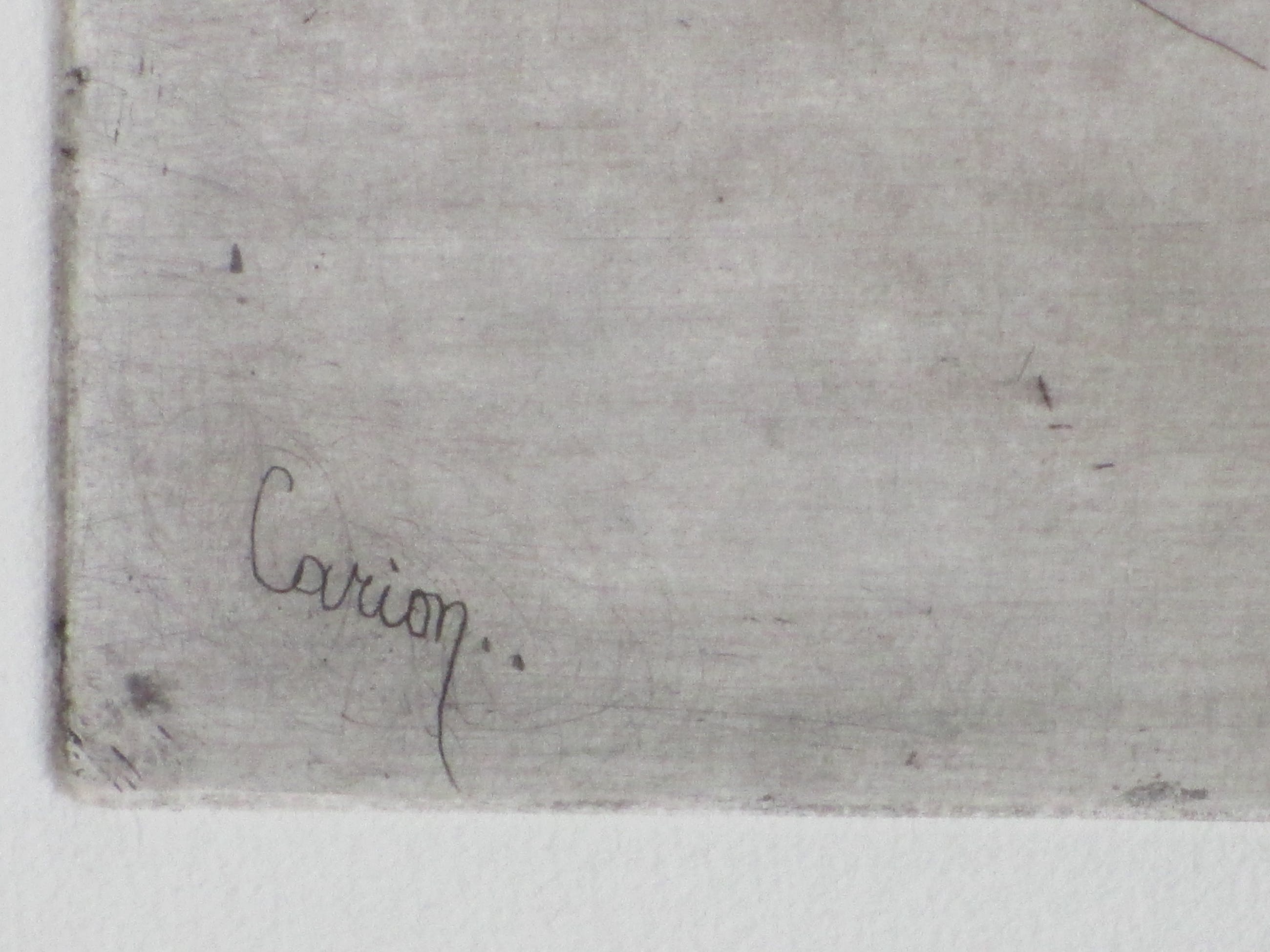 Ets door Marius Carion Voorstelling van winter in de Borinage, met een mijnwerkerskoppel, starend naar de kolenmijn. Losbladig, beeldmaat 29x39, bladmaat 41x50 Gesigneerd l.o. in de druk 'Carion' Authenticiteit volledig gegarandeerd
