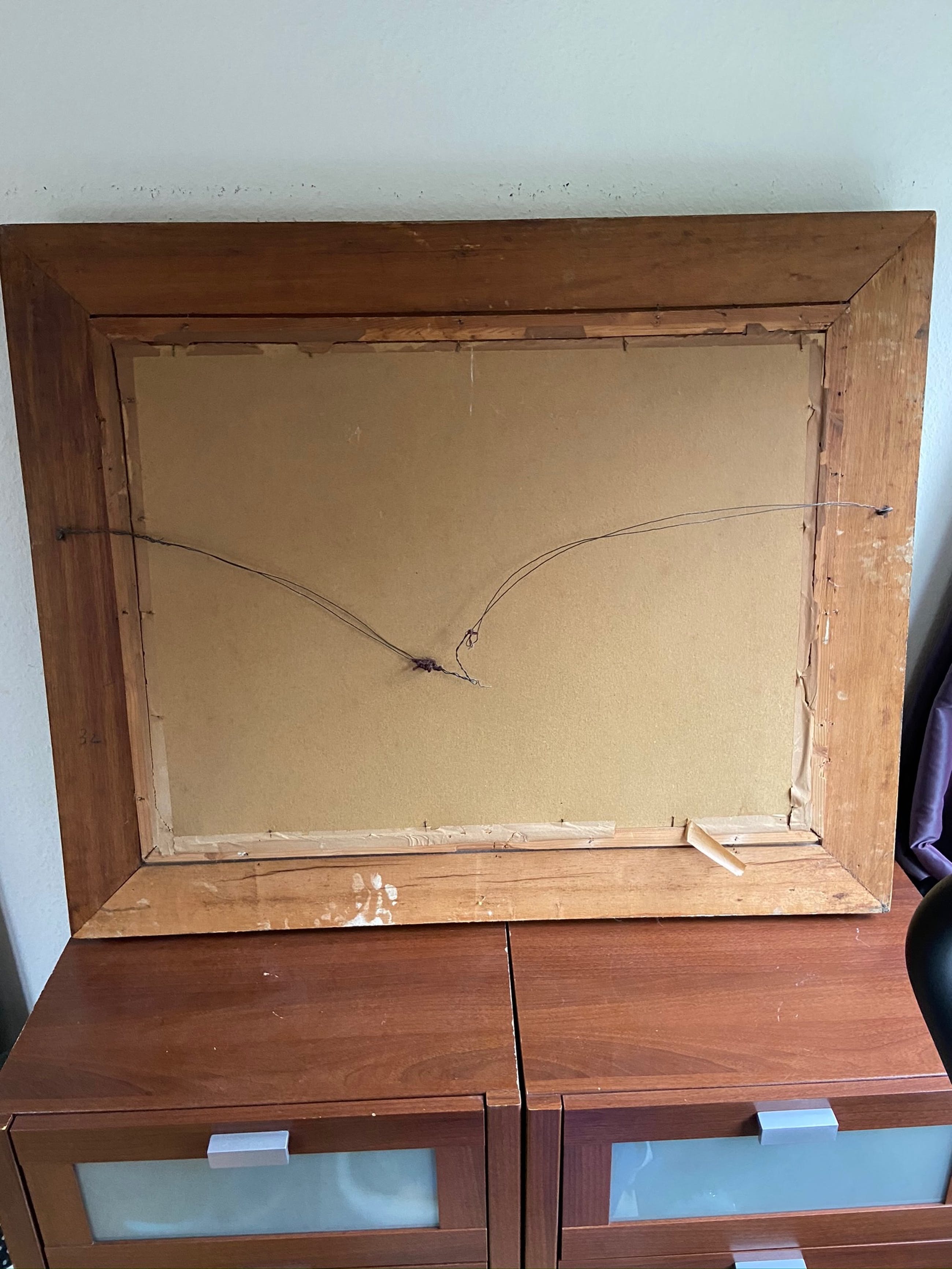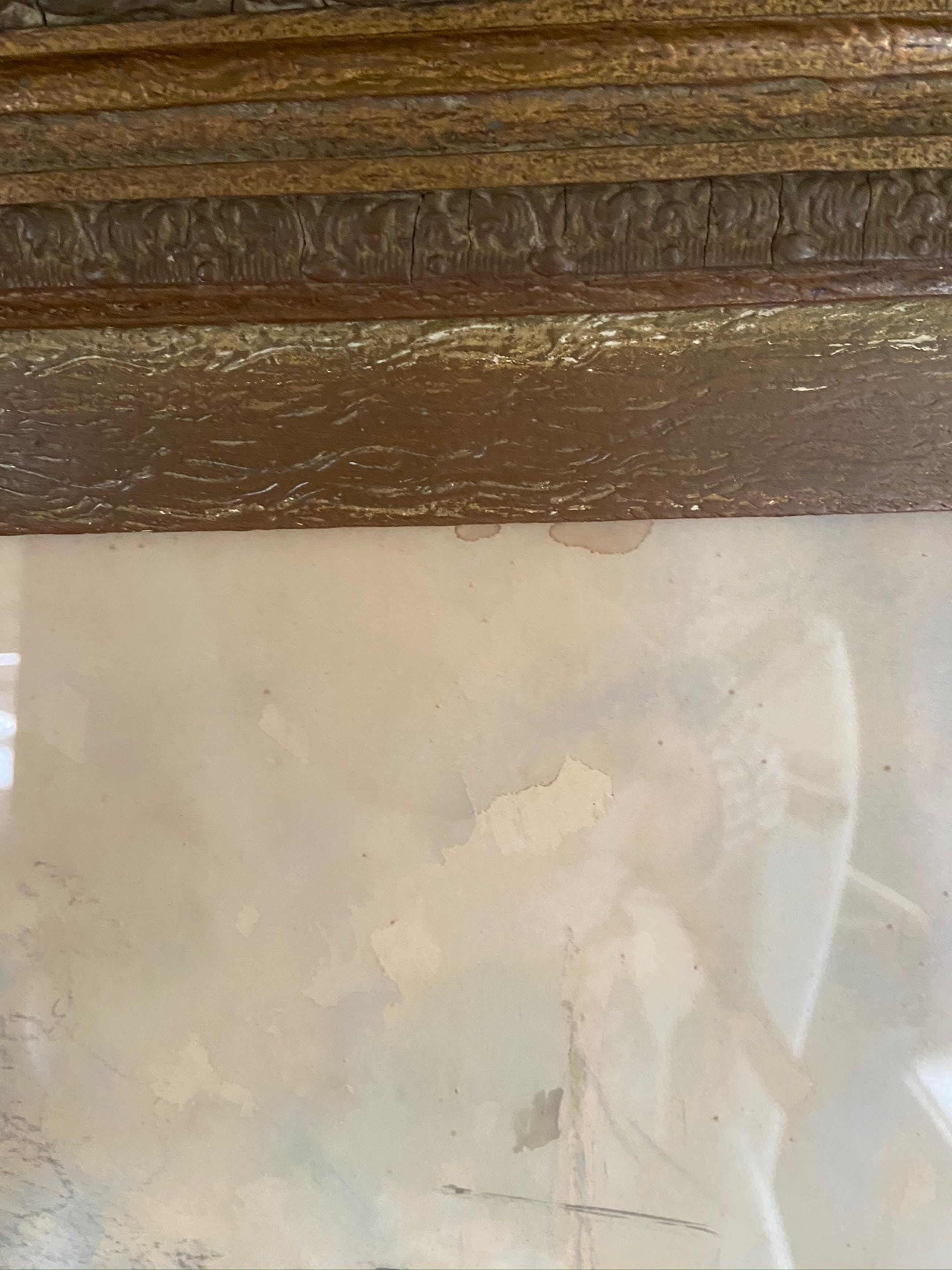 Schilderij achter glas. Klein plekje bovenaan schilderij, zie ook een foto daarvoor. Verder in goede conditie