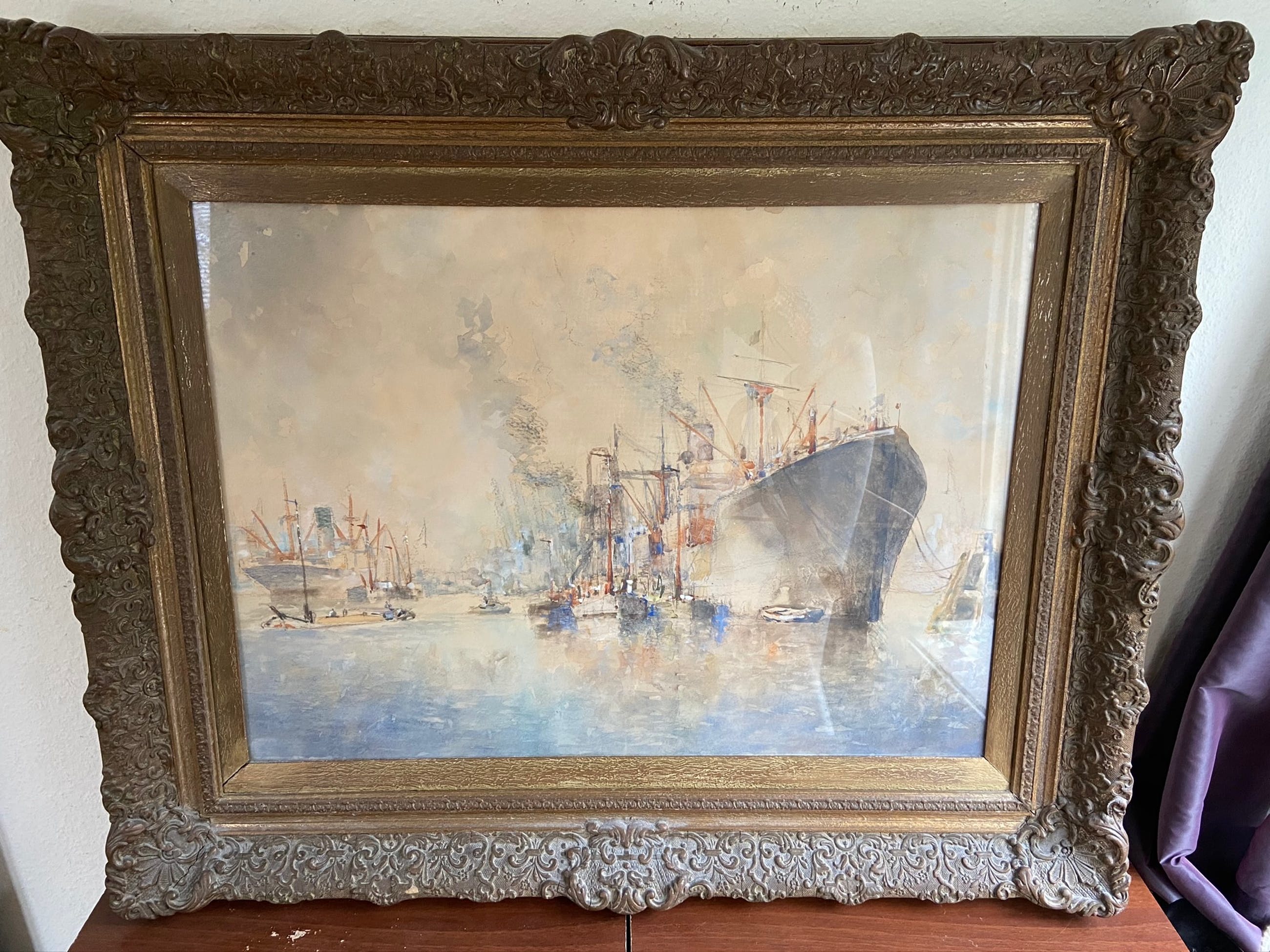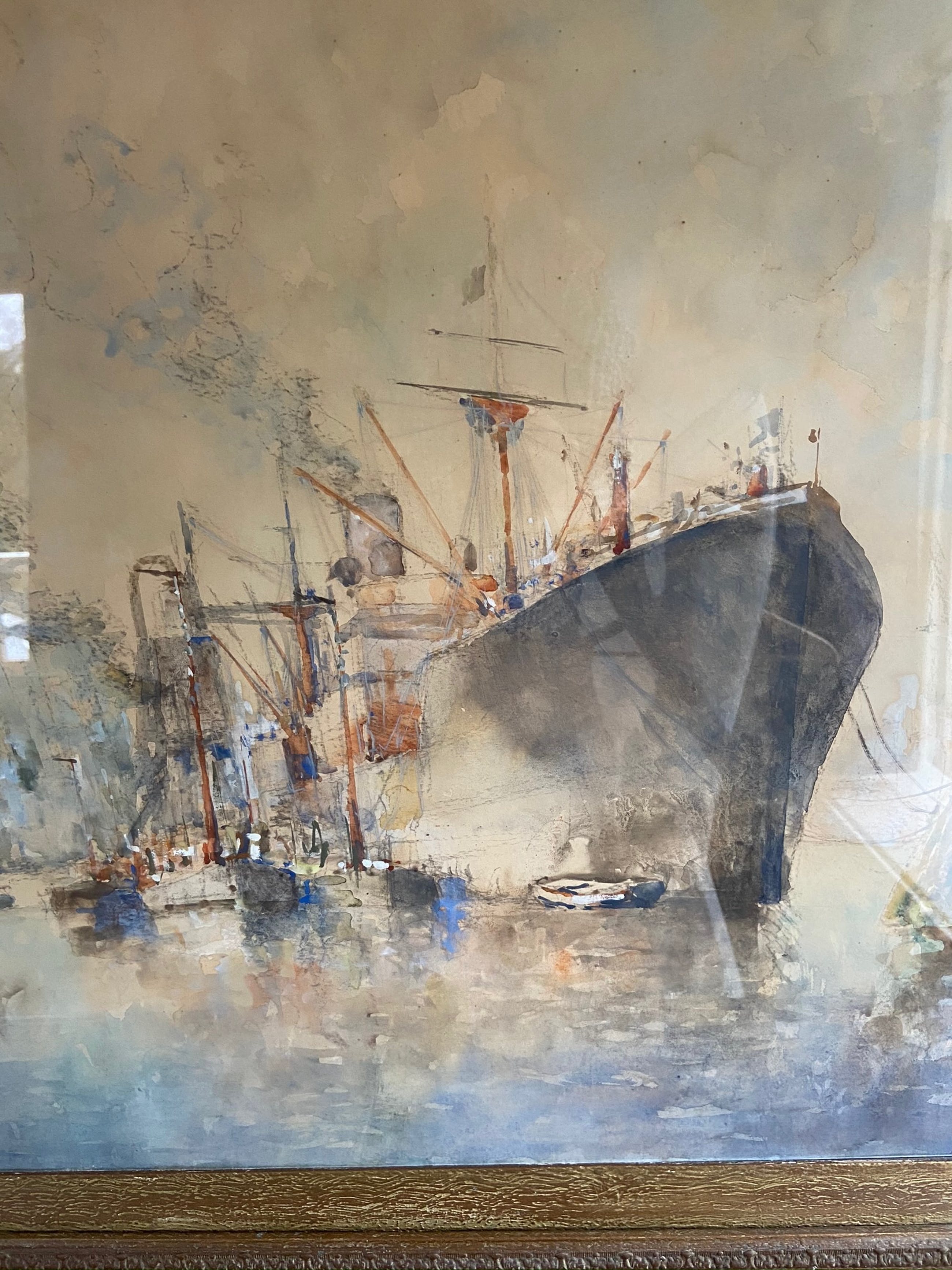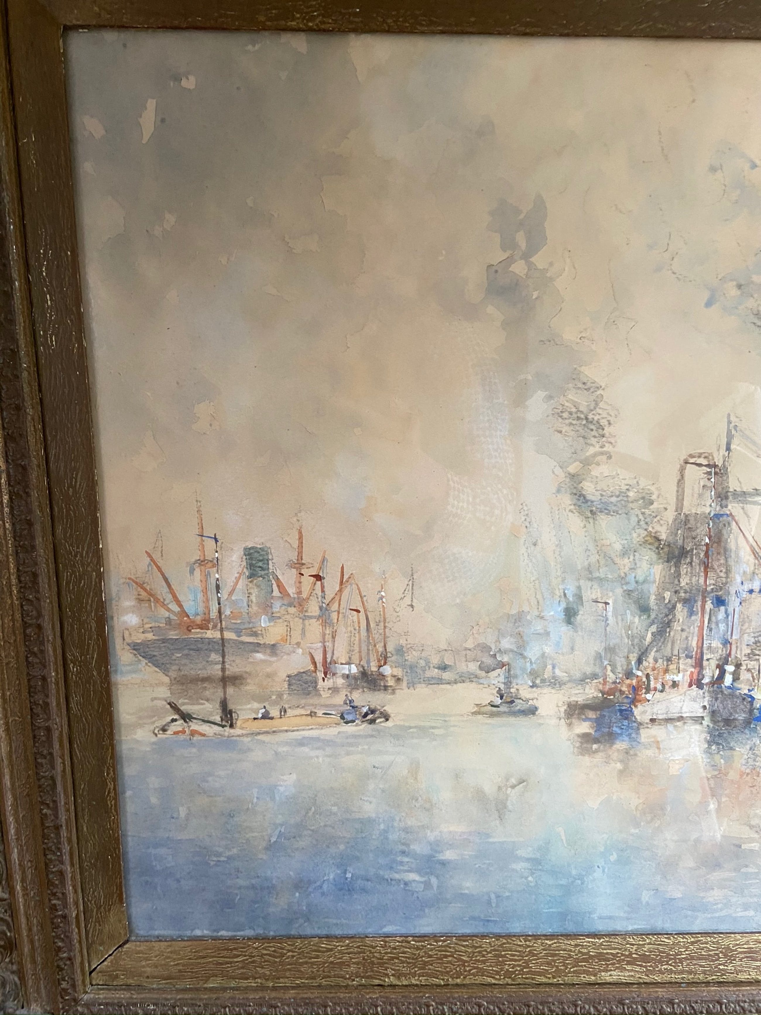 Havengezicht Rotterdam met laden/lossen van vrachtschepen. Kenmerkend voor het werk van de Jongere in die periode (rond de oorlog). Een oom van mij heeft het in de oorlog van de Jongere gekocht.