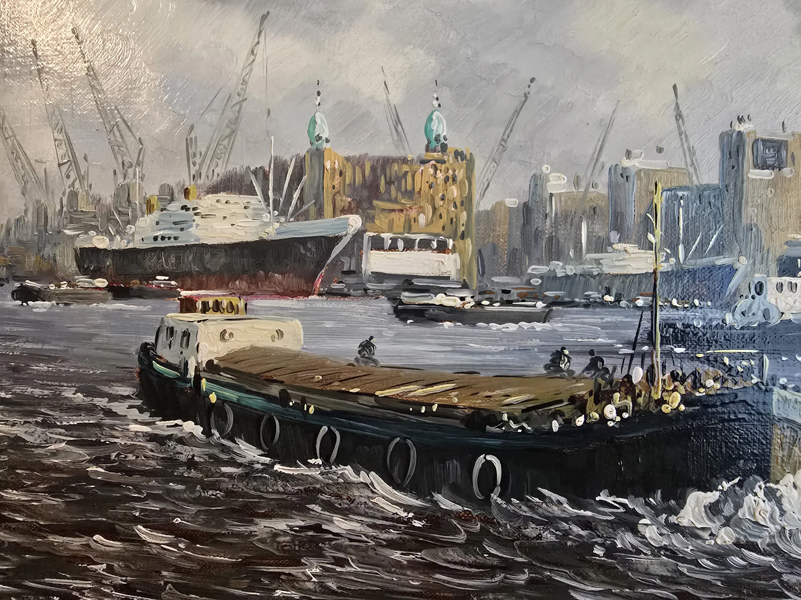 Prachtig schilderij van een havenzicht in Rotterdam. Het schilderij toont schepen en bedrijvigheid in de haven. De stijl suggereert een realistische weergave van het havenleven. Een mooie toevoeging voor de liefhebber van maritieme kunst en Rotterdamse historie.