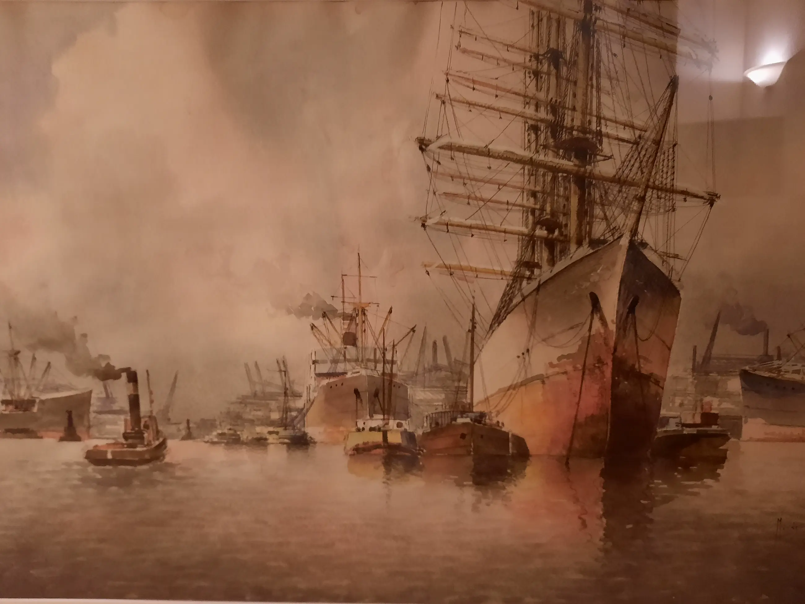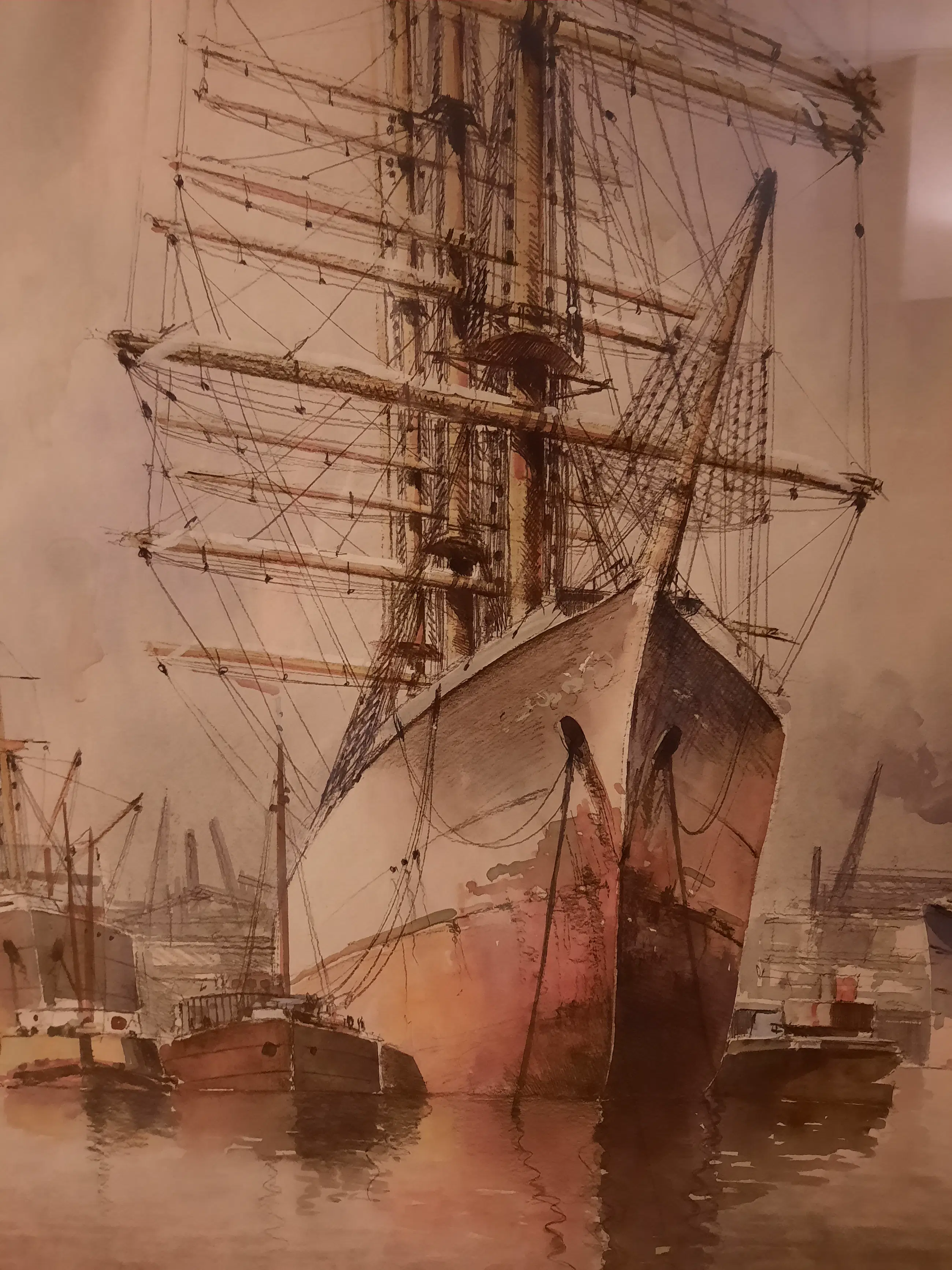 Rotterdamse haven met zeilschip 3 master en overige schepen in mooi overzicht. Techniek met realistische compositie en kleuren.