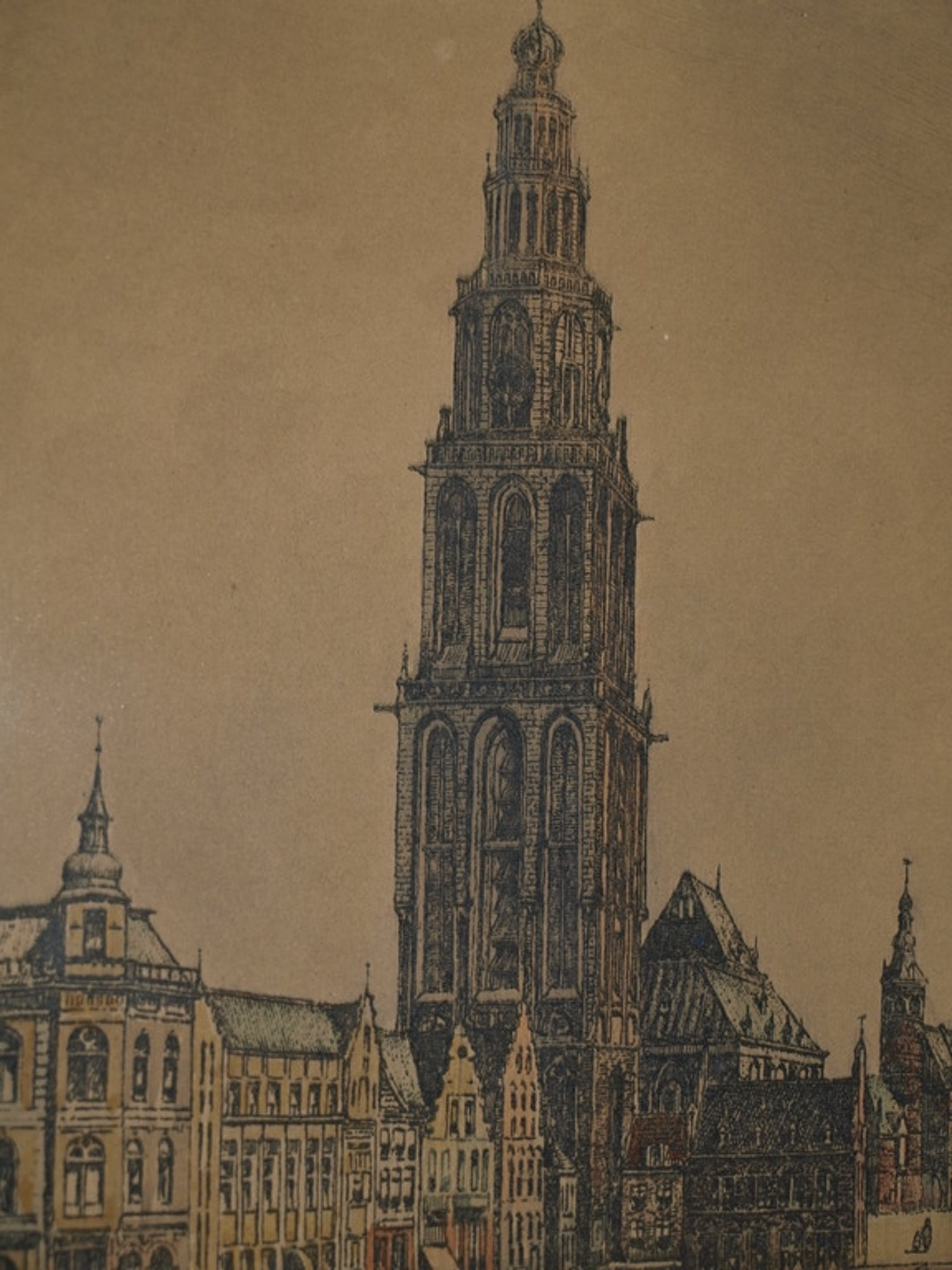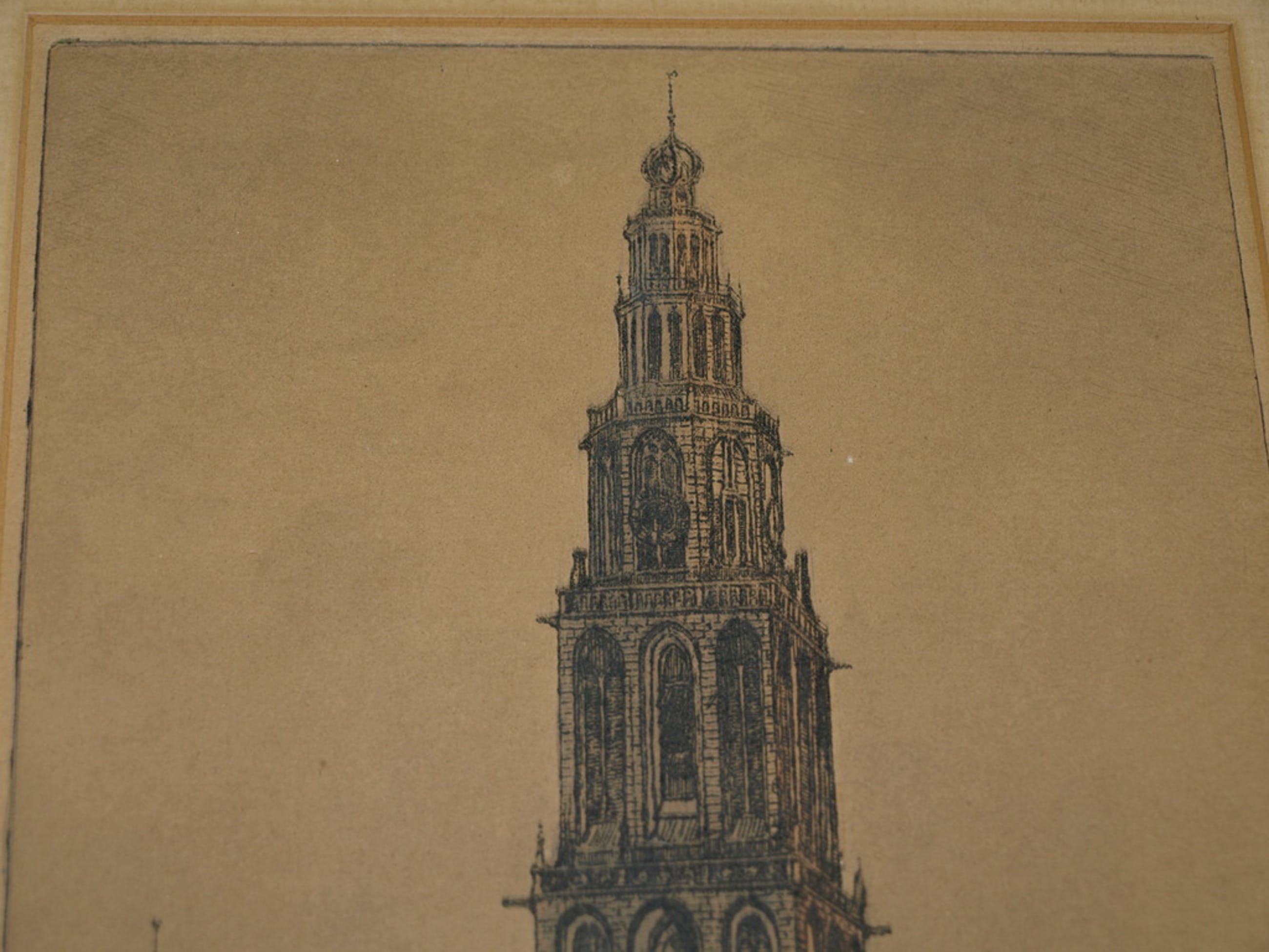 Een ets van de Rotterdamse kunstenaar Marius Janssen uit ca 1930 van de Martinitoren in Groningen.