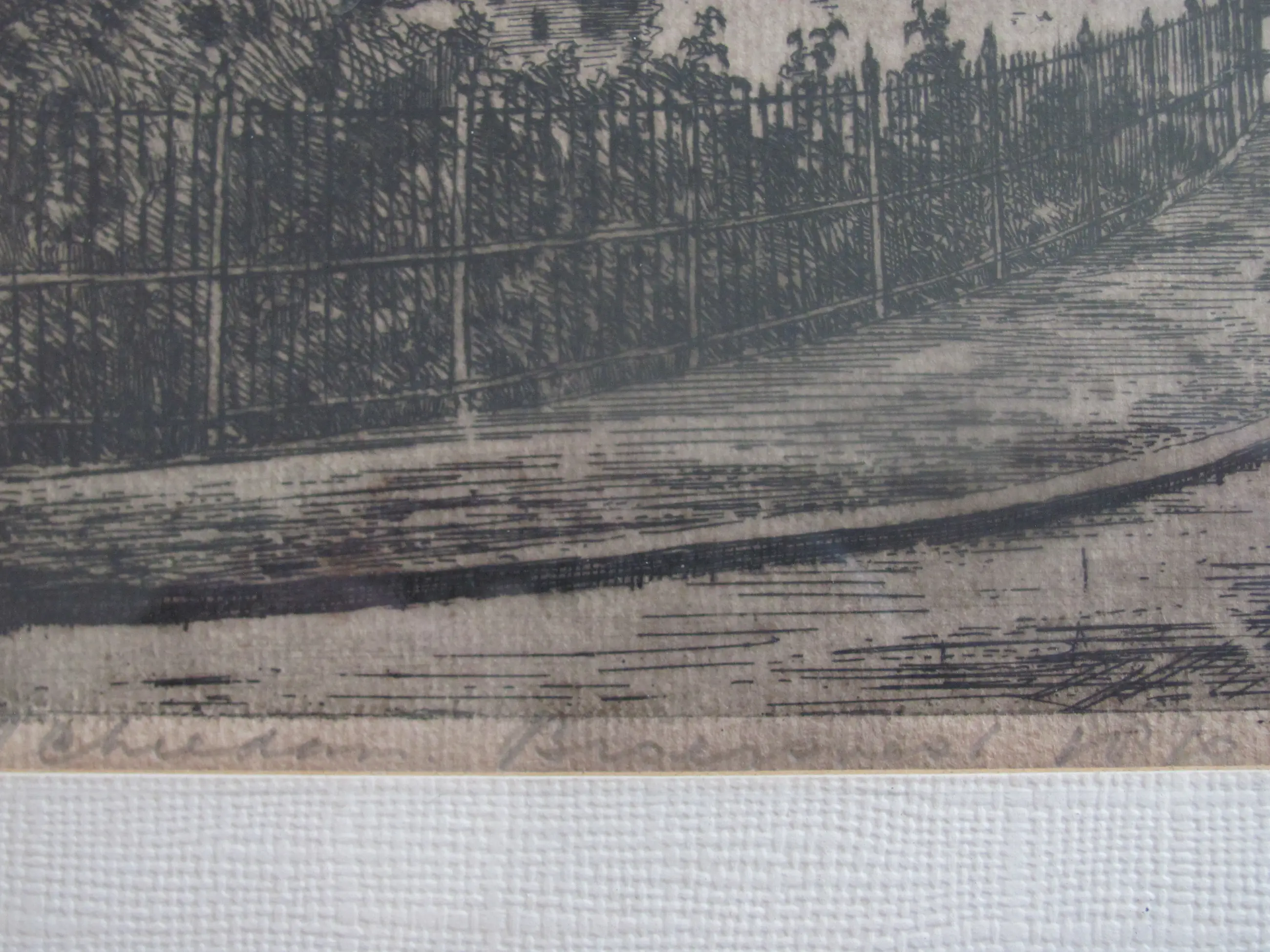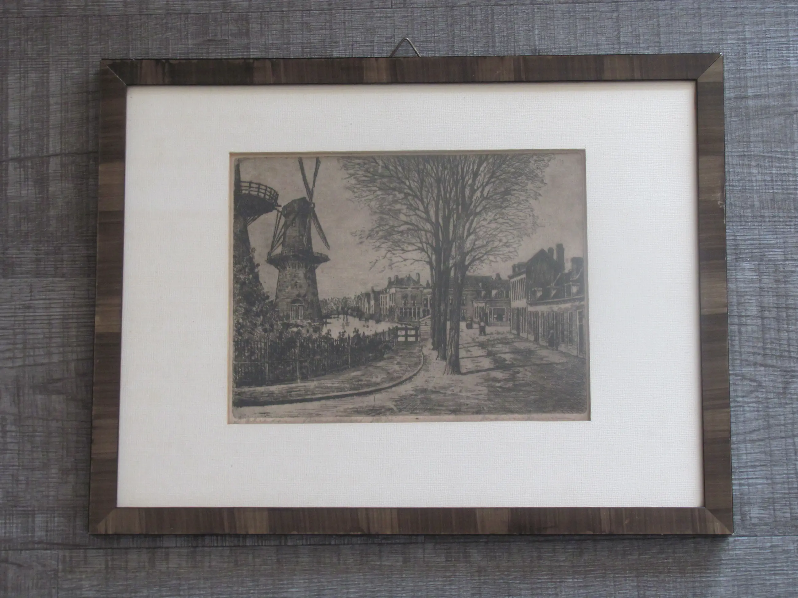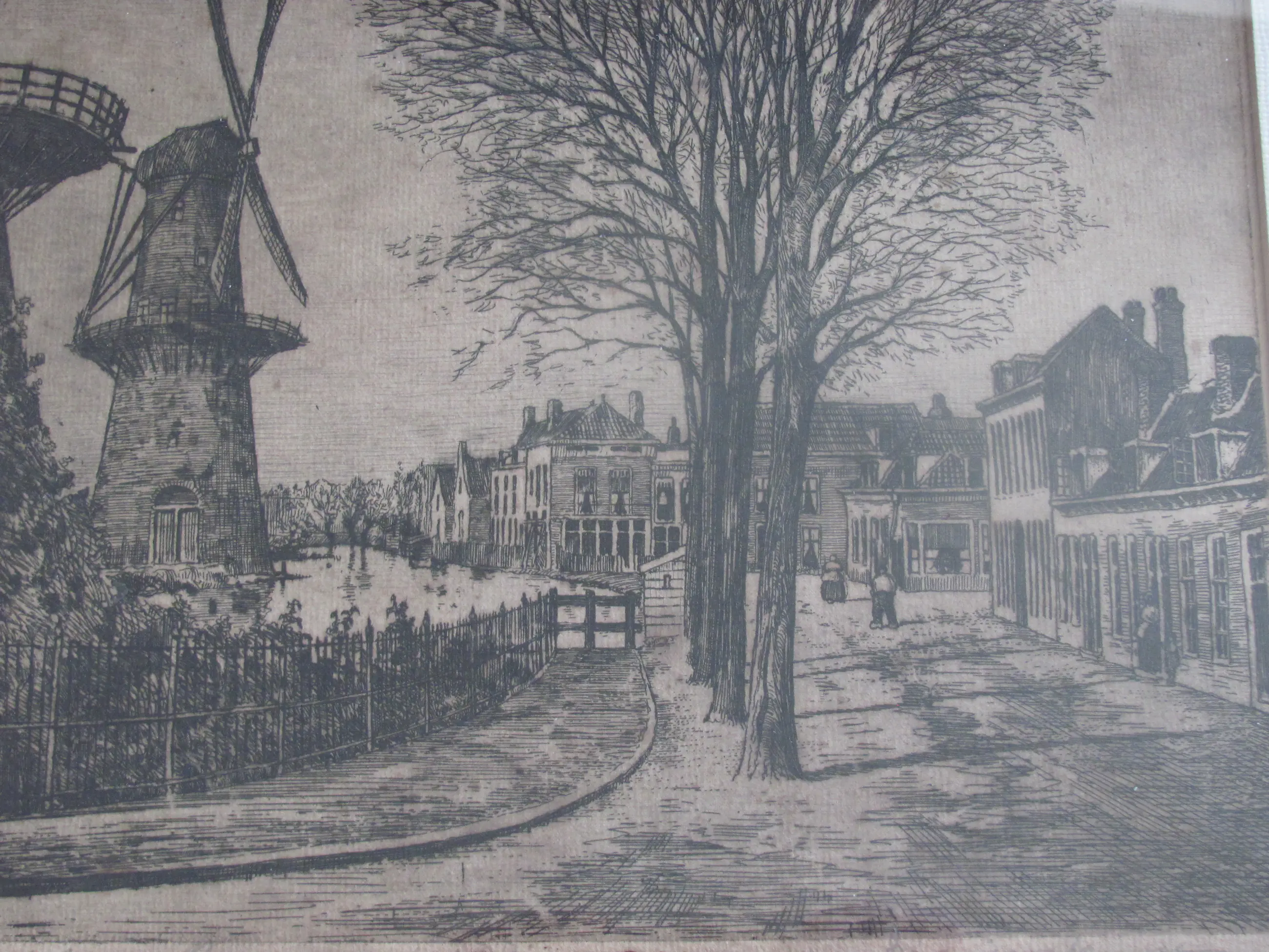 Ets van Marius Janssen. Rechtsonder met potlood gesigneerd. Linksonder met potlood getiteld (Schiedam, Broersvest, 1870). Deze ets toont een historische voorstelling van de Broersvest in Schiedam.