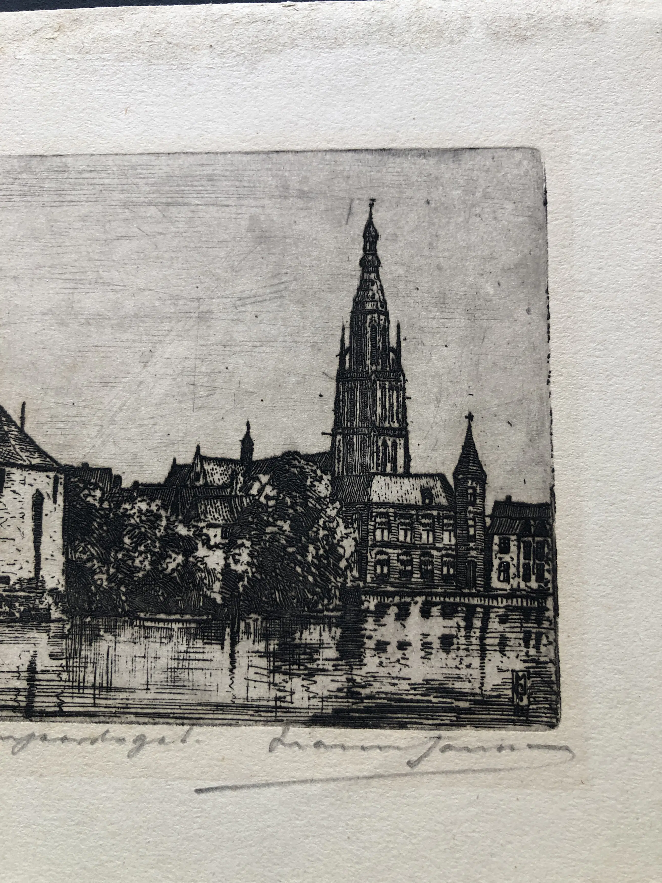 Een ets van Marius Janssen 185 - 1957 Handgesigneerd Titel : Sanjaardsgat Breda Niet gelijst Afmeting 15 x 19 cm In goede staat