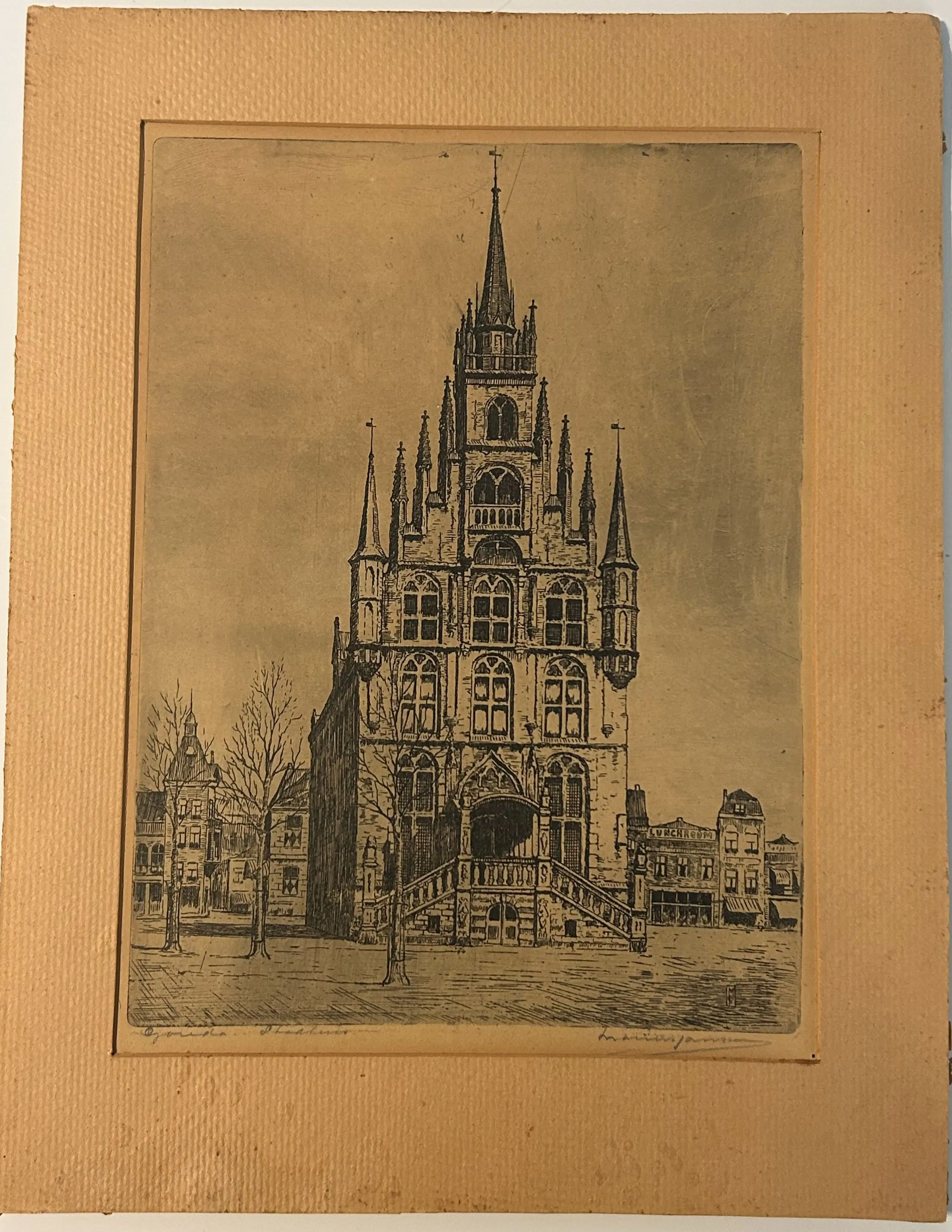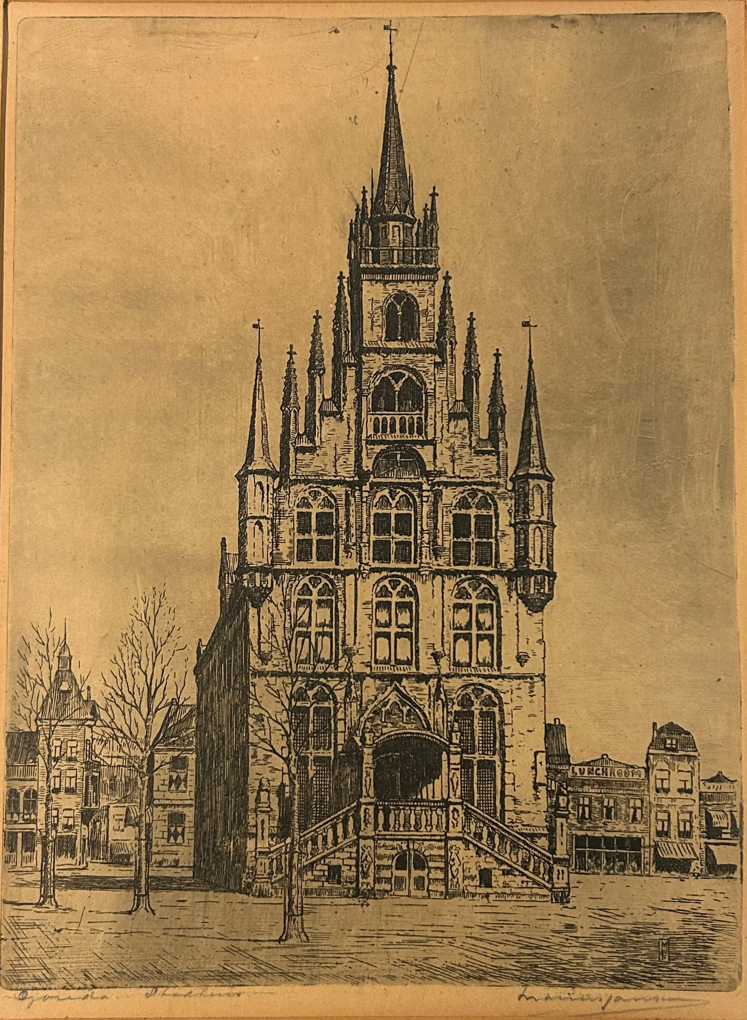 Ets van Marius Janssen – Stadhuis van Gouda Mooie en verfijnde ets met een voorstelling van het stadhuis van Gouda. Het werk zit in een passe-partout, die lichte gebruikssporen vertoont. De ets zelf ziet er netjes en verzorgd uit. Zie foto’s voor meer details en een goede indruk van de staat.