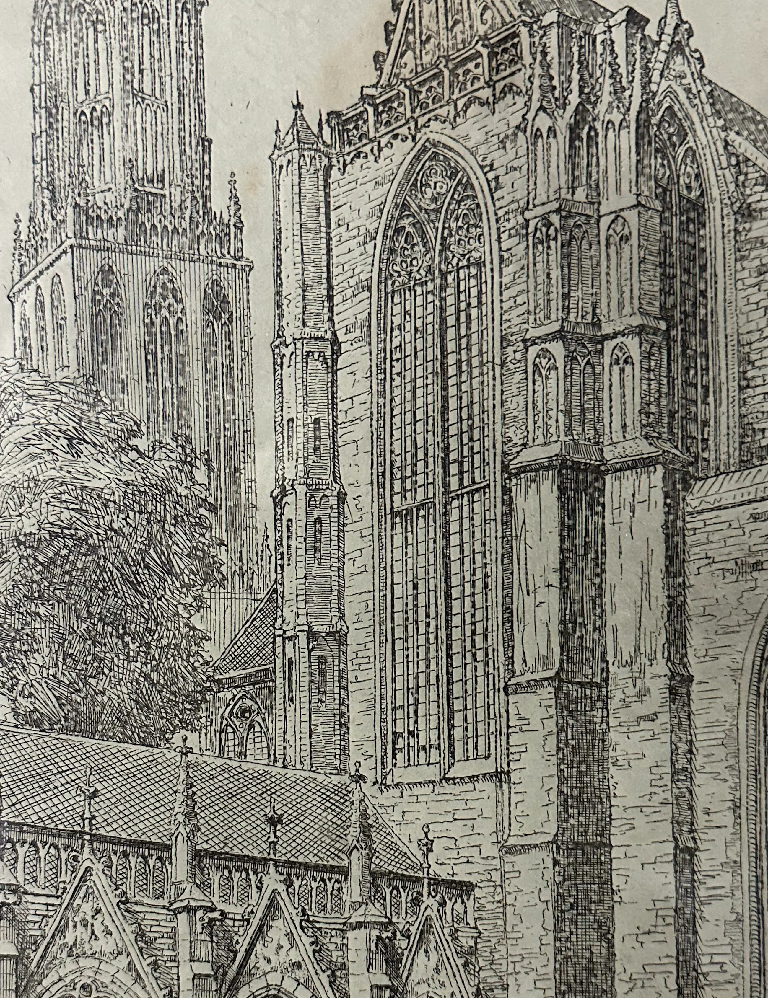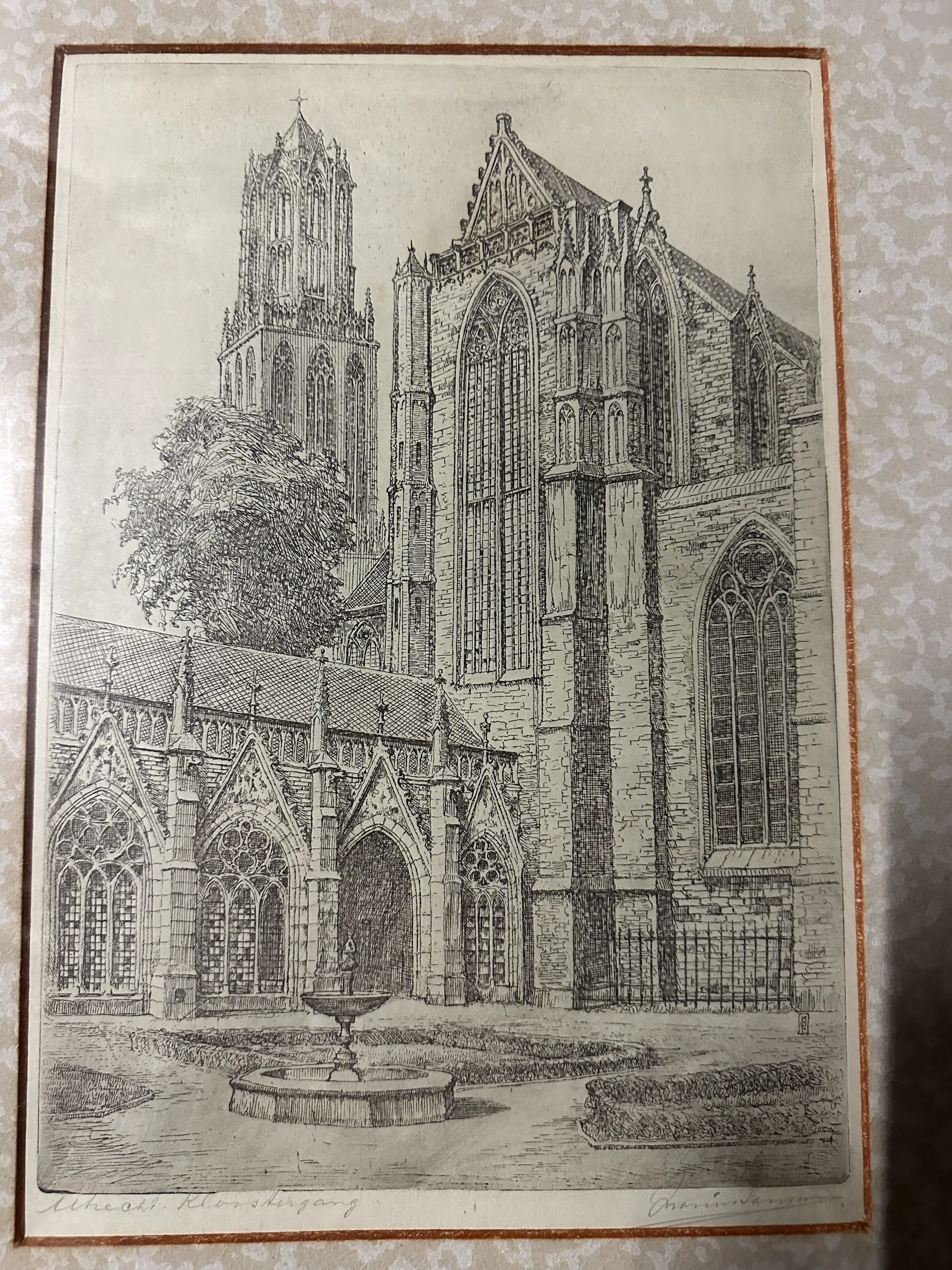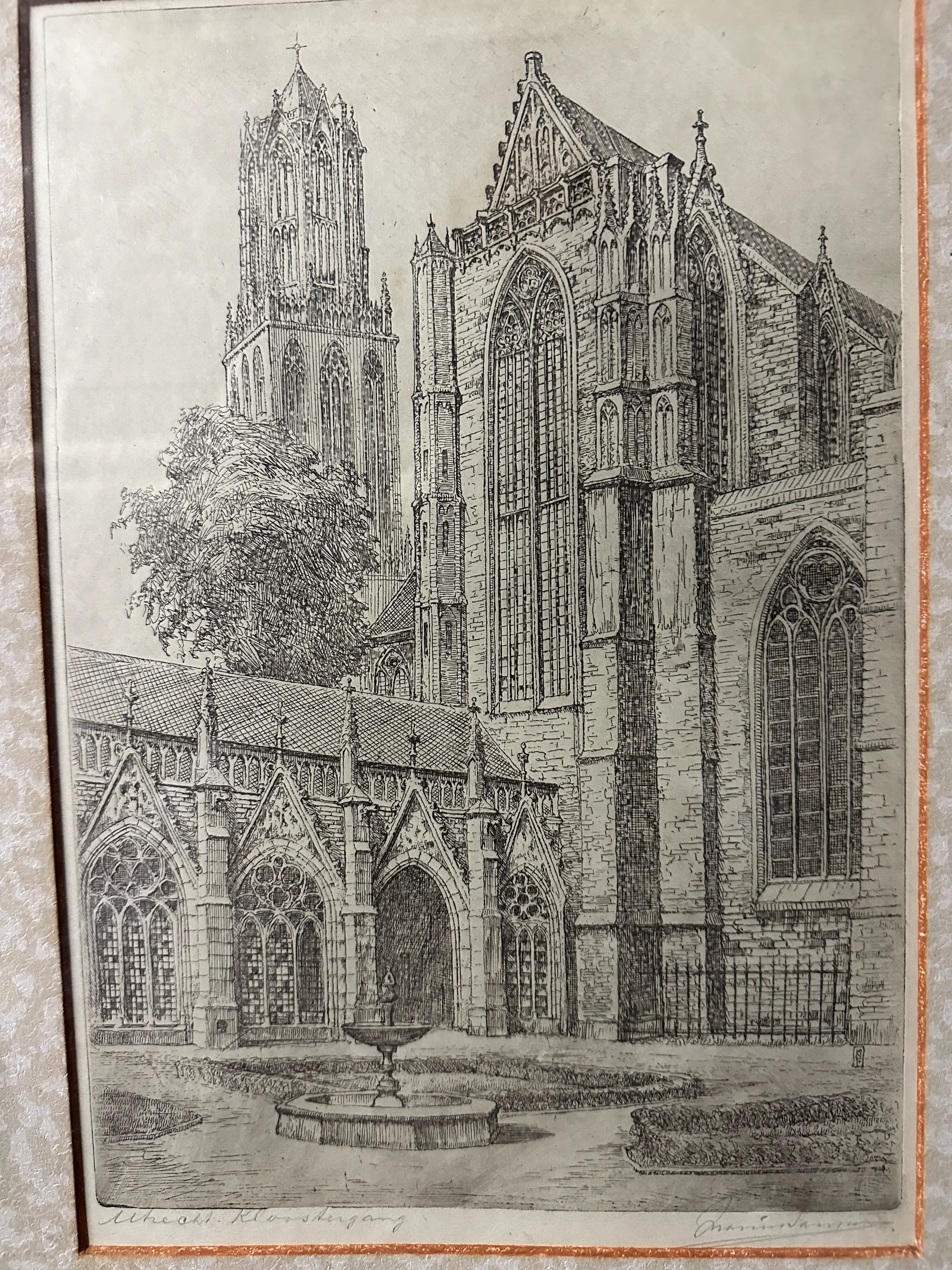 Dit honderd jaar oude werk van Marius Janssen toont de Kloostergang in Utrecht met de herkenbare Domtoren op de achtergrond