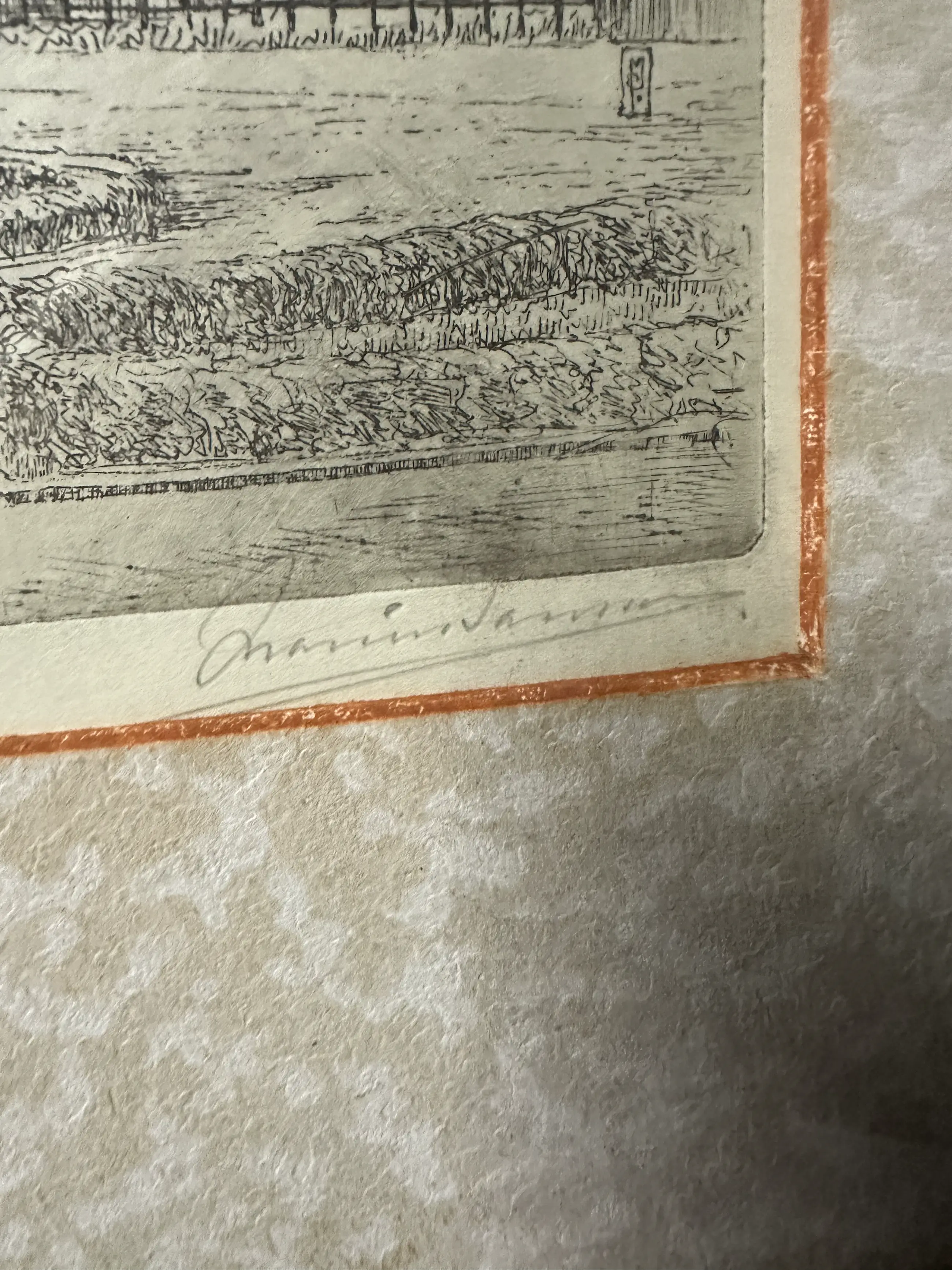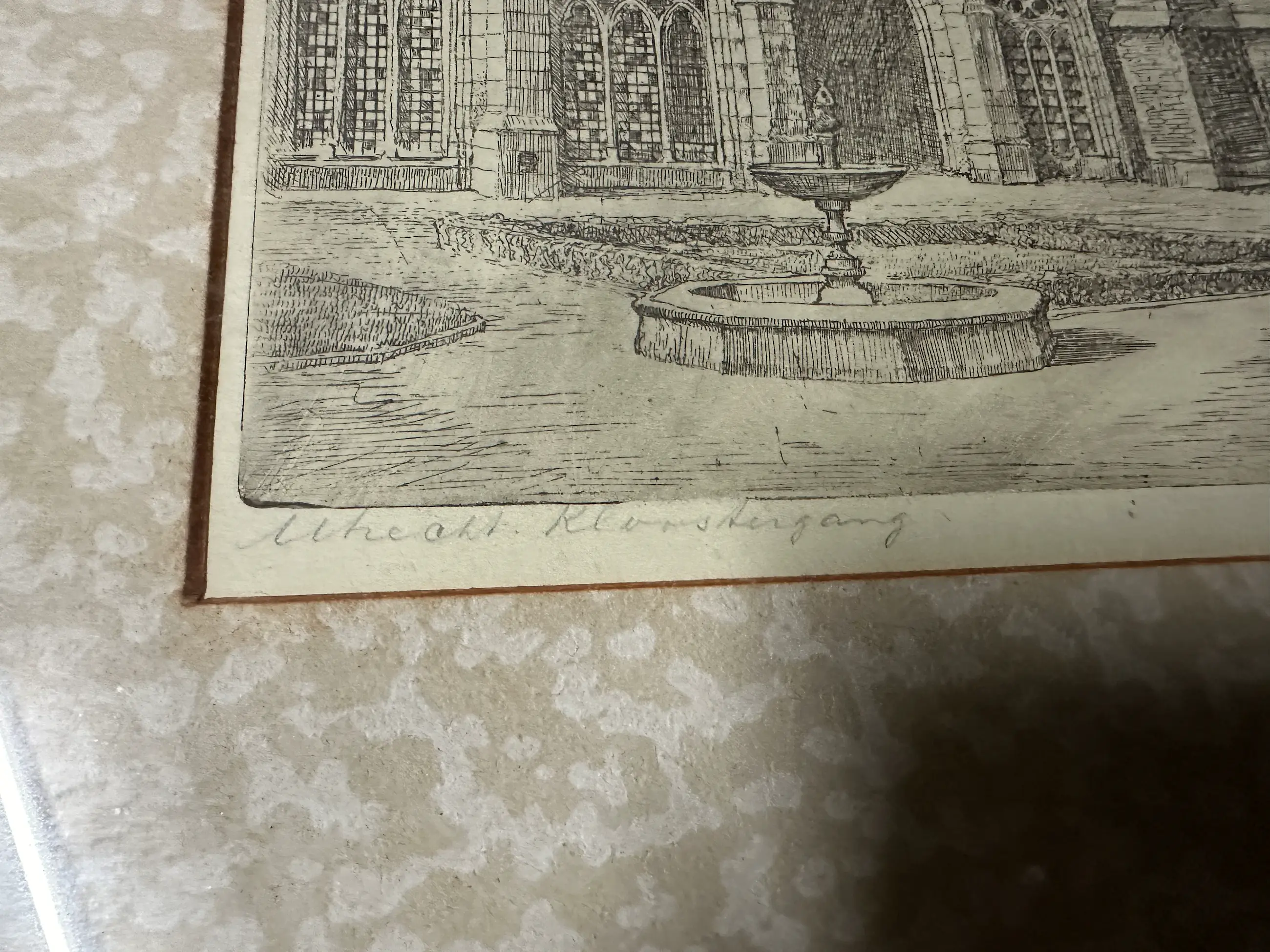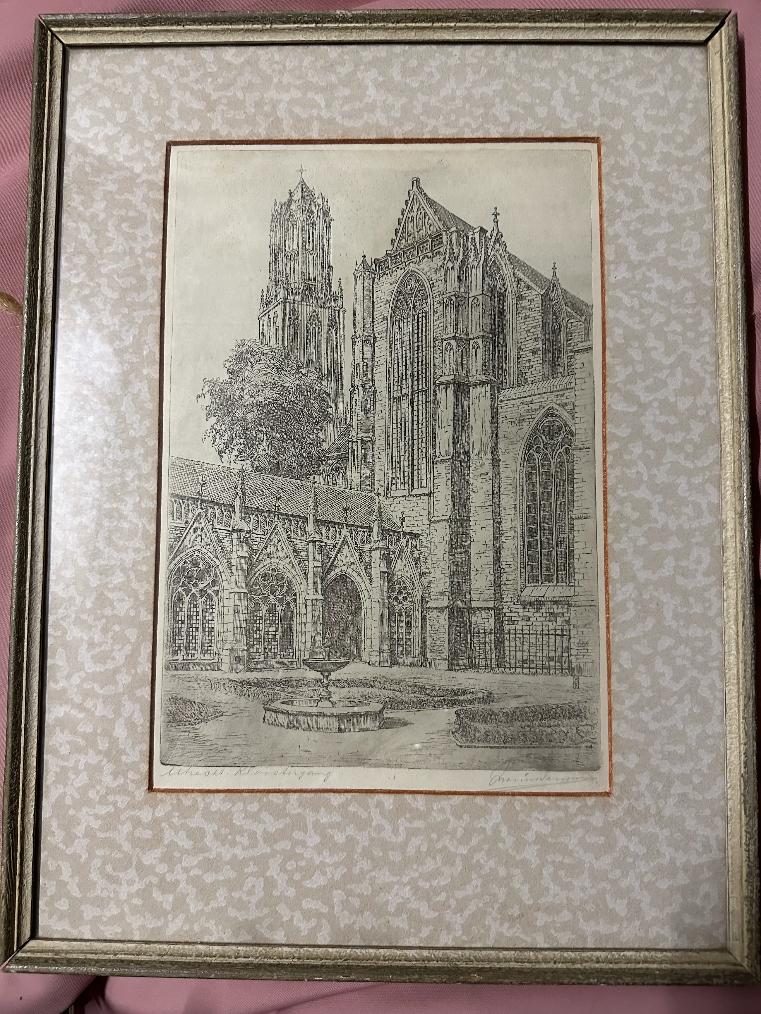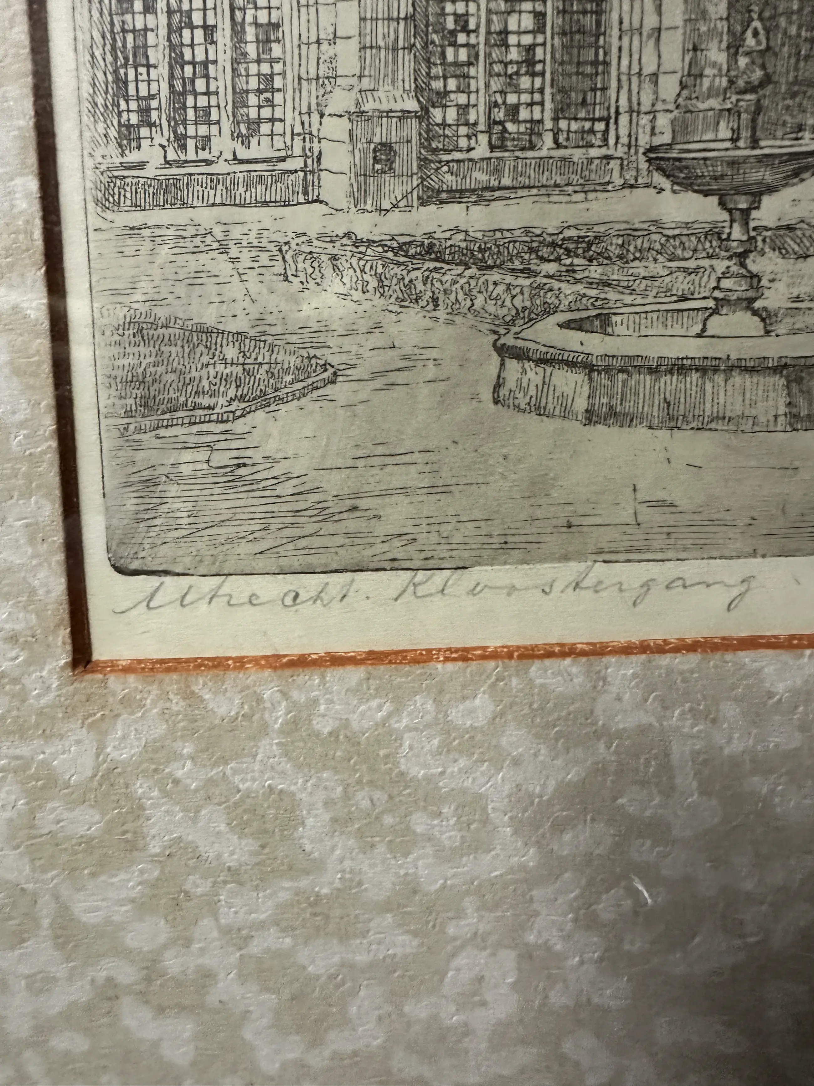 Dit honderd jaar oude werk van Marius Janssen toont de Kloostergang in Utrecht met de herkenbare Domtoren op de achtergrond
