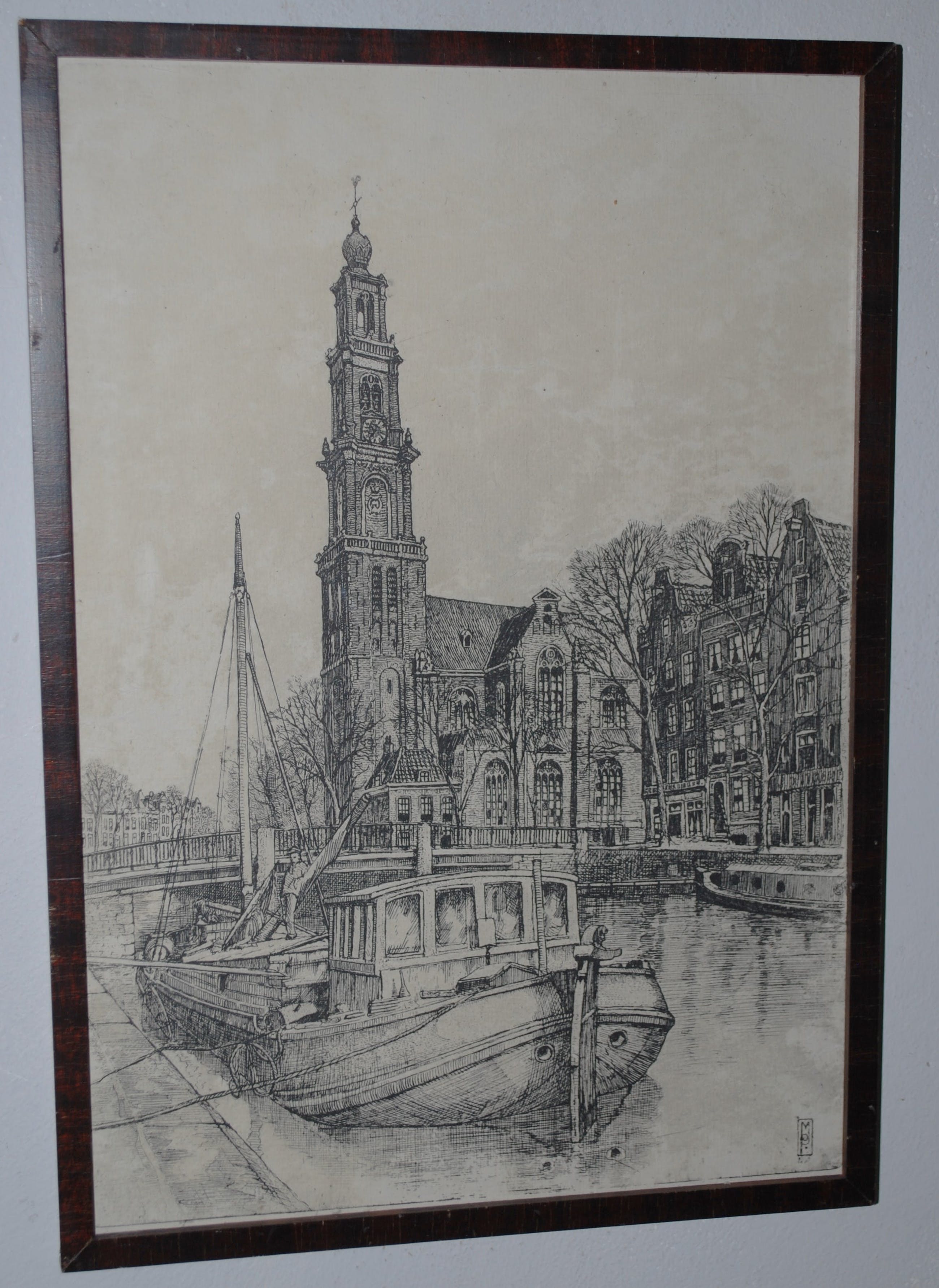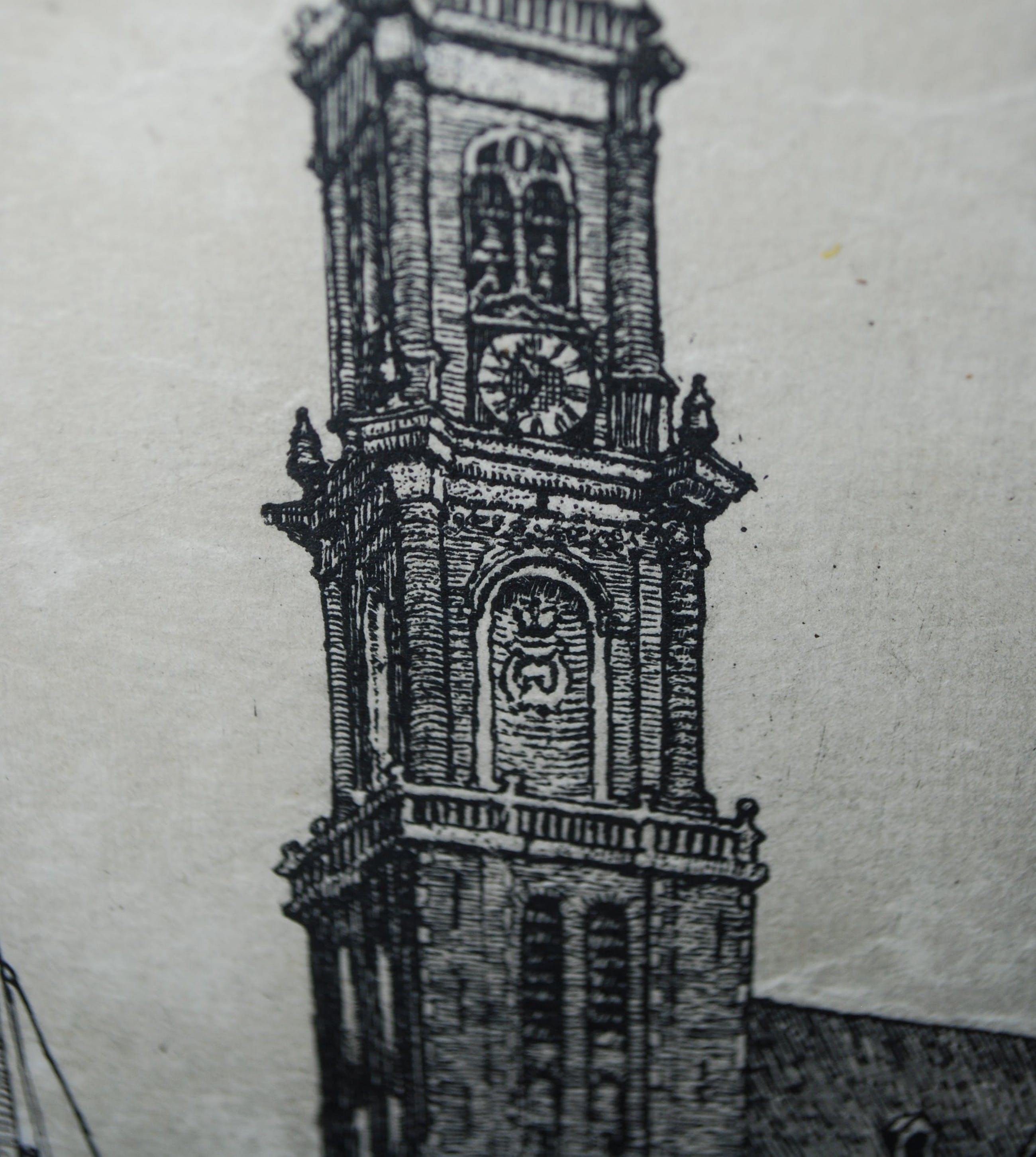De ets is helder (ontzuurd) maar rimpelt licht in de luchtpartijen. Achter glas in de originele