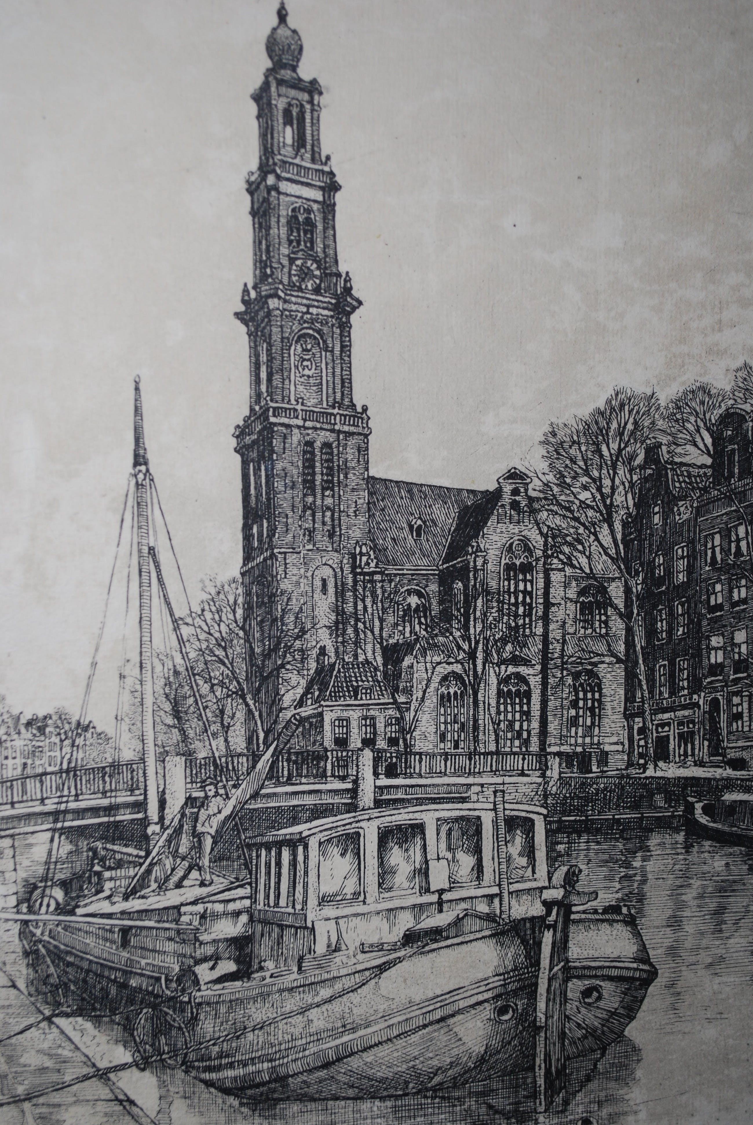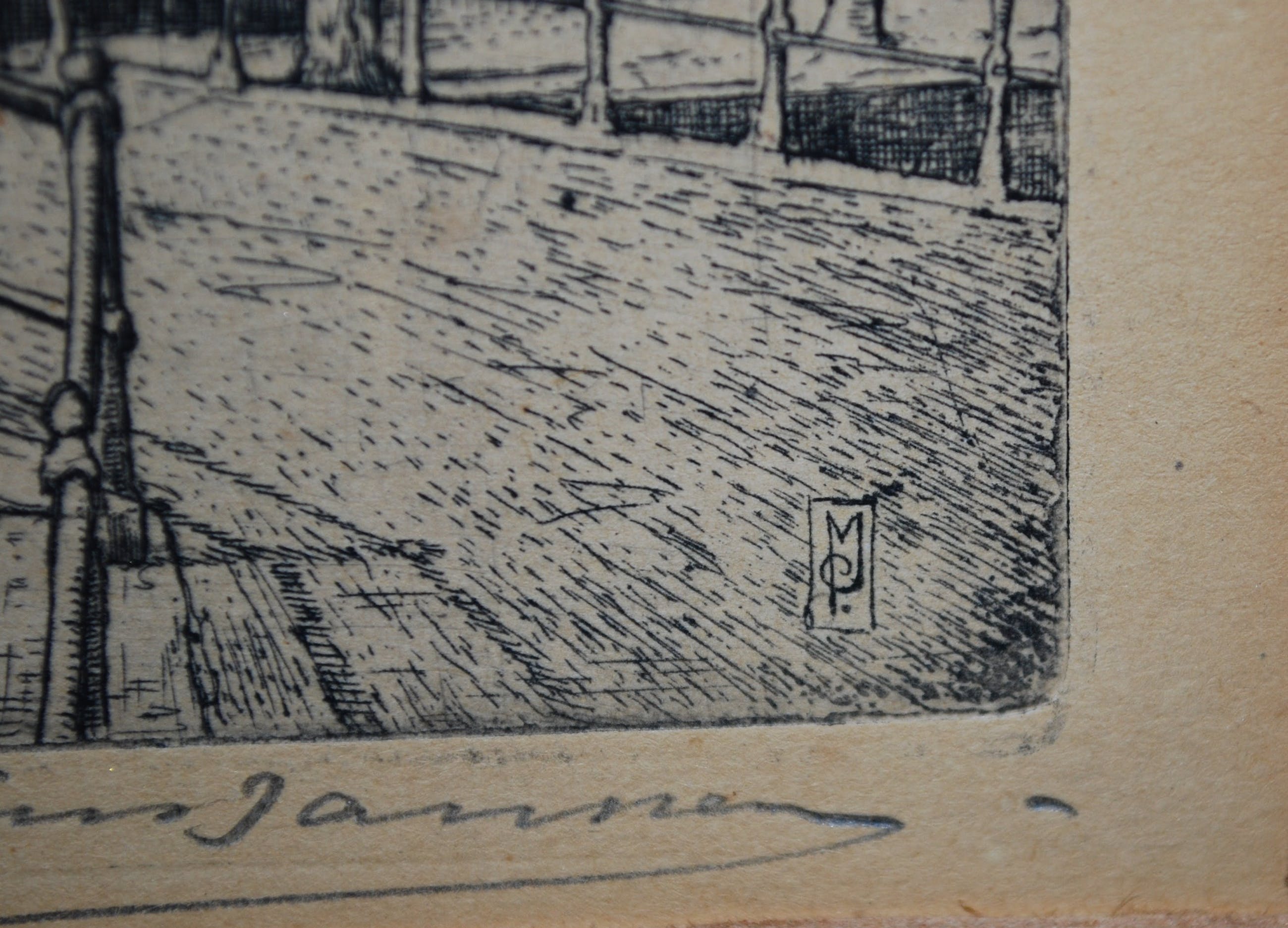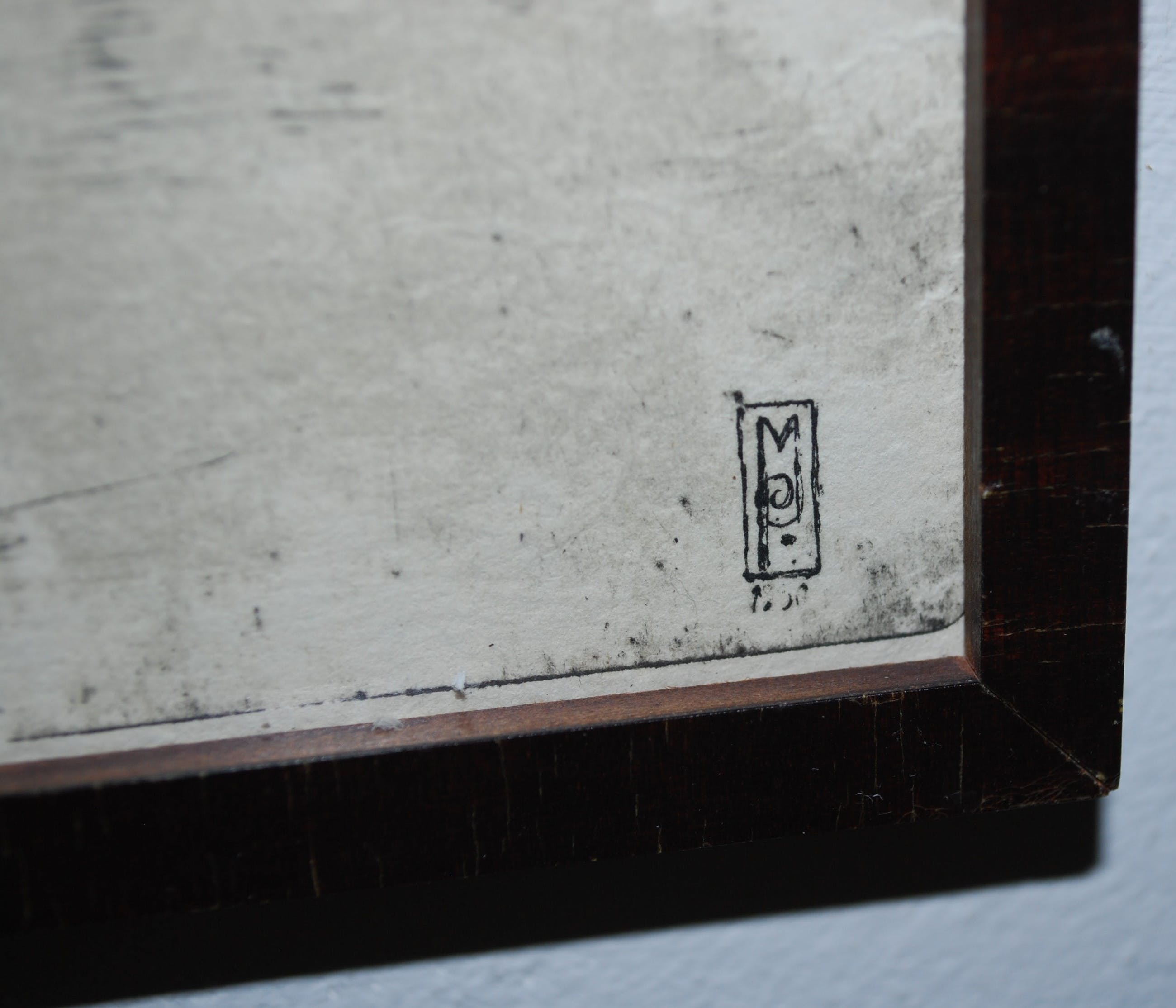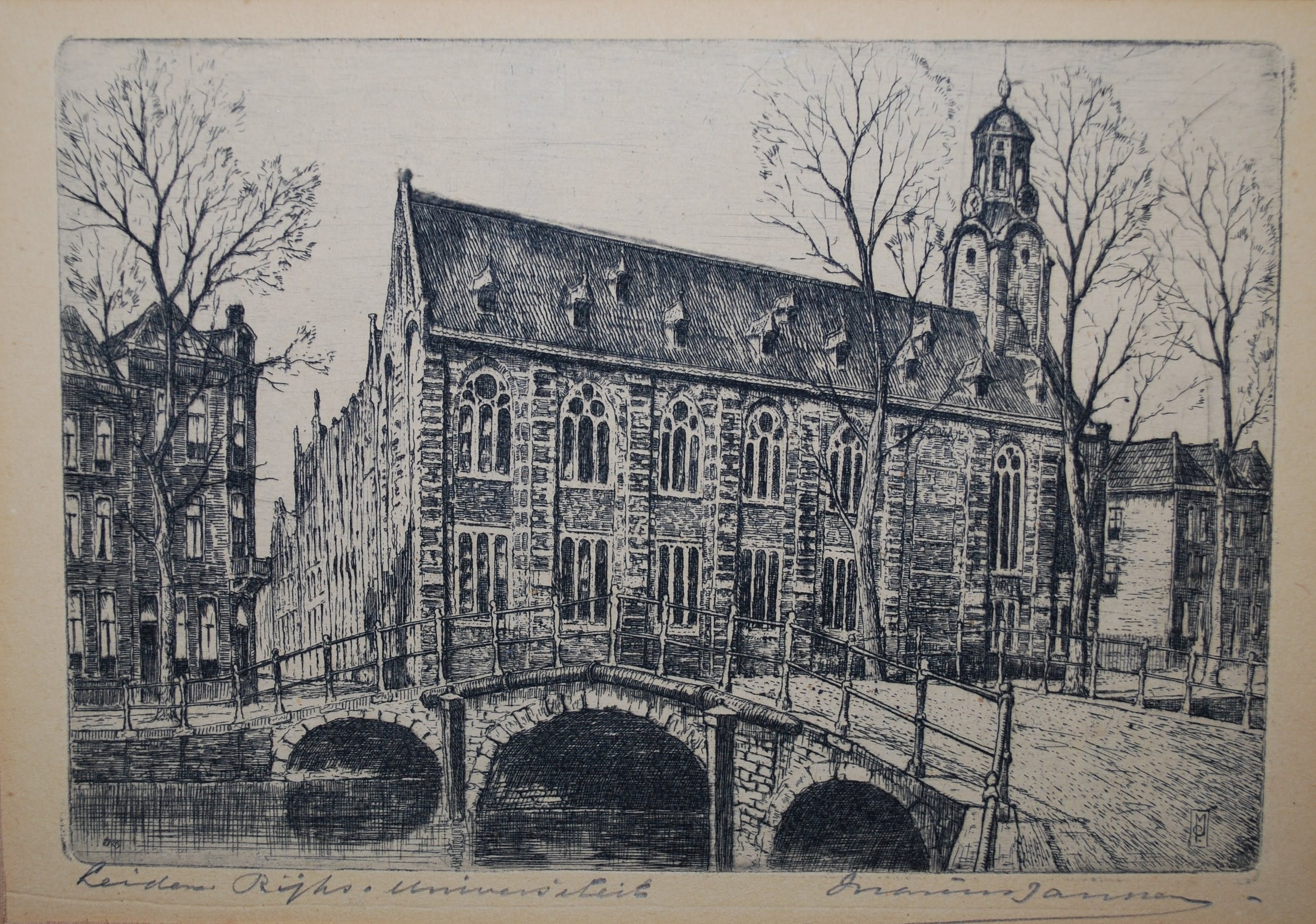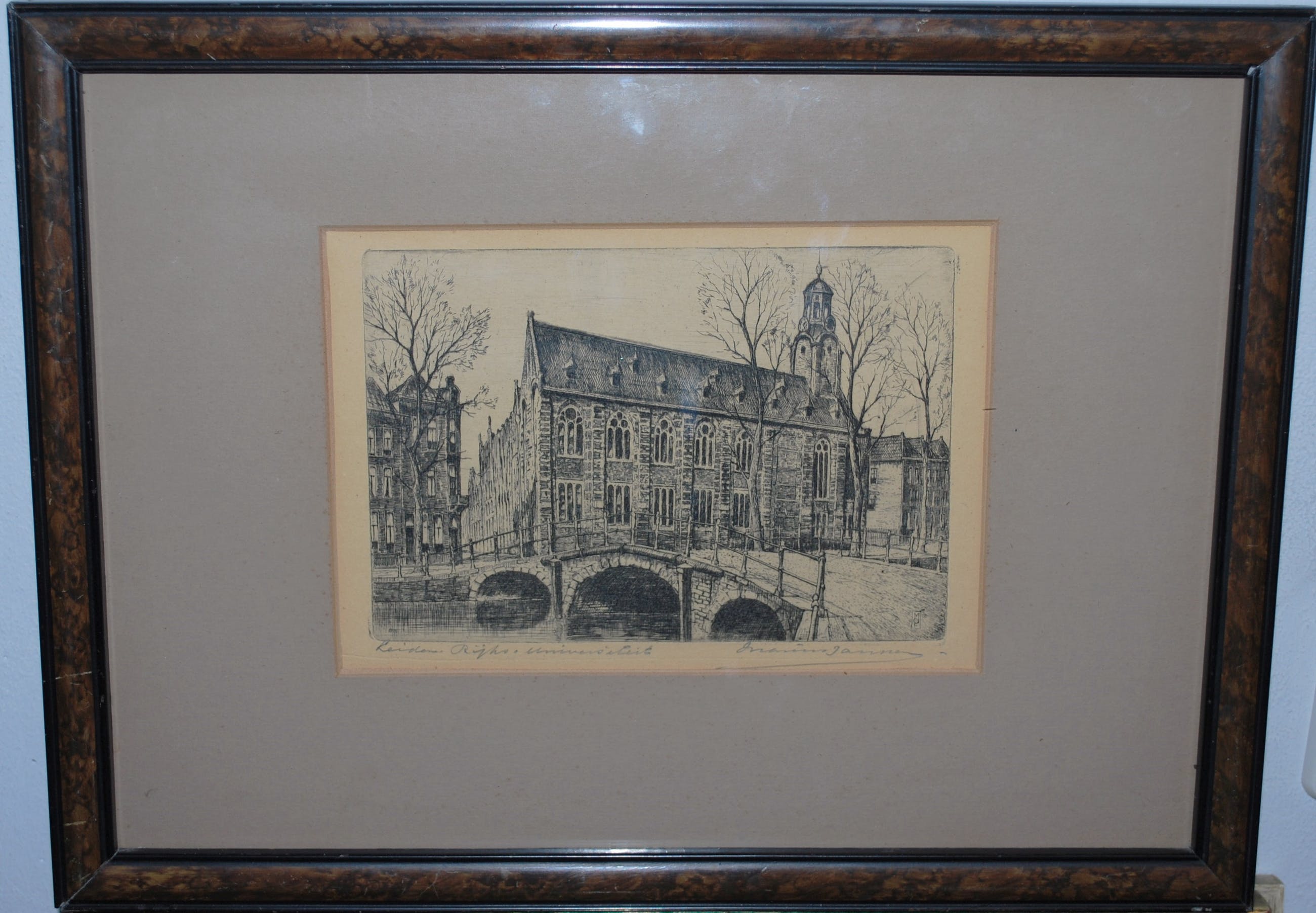 Leiden: plaatrand 12x17.5 cm. Potloodgesigneerd en -beschreven. Achter ppartout en glas. In de originele lijst met lichte schade, 28x38 cm.
