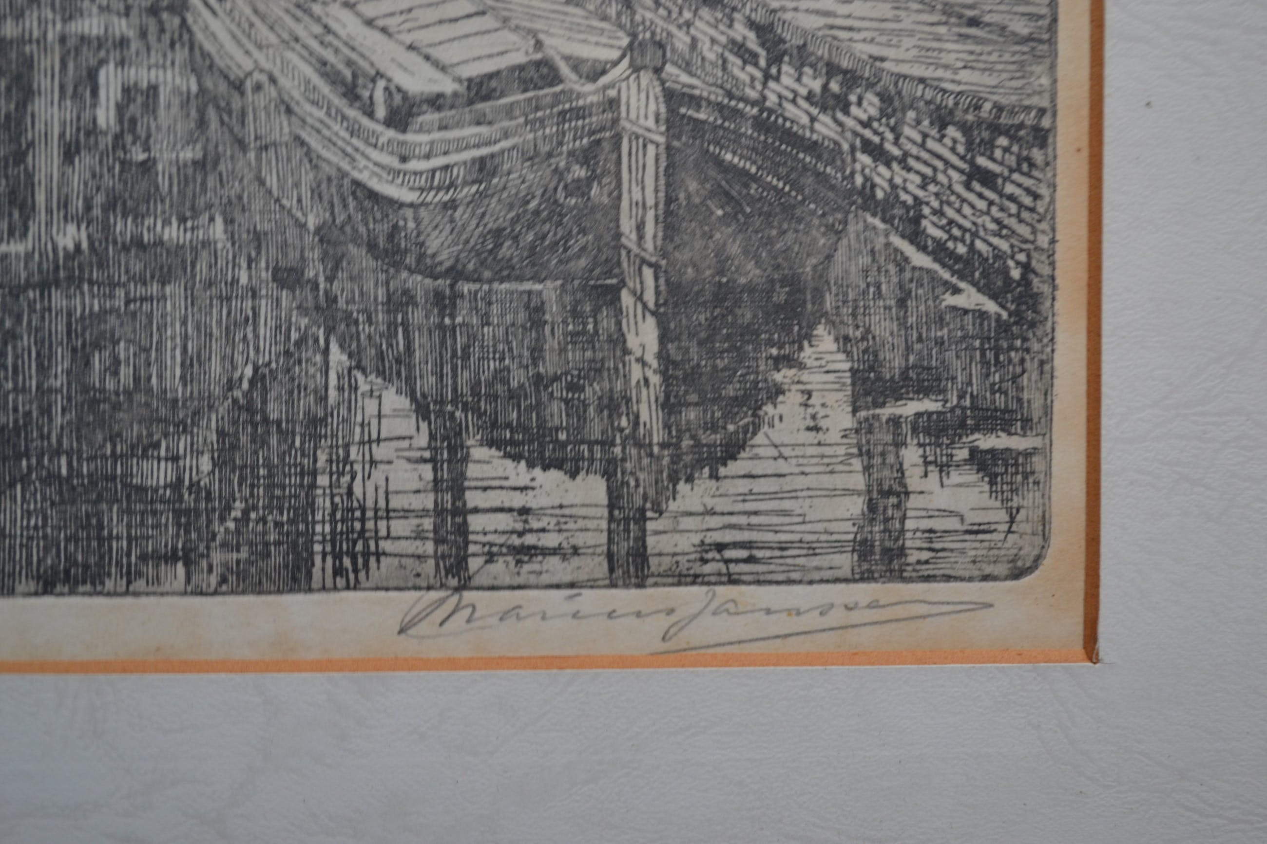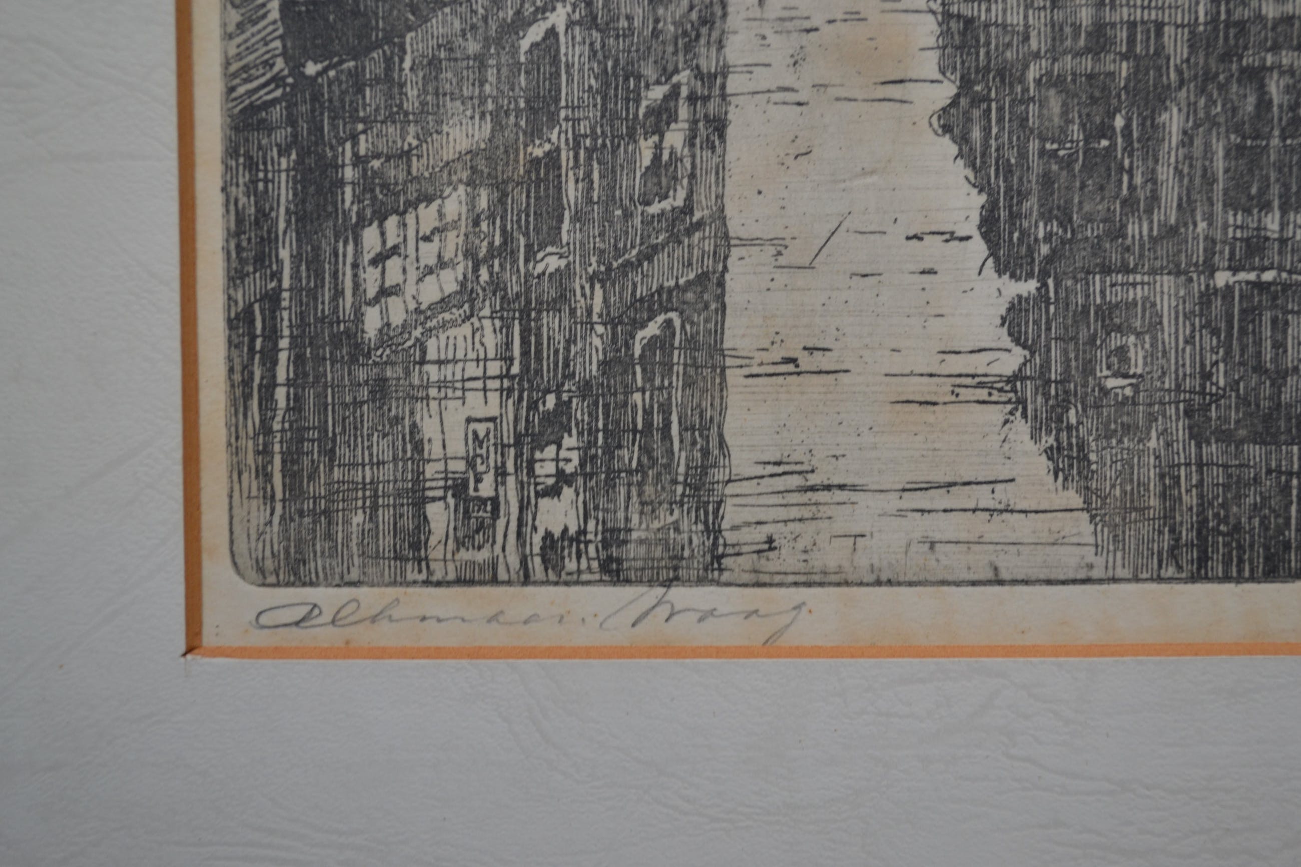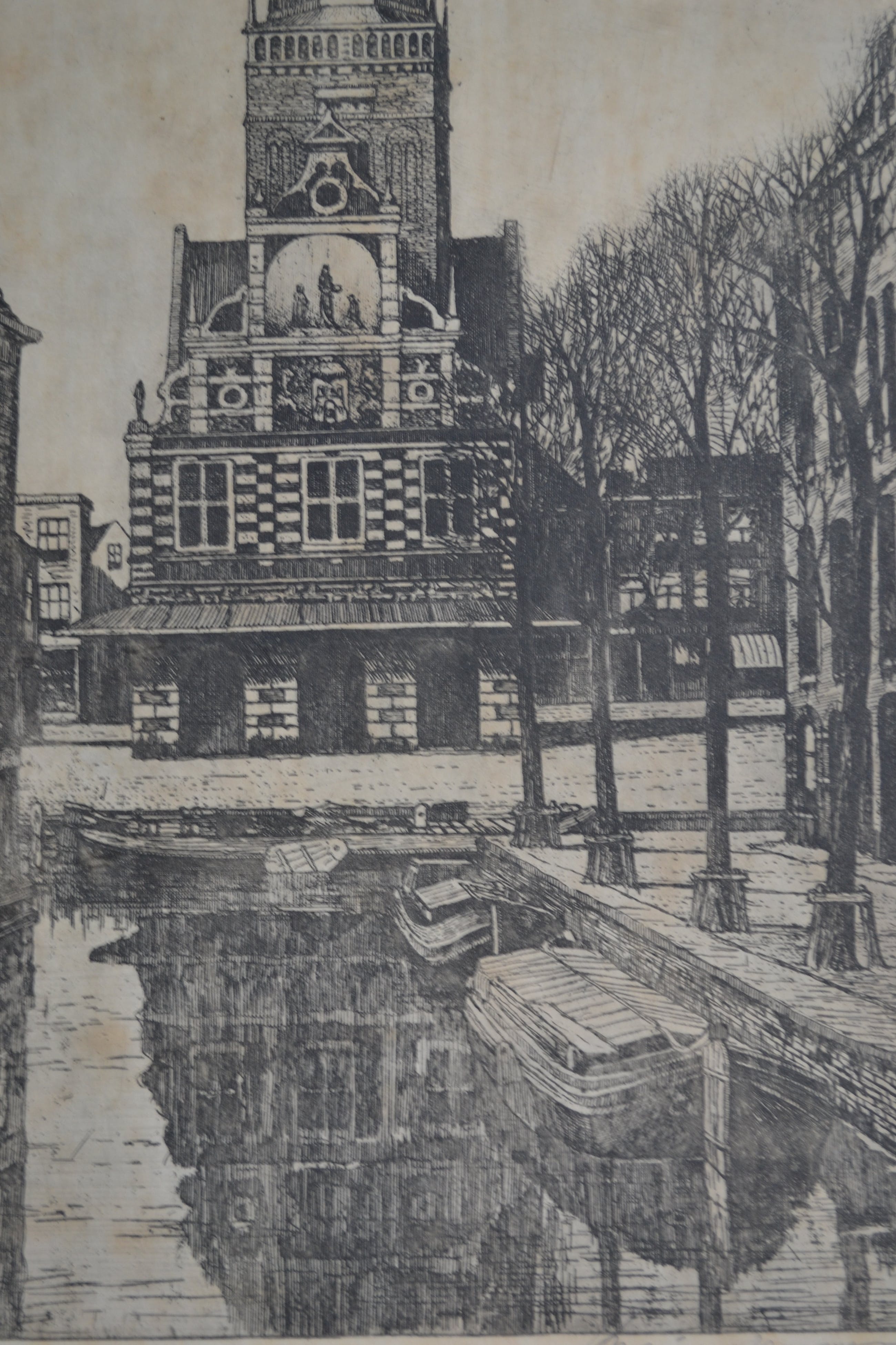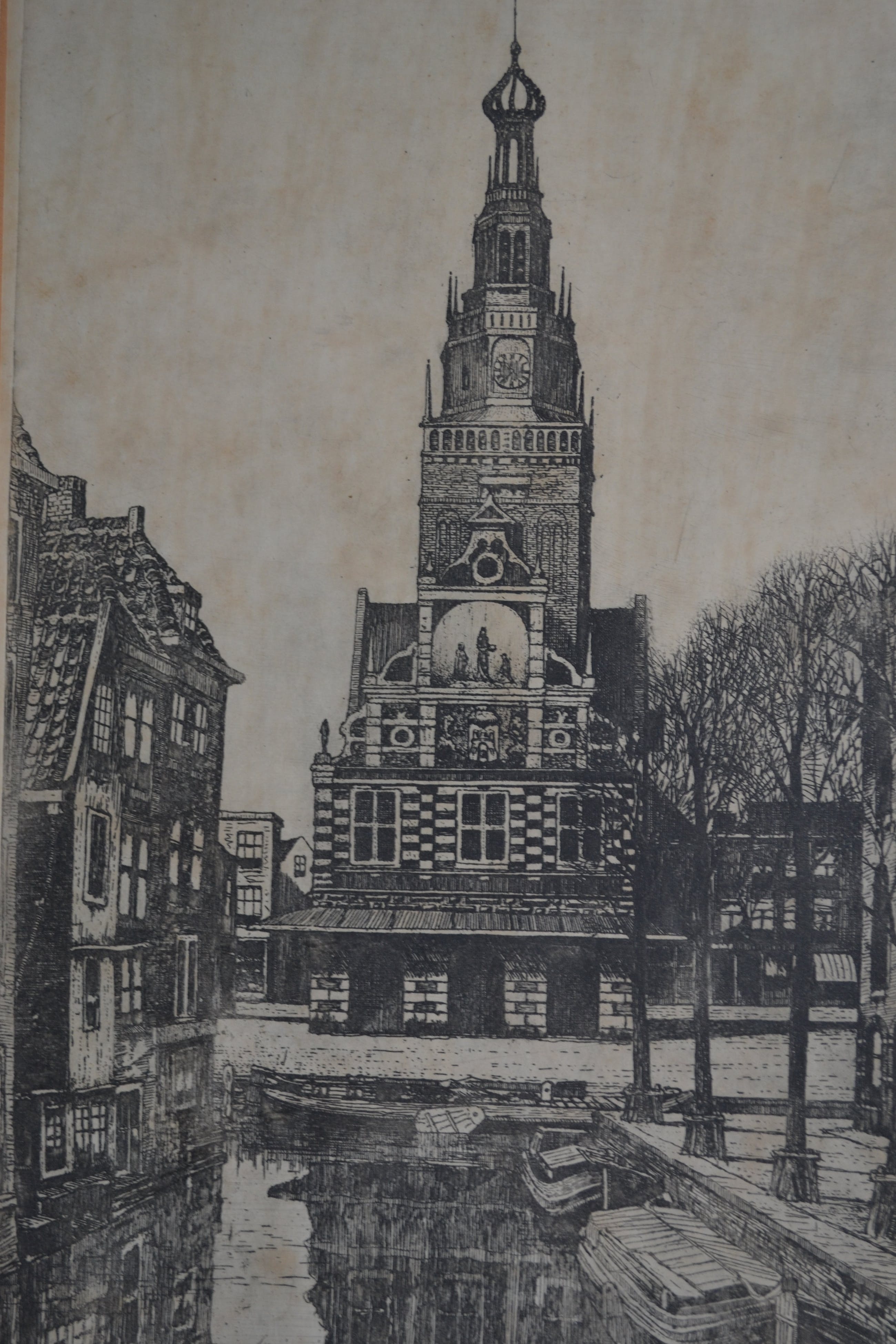 Ets van de Waag in Alkmaar door Marinus Janssen. Rechtsonder in potlood gesigneerd en linksonder in potlood 'Alkmaar Waag". Afmeting inclusief passe-partout is 57x40cm.
