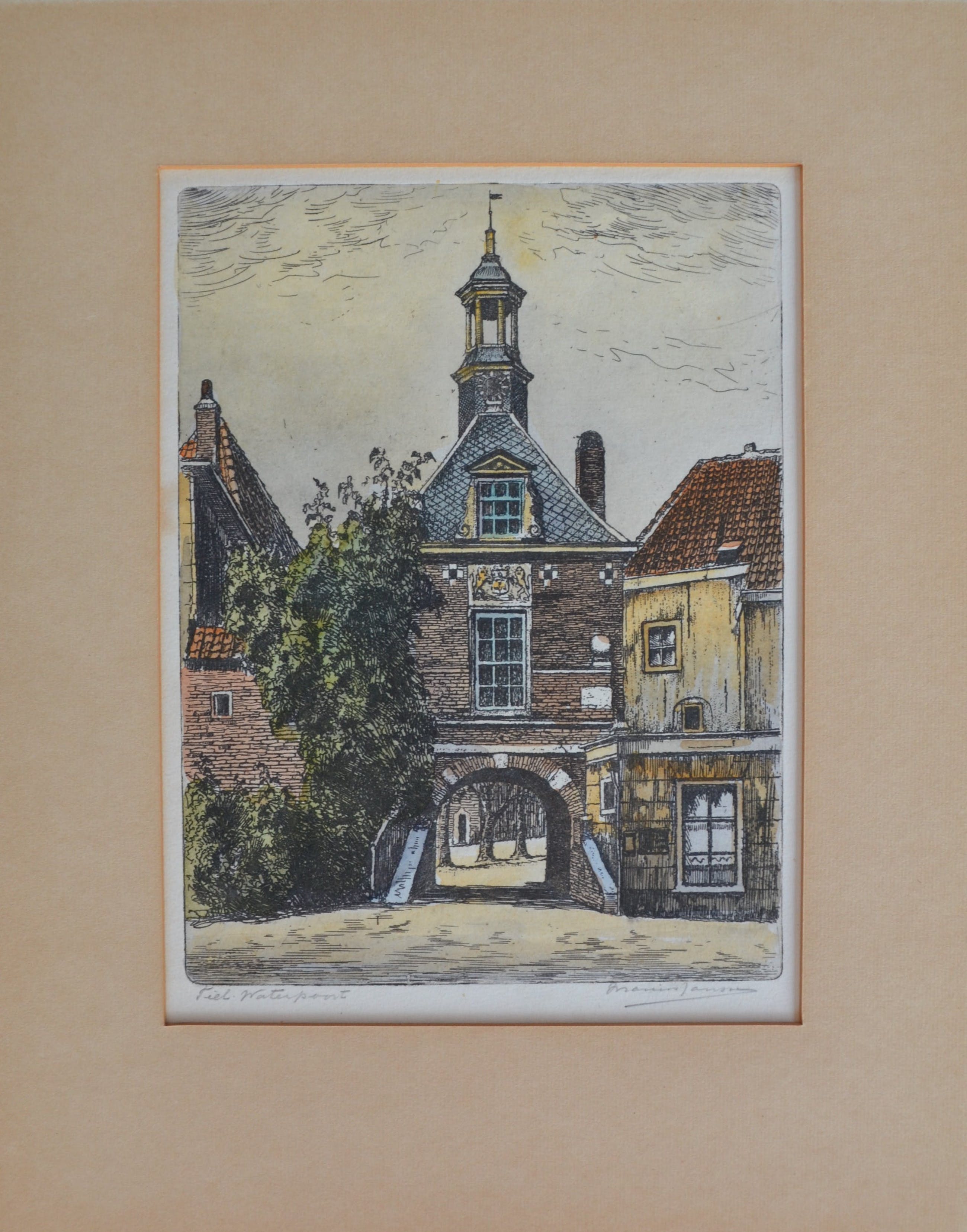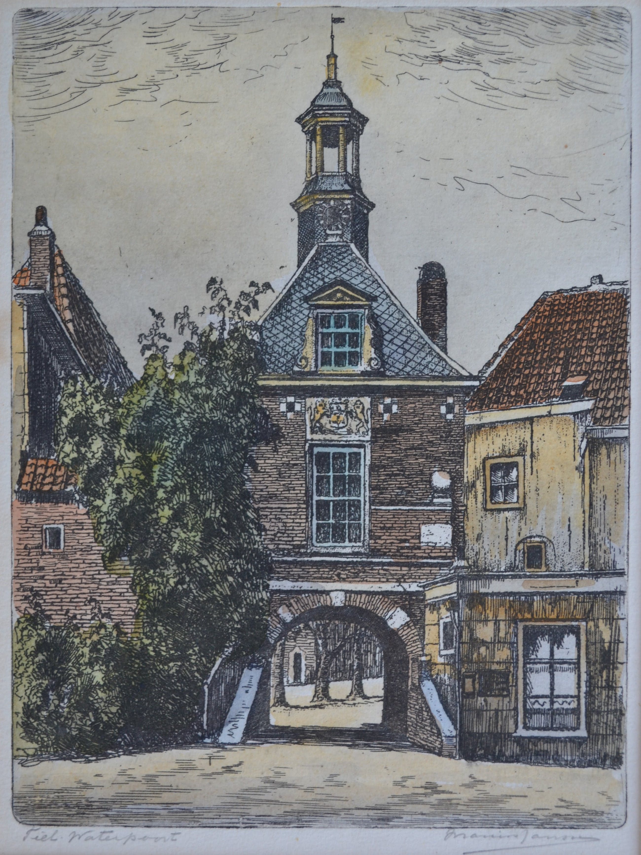 Prachte gekleurde ets van Marius Janssen. R.o. in potlood gesigneerd en l.o. getiteld 'Tiel Waterport'. Voorzien van passe-partout en in uitstekende conditie. Begin 20ste eeuw. Maat passe-partout is 38x40cm en beeldmaat is 25x19cm. Wordt goed verpakt en aangetekend verstuurd.