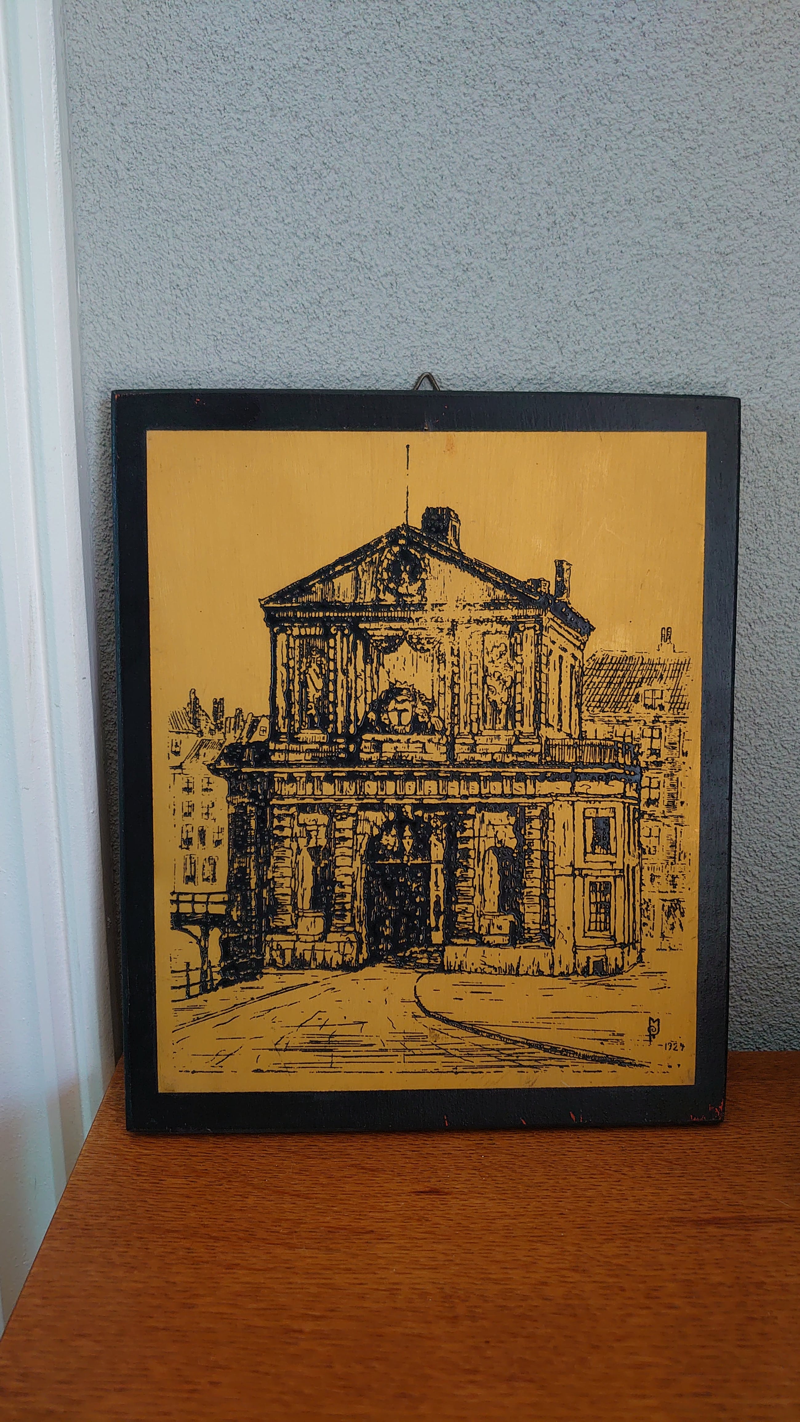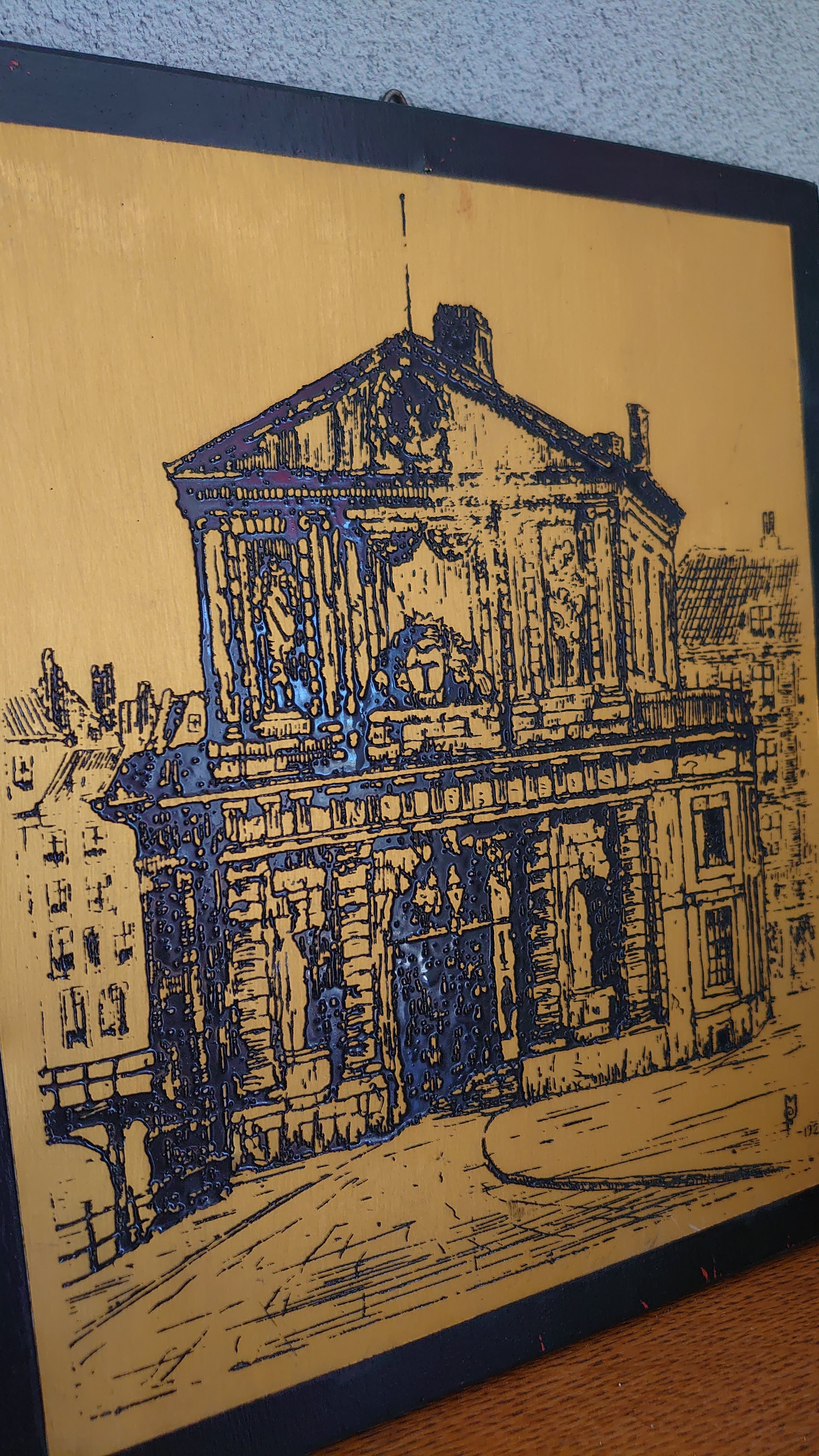 Mooie gravure, afhankelijk van hoe het licht op het werk valt, schittert het materiaal