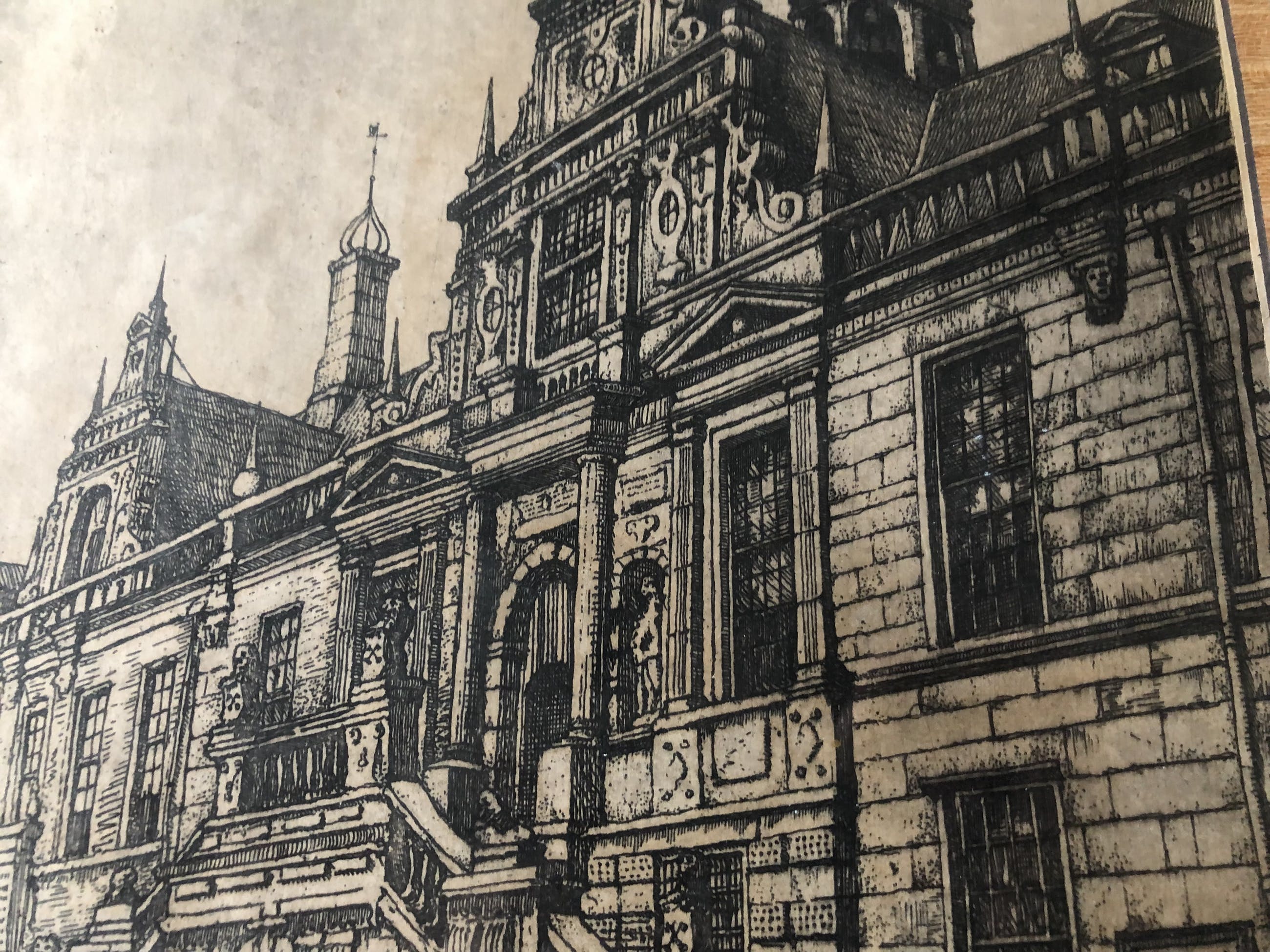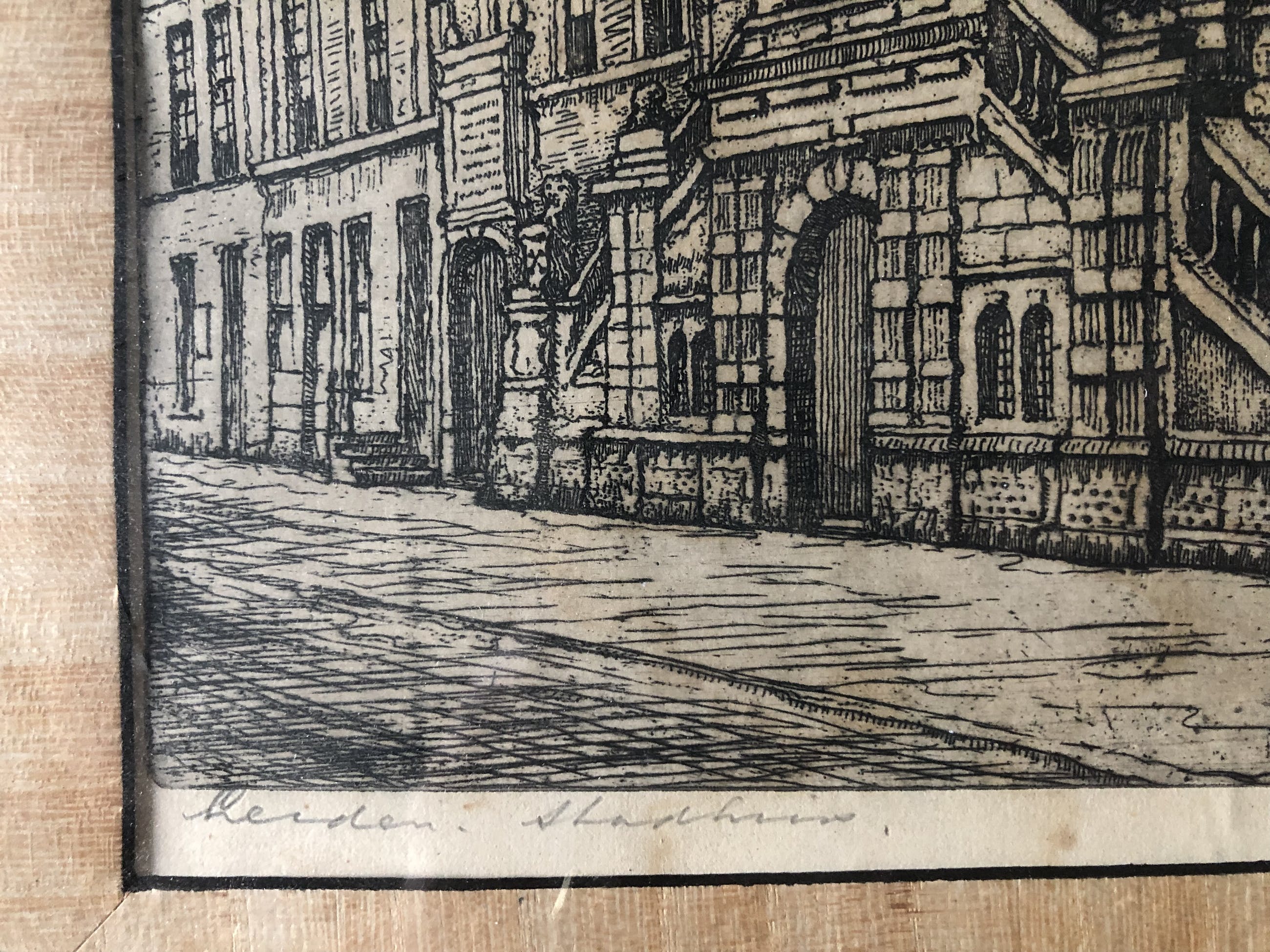 Fraaie ets van Marius Janssen geboren in 1885 te Den Haag en overleden in Rotterdam in 1957. Marius Janssen schilderden en etste vooral stadsgezichten. Hier betreft het een ets van het stadhuis te Leiden. Met potlood gesigneerd door de maker.