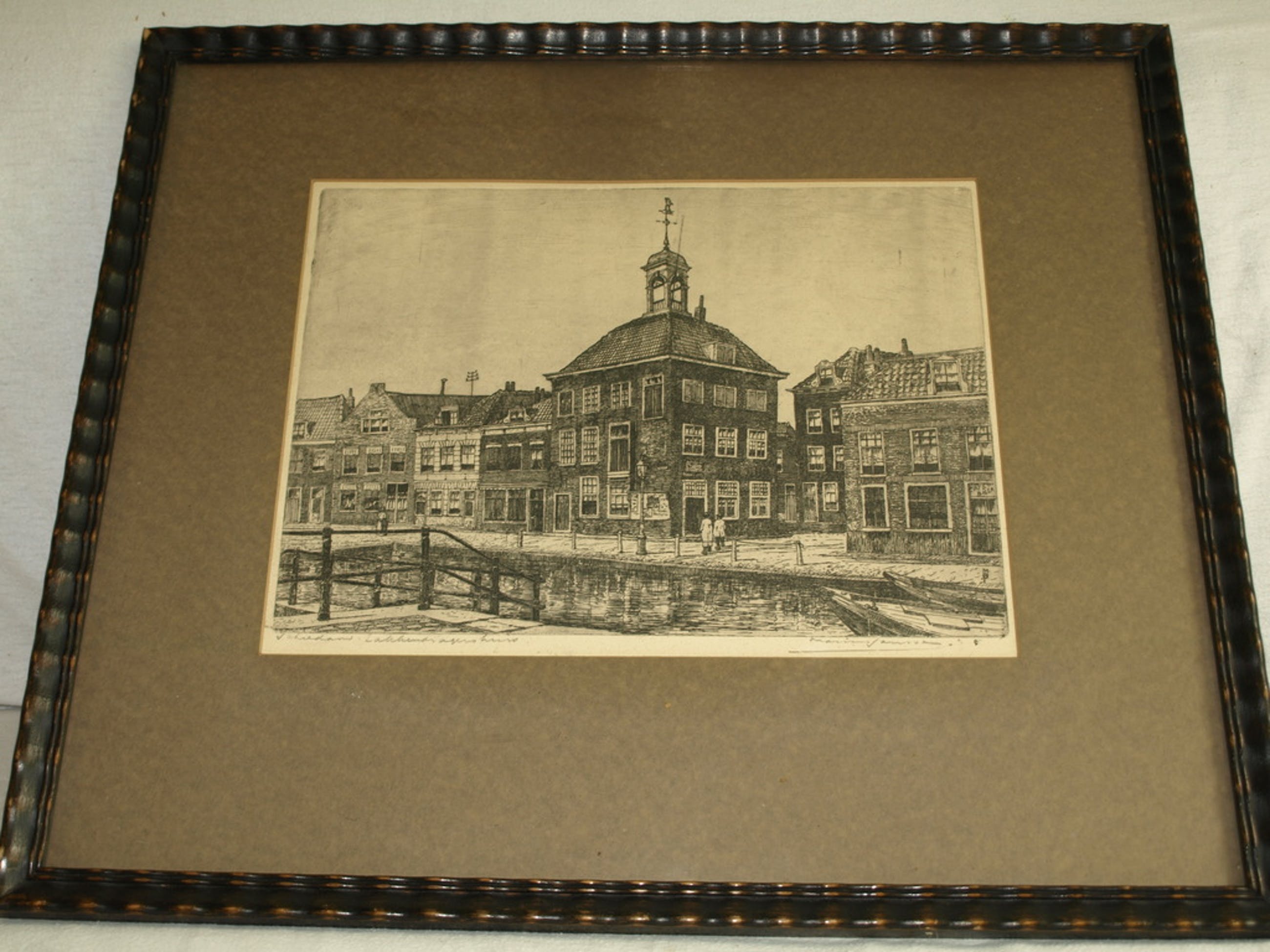 Conditie: De ets is in goede staat. De houten lijst heeft slijtplekjes.