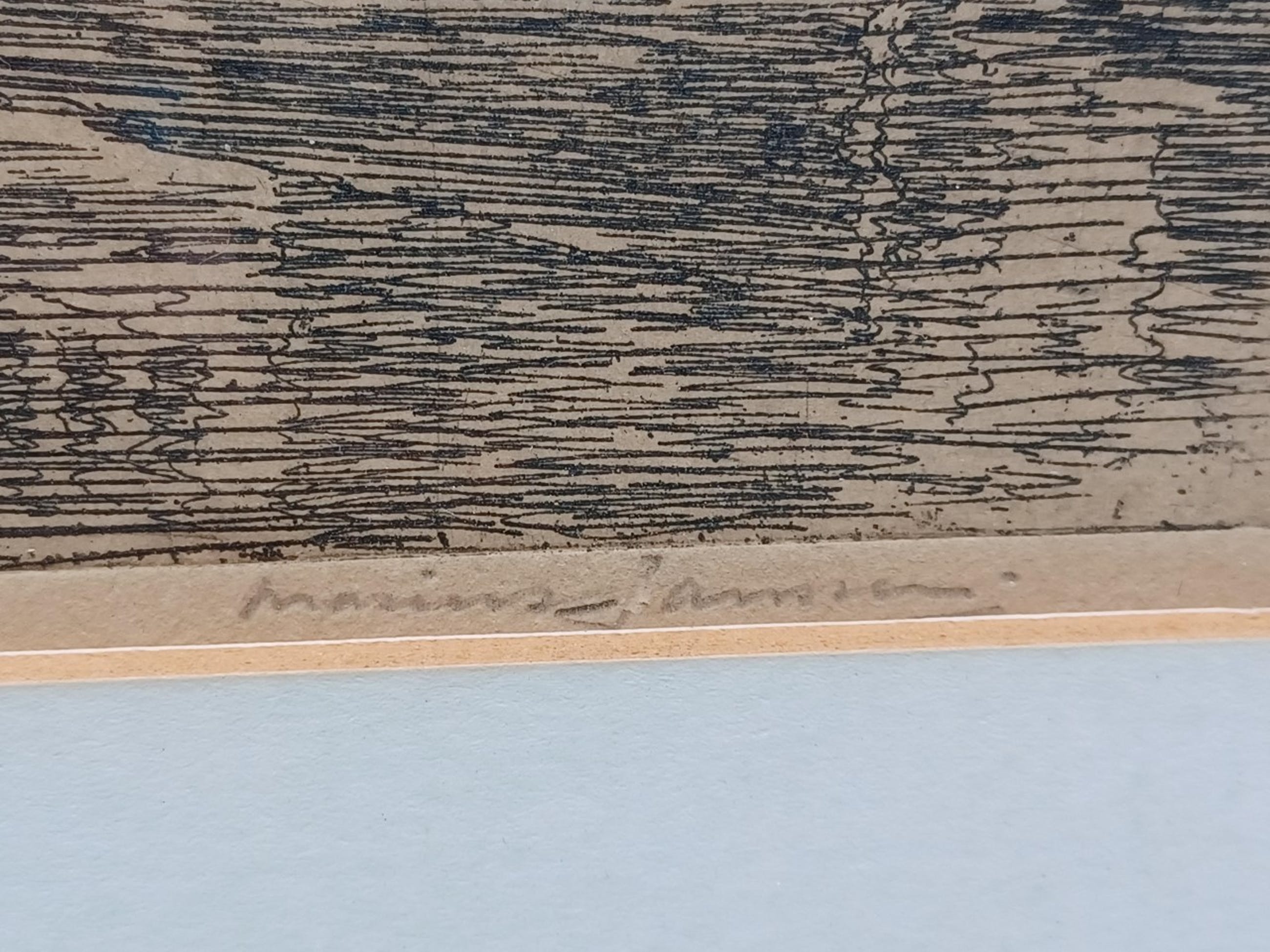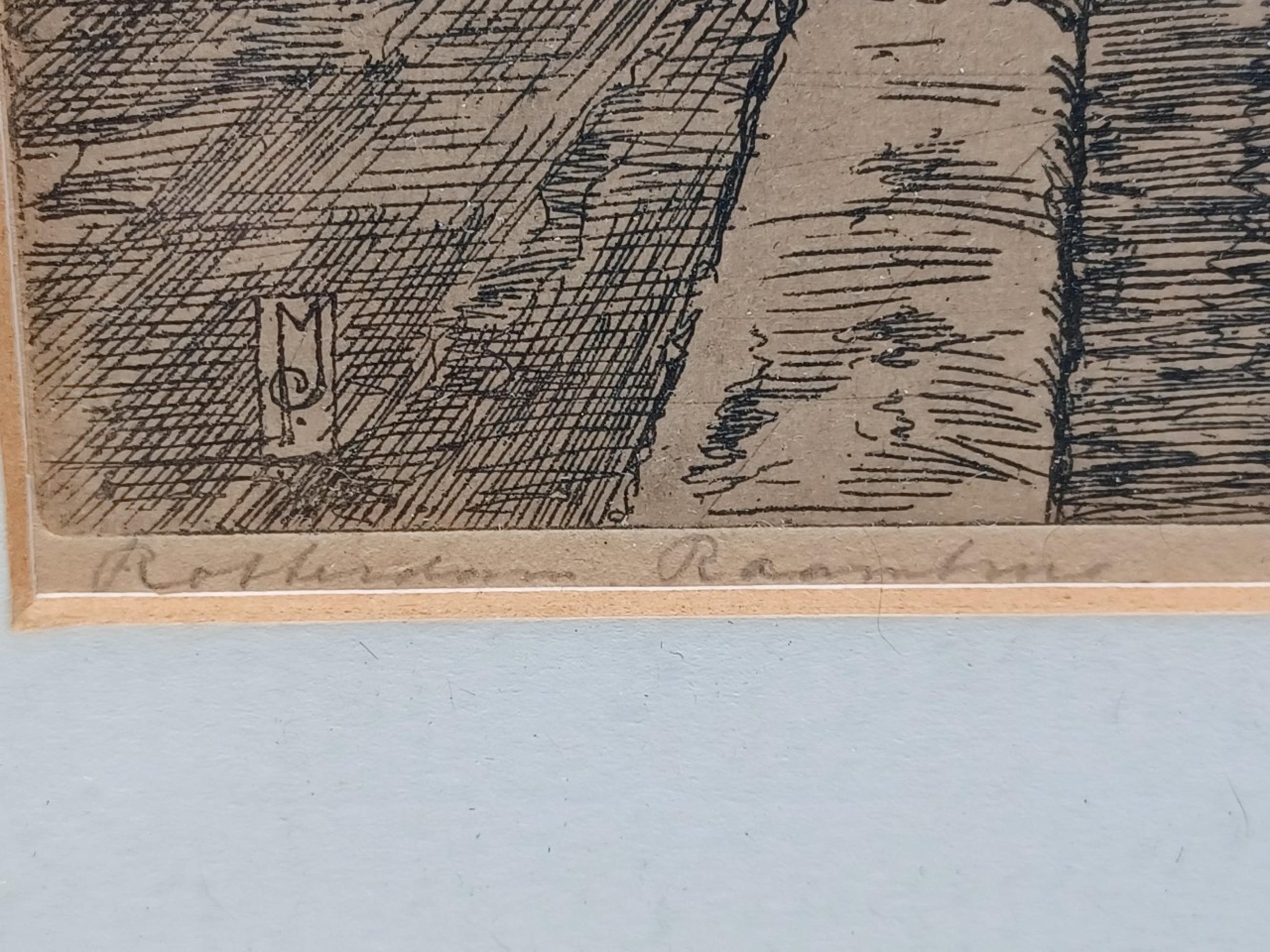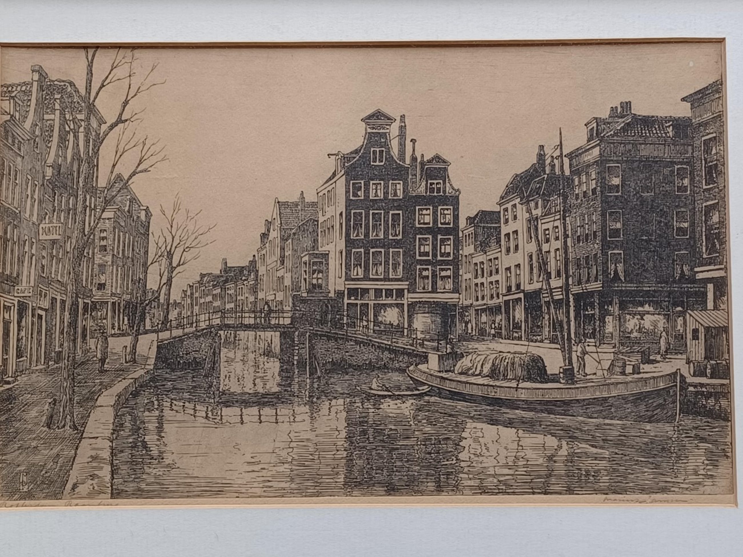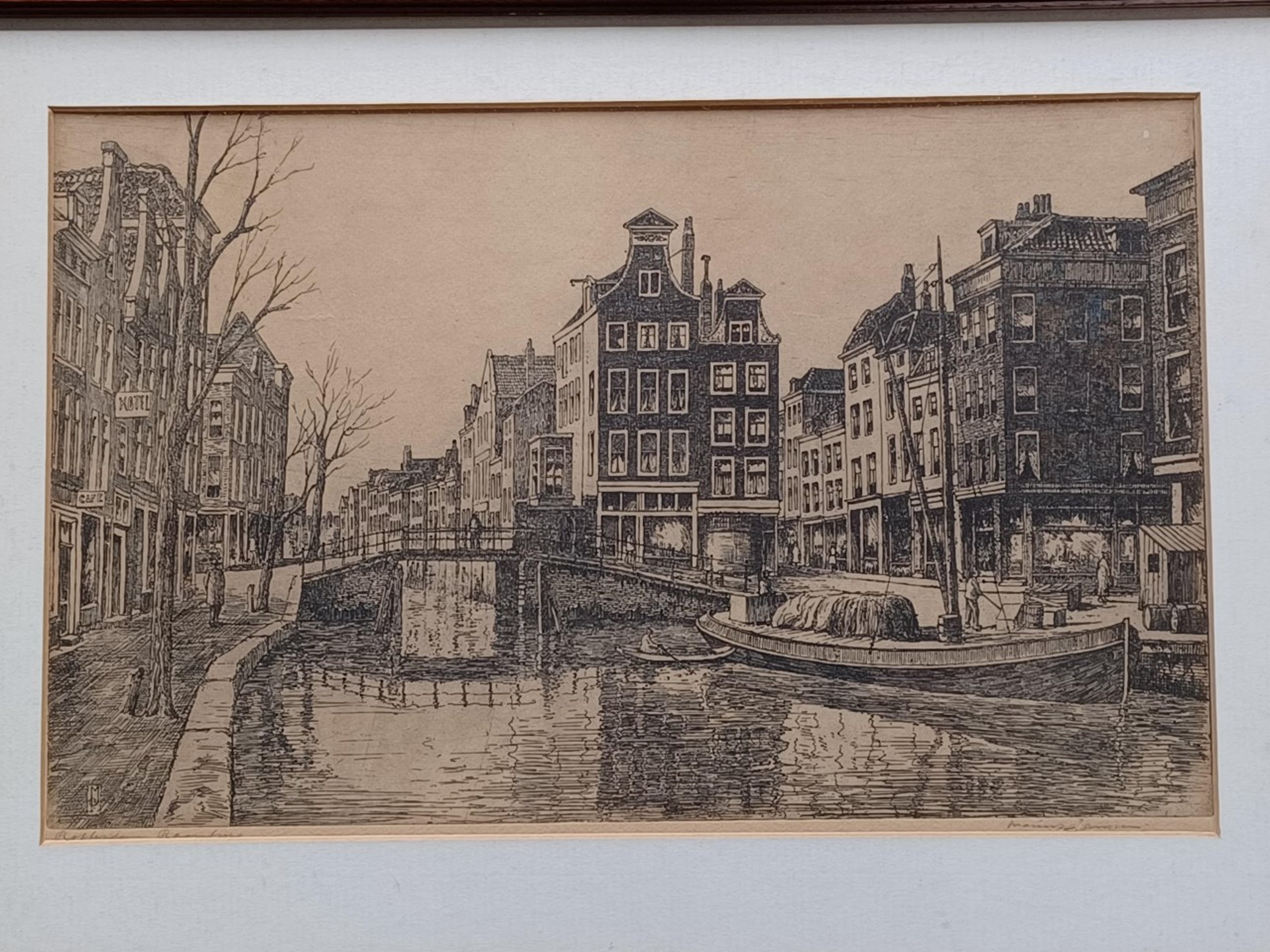 Een fraaie ets van de Rotterdamse kunstenaar Marius Janssen uit ca 1945 van de Raambrug in Rotterdam.