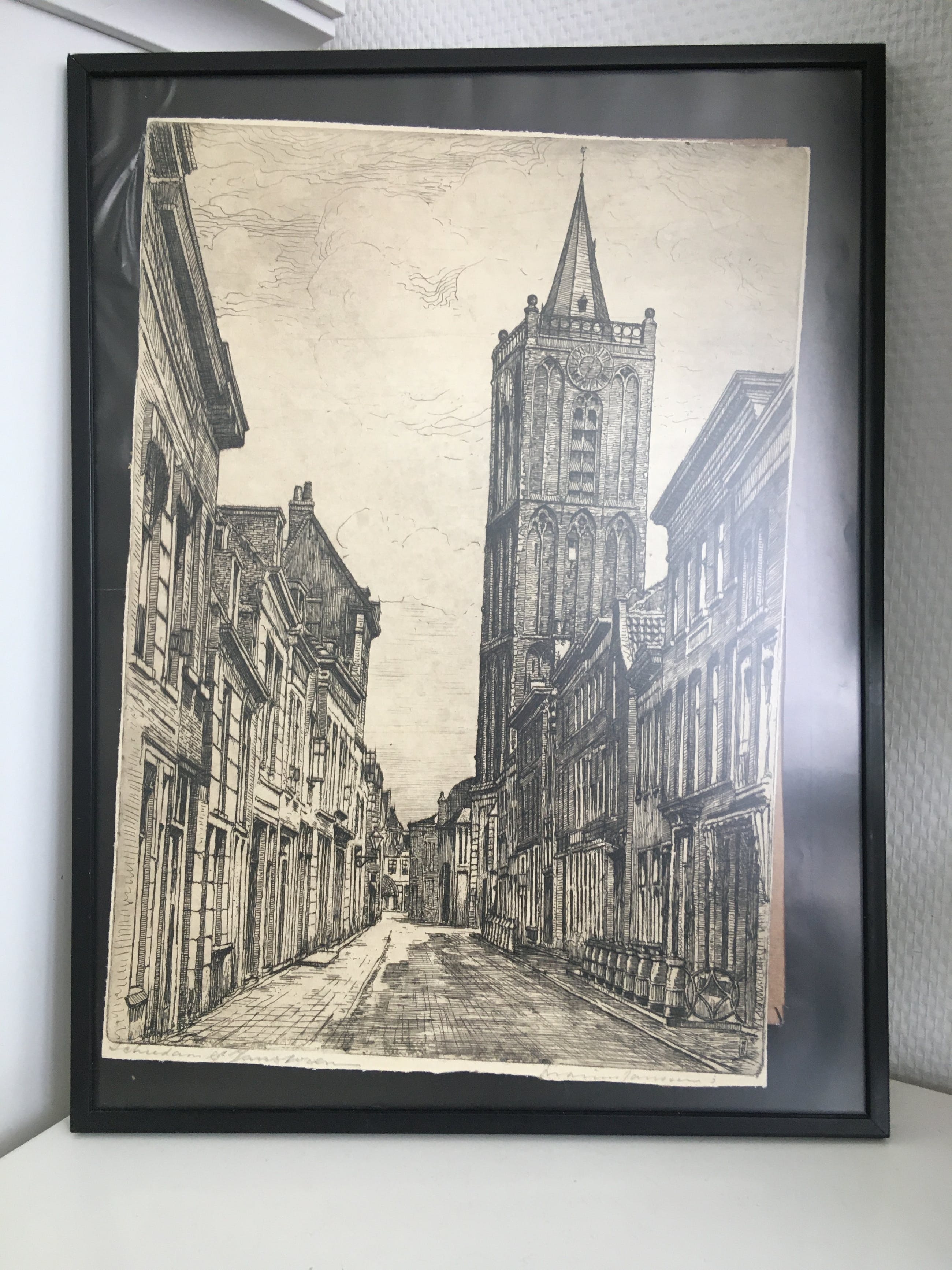 Mooie ondertekende ets, hangt alleen beetje scheef in de lijst. Zie foto’s.