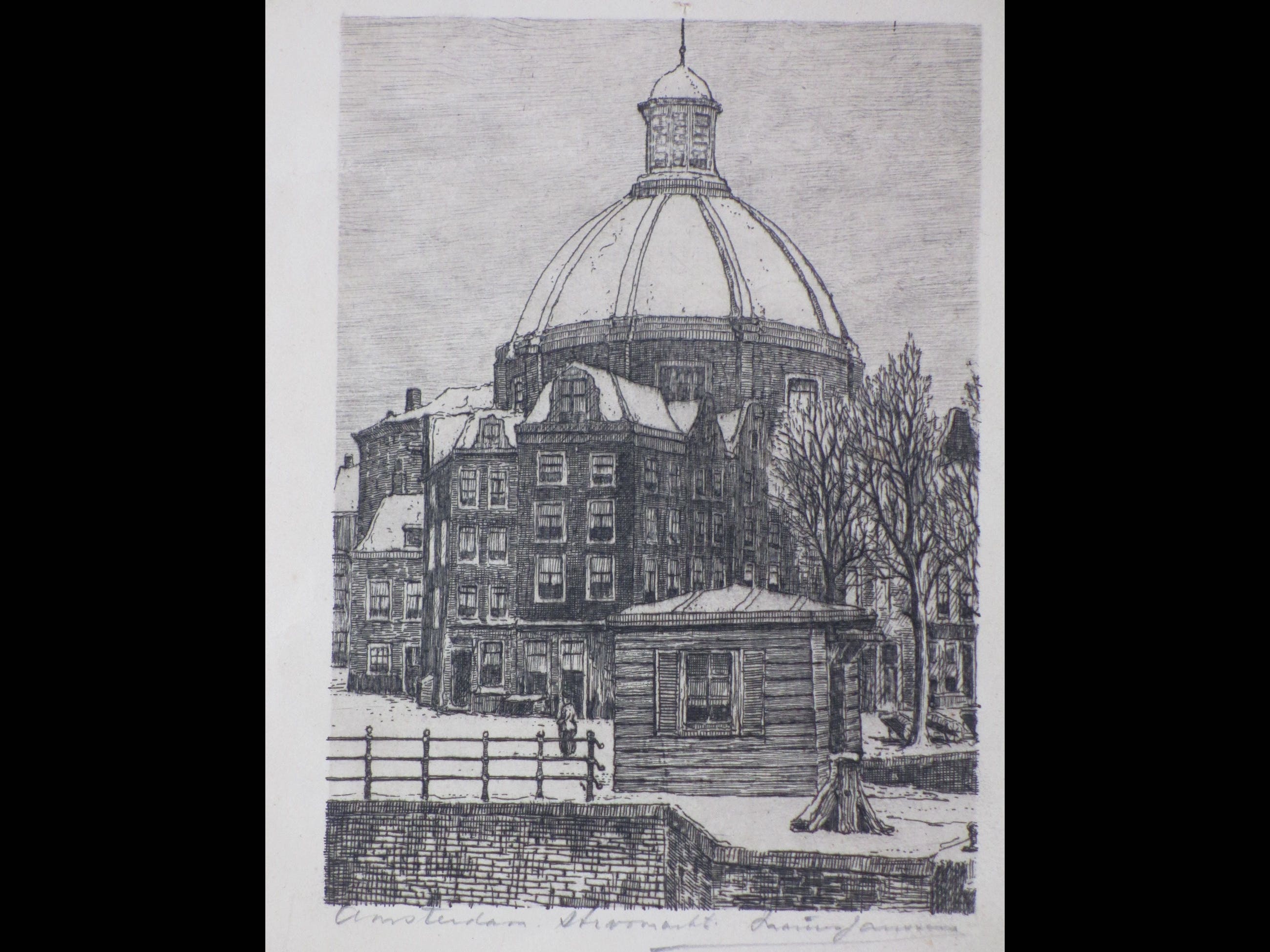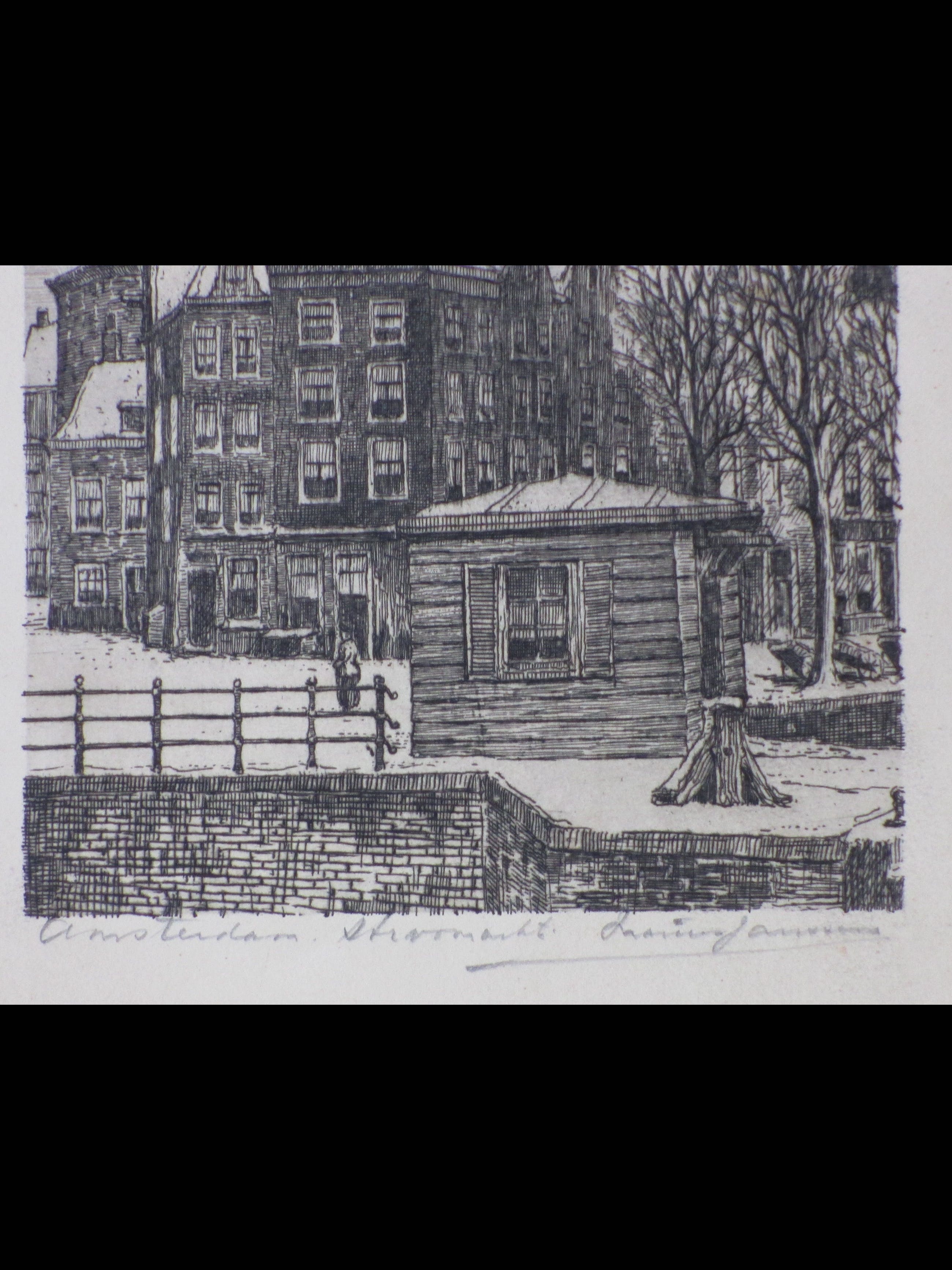 Winterse ets door Marius JanssenVoorstelling van de Stromarkt in Amsterdam met de Lutherse KerkLosbladig, beeldmaat 18x13, bladmaat 33x24Gesigneerd in potlood r.o. ' Marius Janssen'Getiteld in potlood l.o. ' Stromarkt Amsterdam' Authenticiteit volledig gegarandeerd