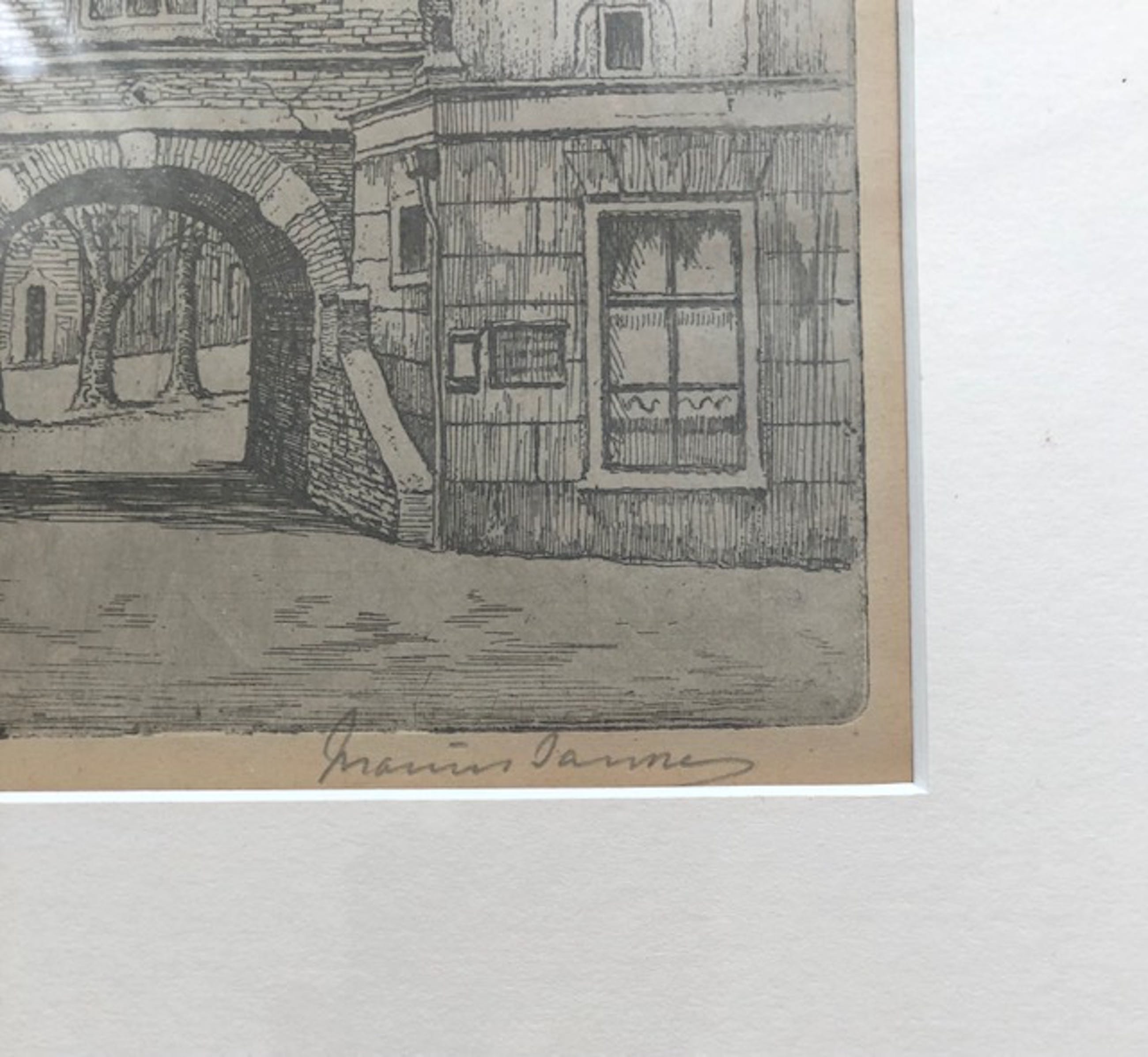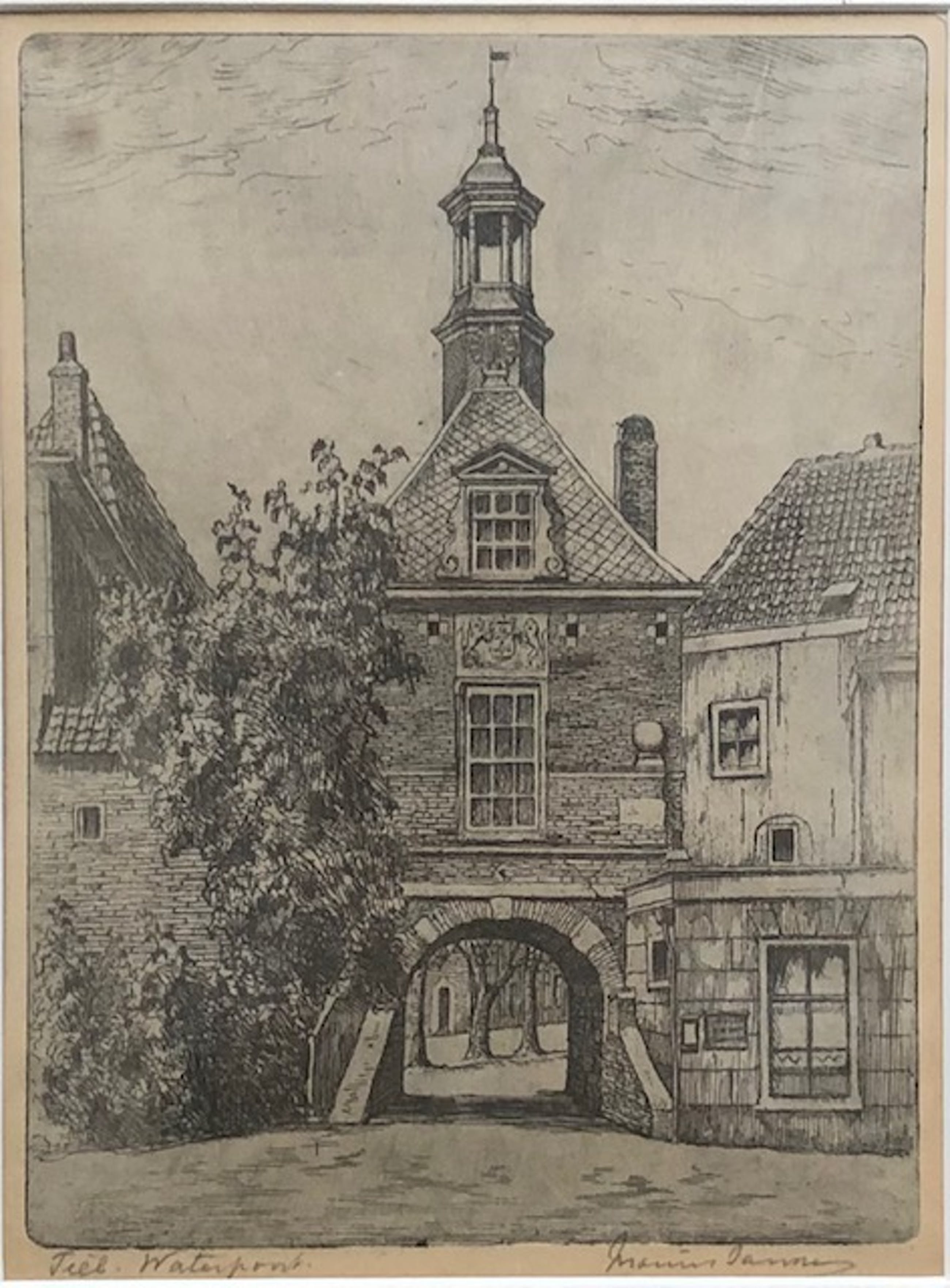 Ets voorstelling Waterpoort Tiel. Gesigneerd Marius Jansen. Gelijst met passepartout.
