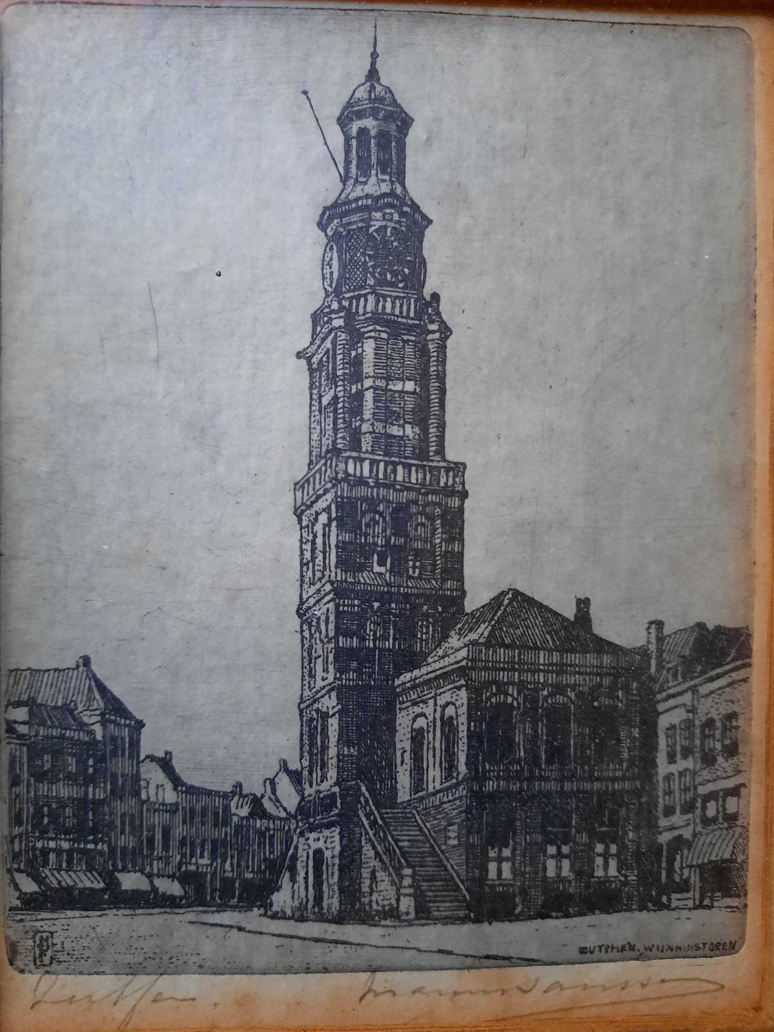 Een mooie ets van de Wijnhuistoren te Zutphen, gekocht in september1947.