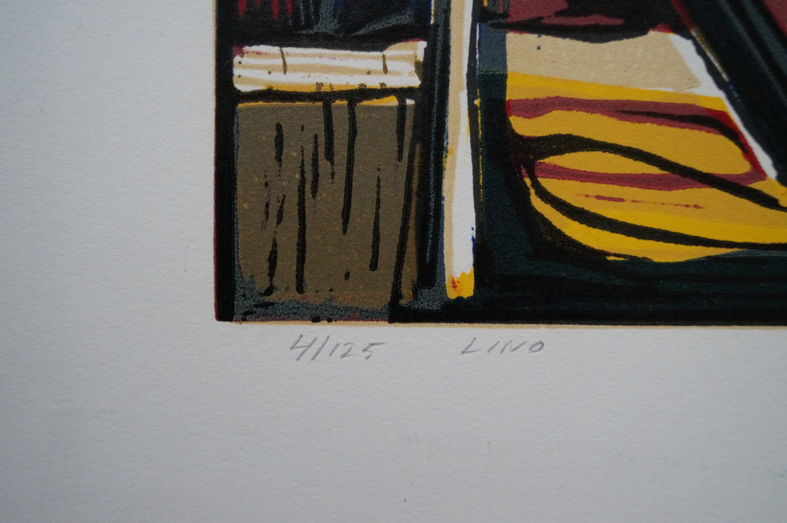 I.v.m. de dikte van deze lino is de verzending plat, tussen 2 platen. De afmeting is daardoor te groot voor verzending buiten Nederland.