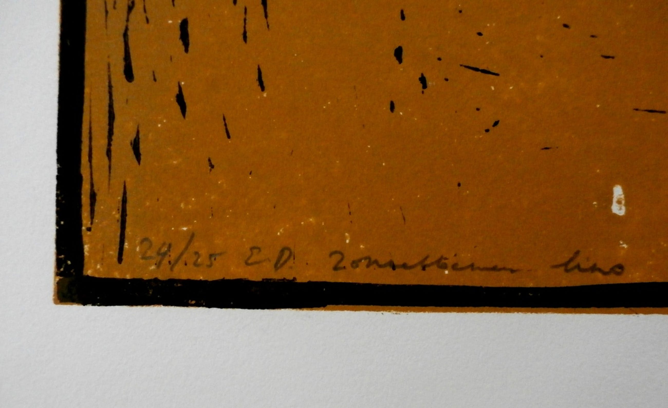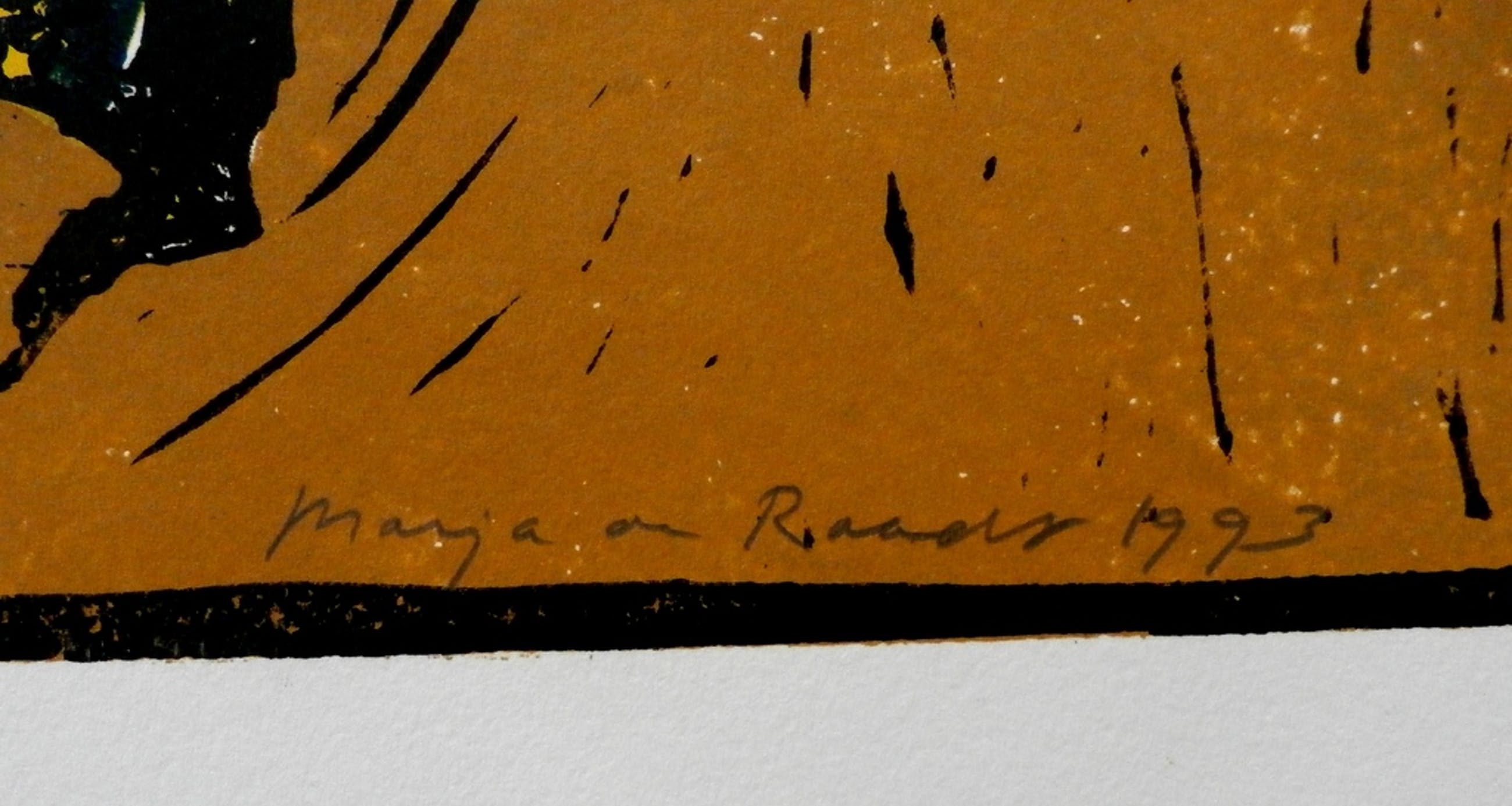 Schitterende linosnede van Marja de Raadt. Titel: Zonnebloemen.Jaar: 1993. Nummer: 24/25. Afmetingen blad: H63 x b 82 cm. Afmetingen voorstelling: H50 x b68 cm. Het werk is rechtsonder, met potlood, gesigneerd door de kunstenares. Herkomst: collectie ABN AMRO.
