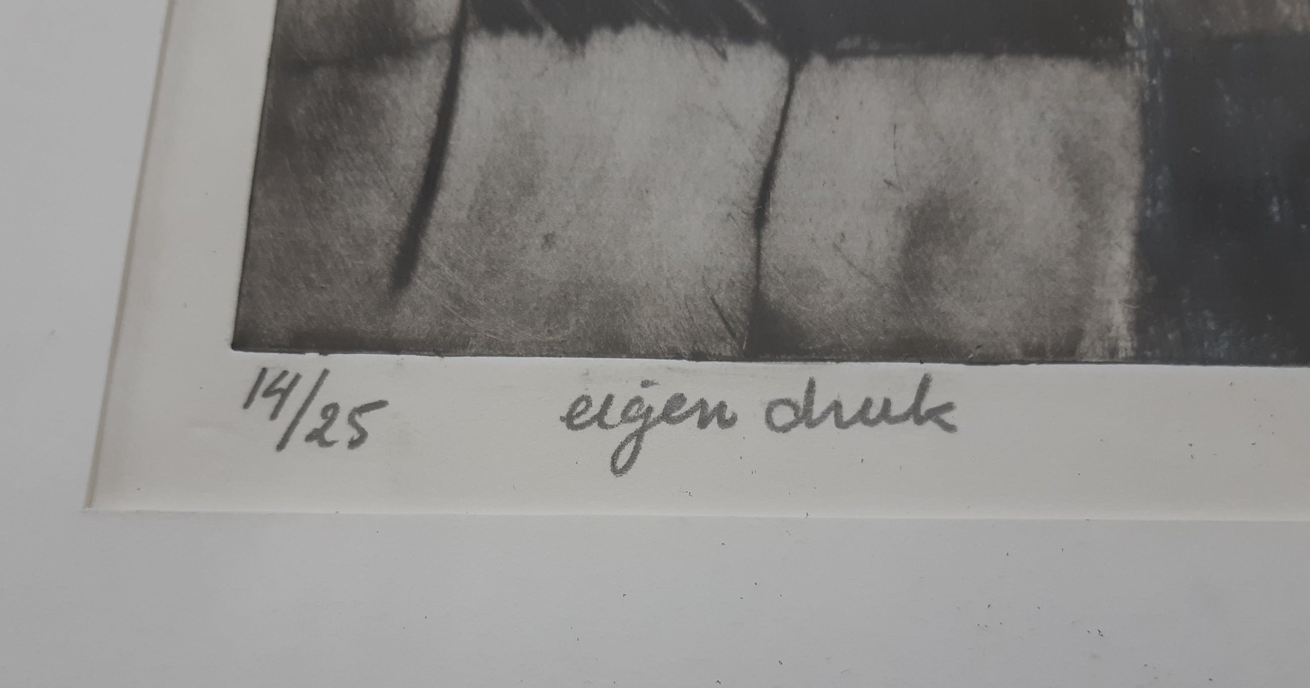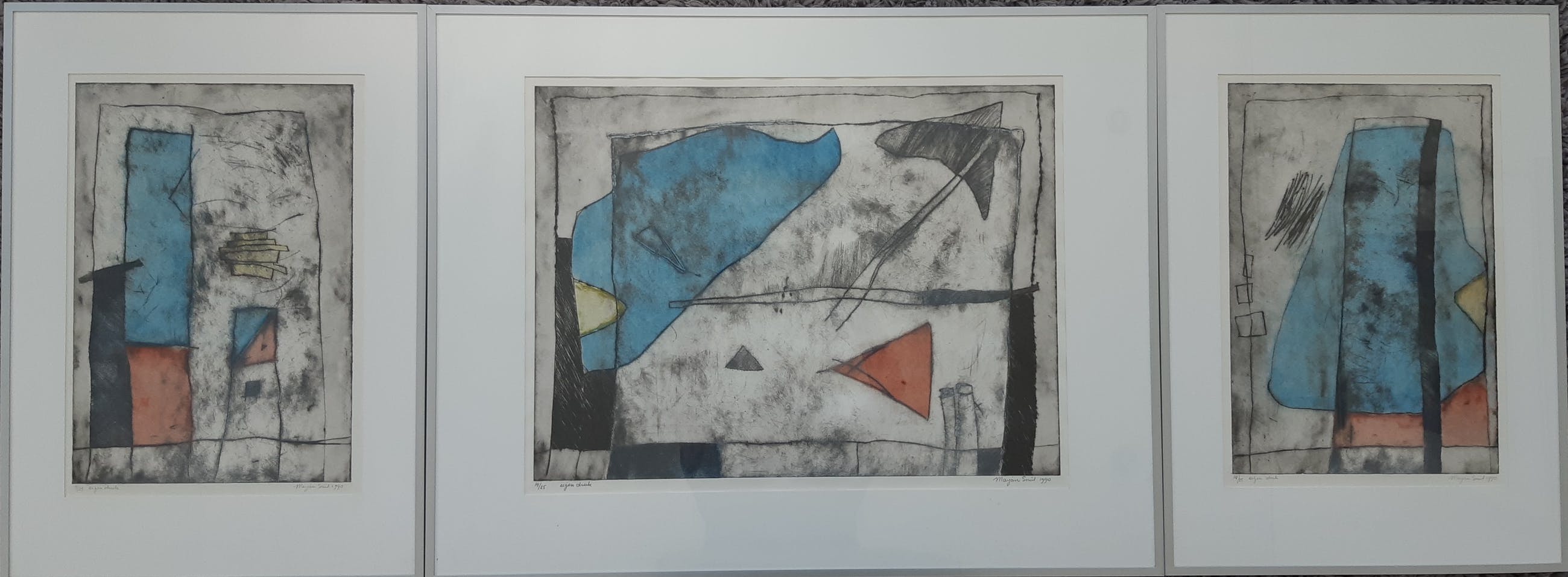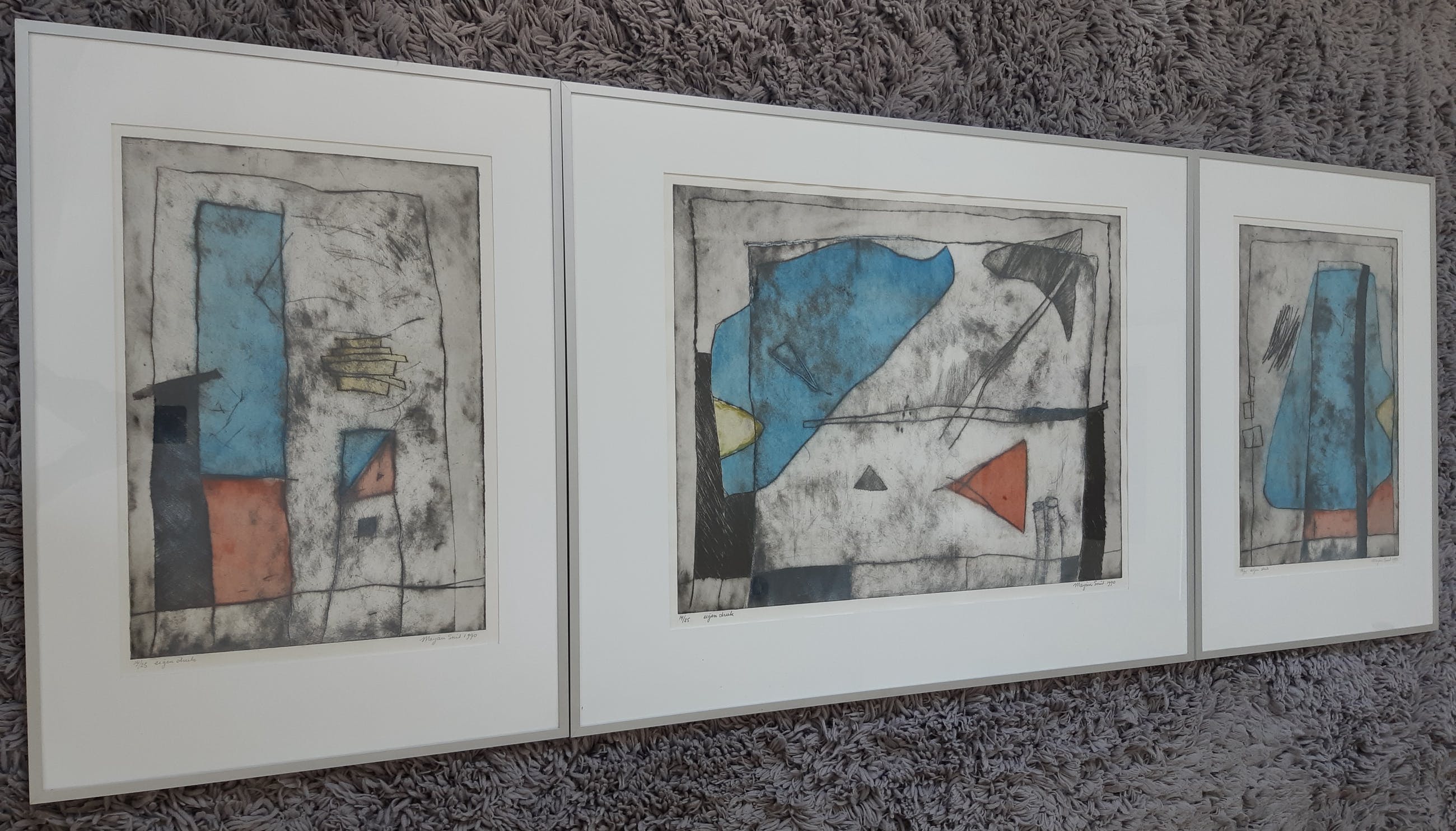 Drie kleurenetsen van Marjan Smit, samen een drieluik vormend. De etsen zijn alle met potlood gesigneerd, gedateerd en genummerd 14 / 25. De etsen zijn afzonderlijk ingelijst in Barth-lijsten van respectievelijk 71 x 51 cm (2 x) en 71 x 91 cm. De afbeeldingen meten 49 x 33 cm (2 x) en 49 x 65 cm. De conditie van het geheel is uitstekend.