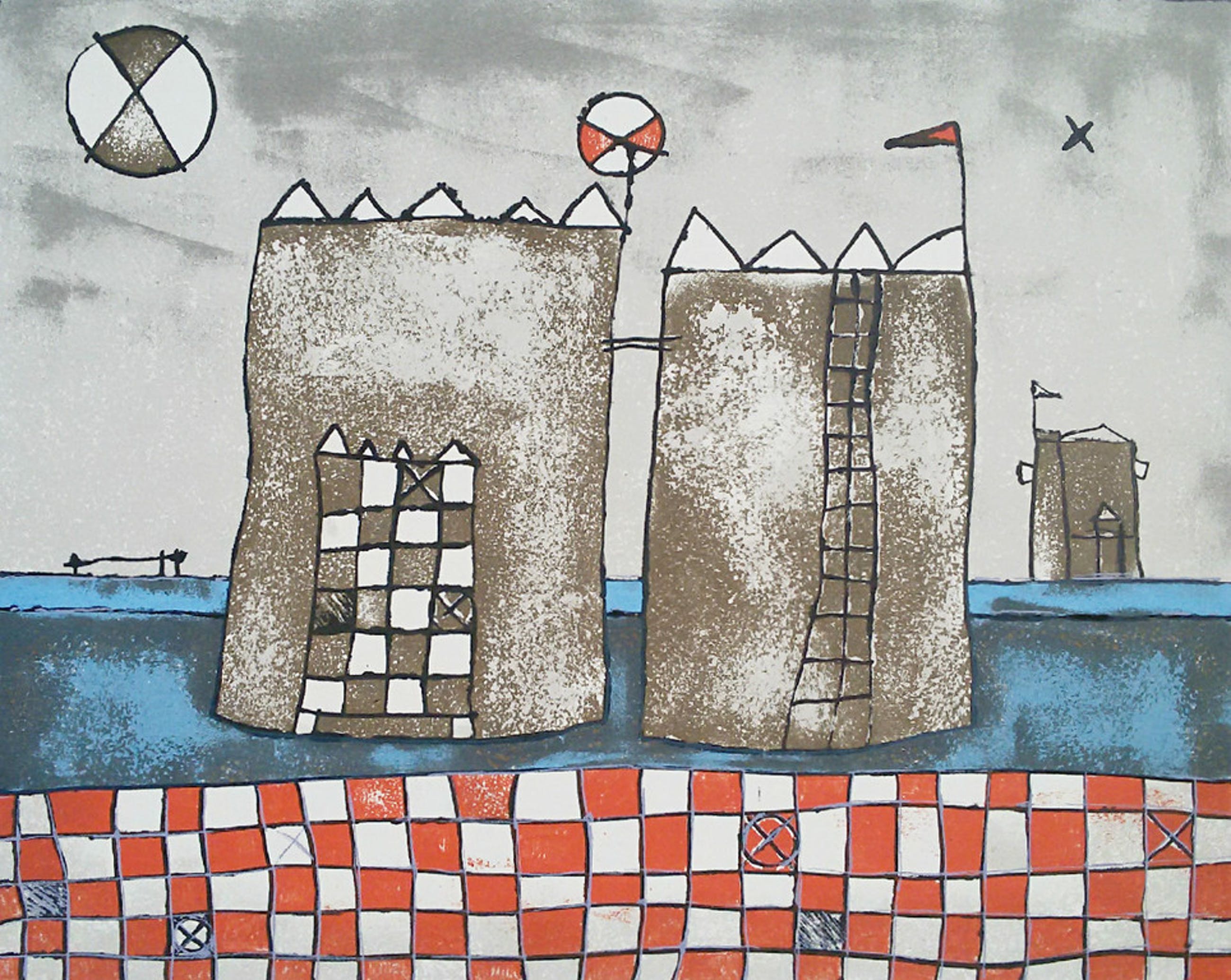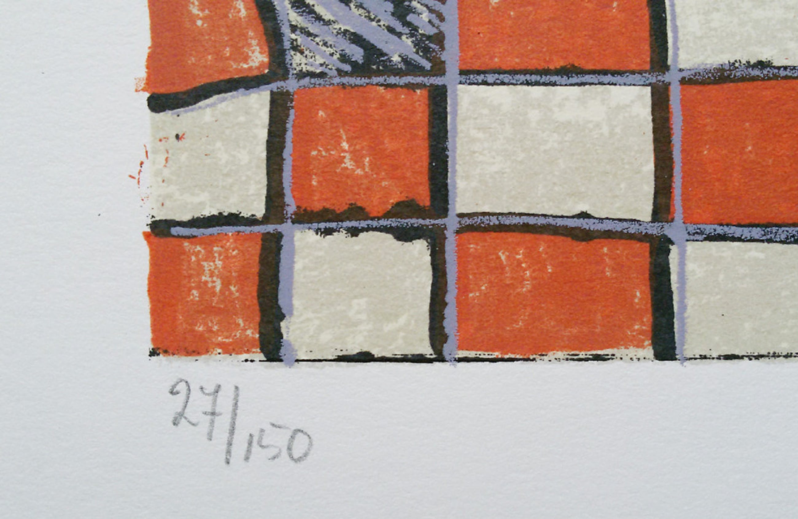 Karakteristiek werk van Marjan Smit uit 1999. Litho op papier, met potlood gesigneerd, gedateerd en genummerd (27/150). Afkomstig uit de kunstcollectie van ABNAMRO; in goede conditie. Werk heeft ingelijst gezeten want er zitten taperesten boven aan de achterkant van het blad en het blad is wat beschadigd aan de rand bovenaan. Ingelijst met passe-partout is het werk prima want de litho zelf en een ruime marge eromheen zijn in uitstekende conditie.