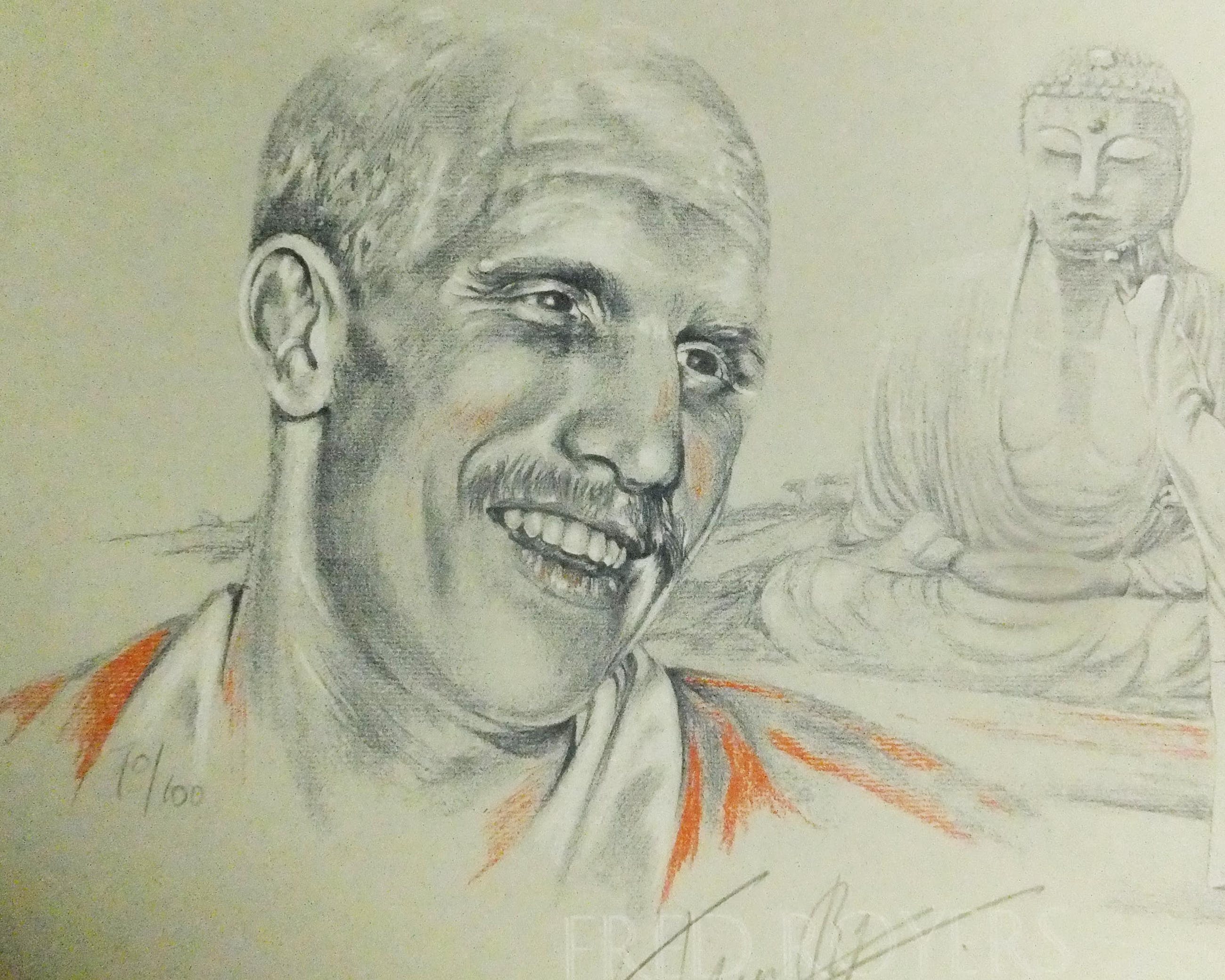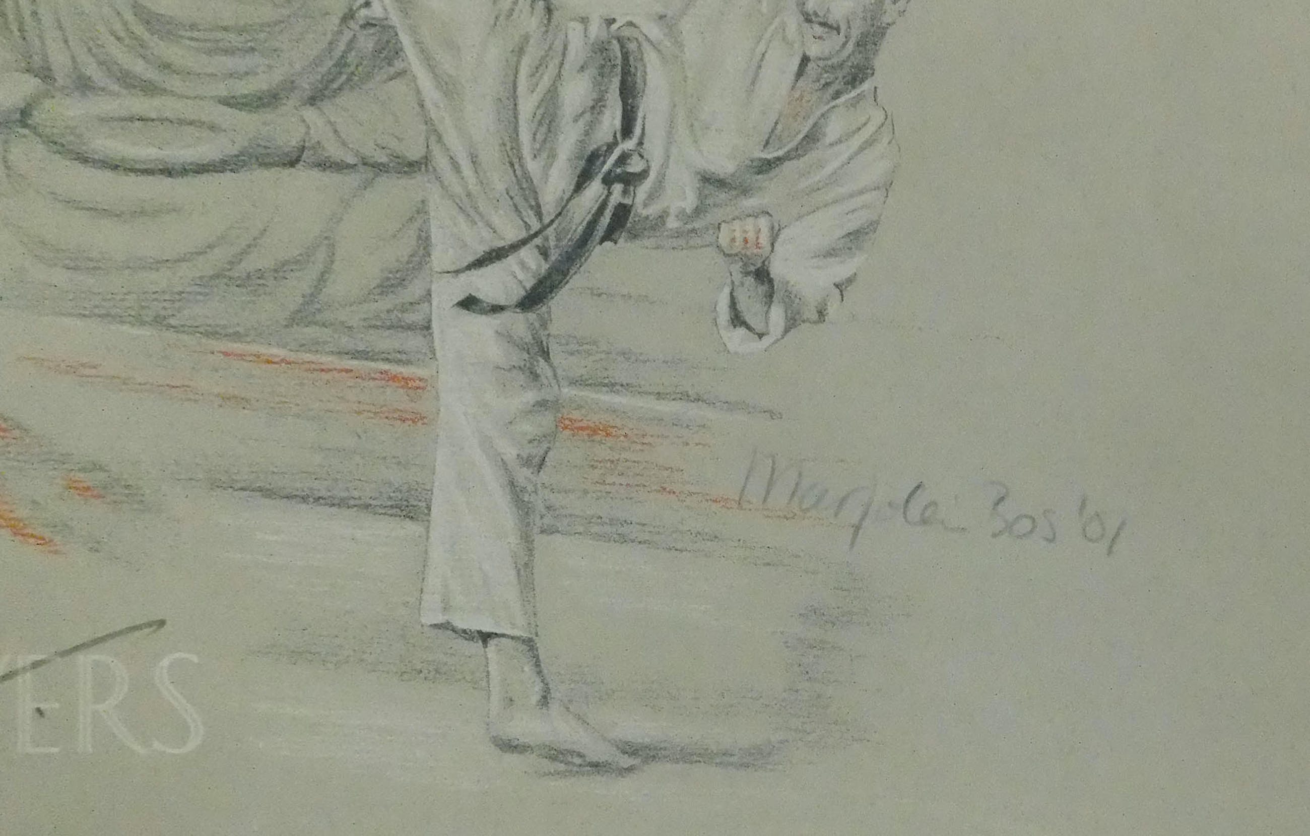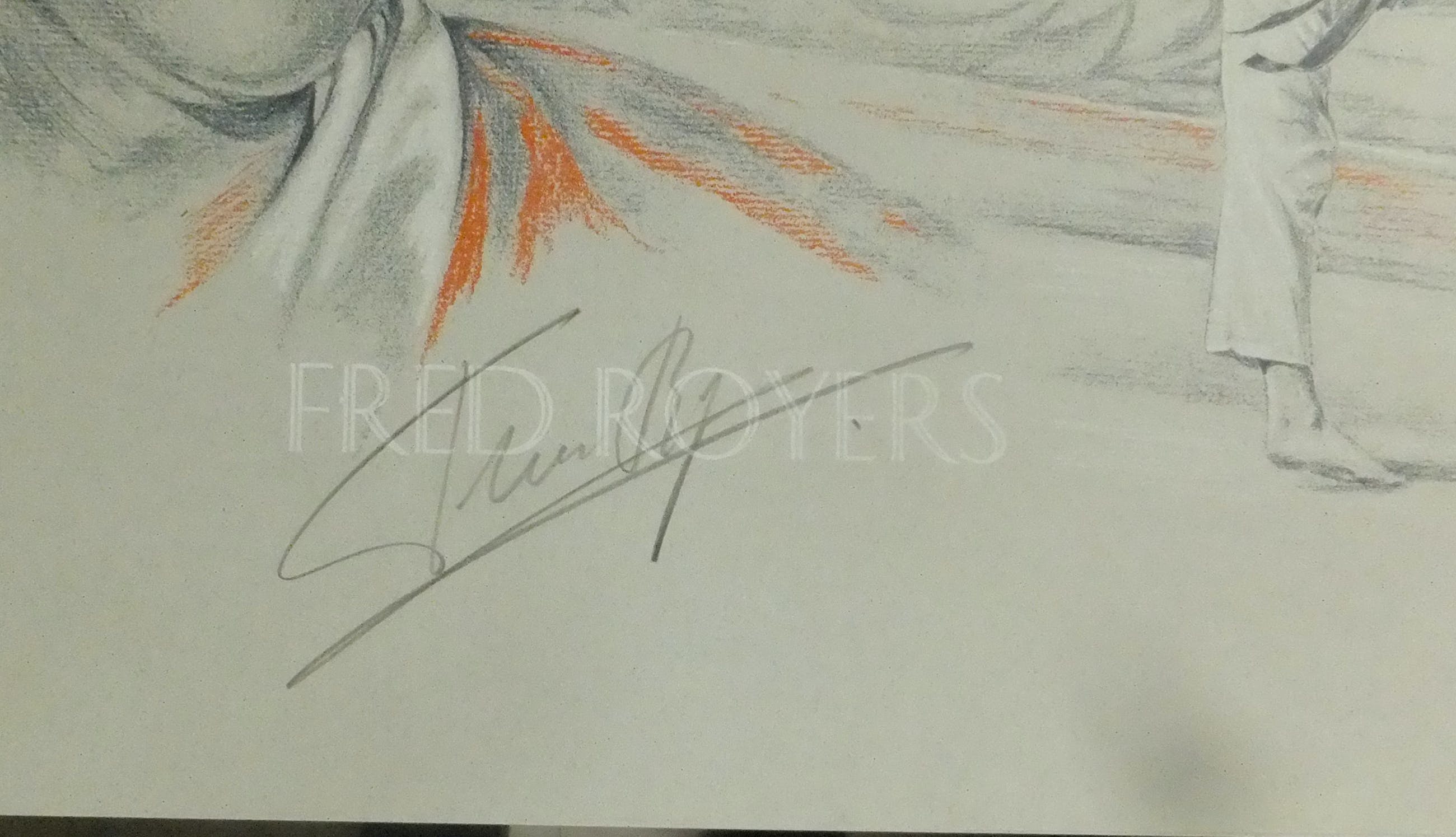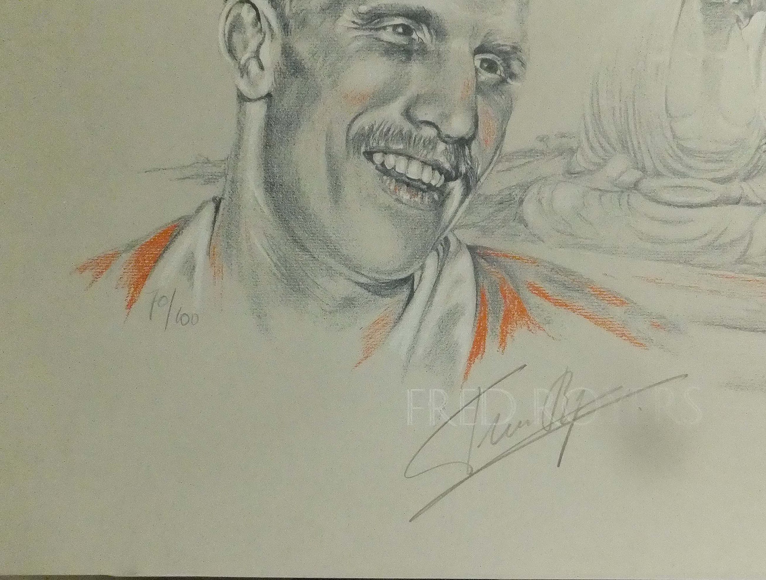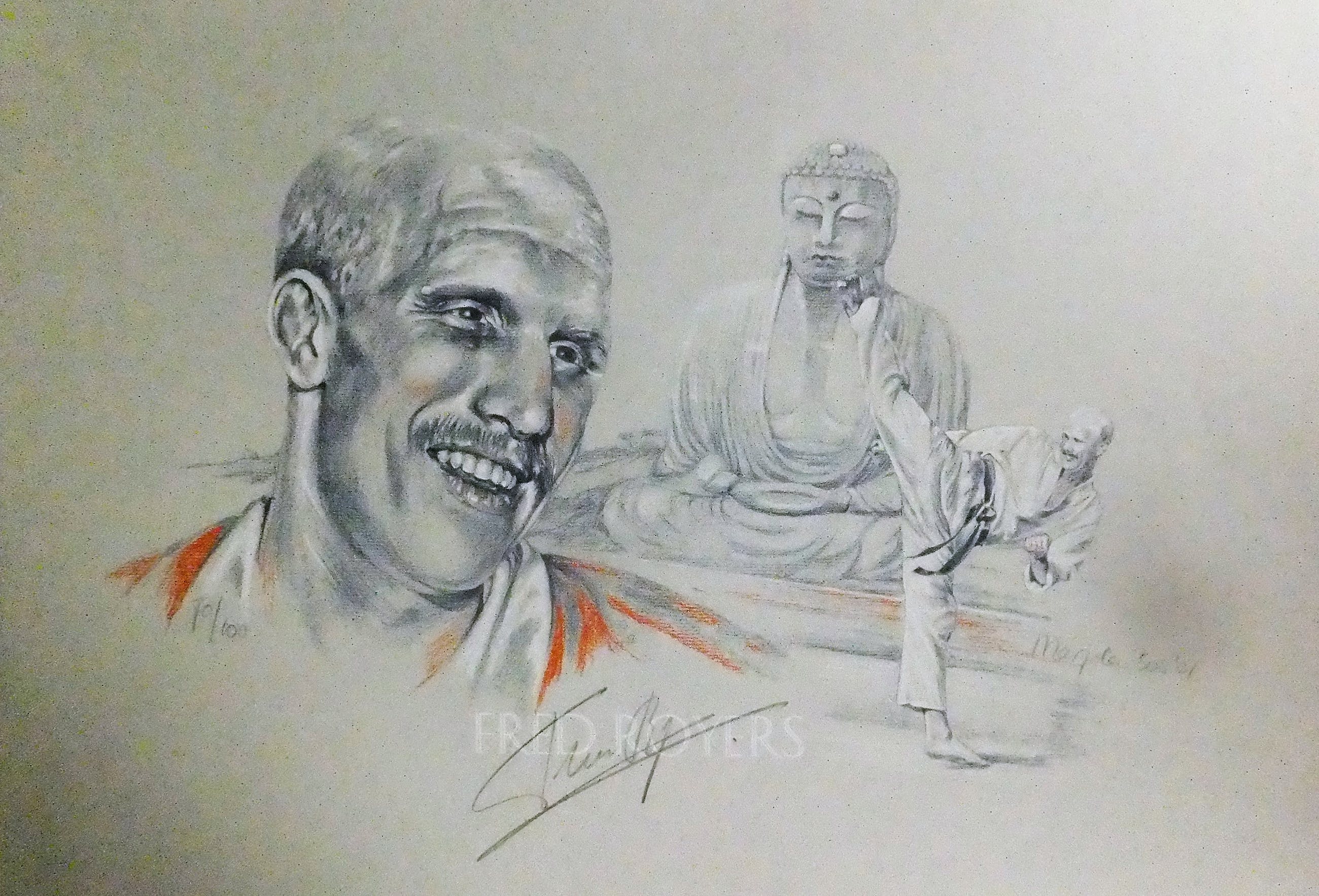 Fred Royers was een beroemd kickboxer bekend door zijn krachtige lage schoppen. Hij is hier vereeuwigd door Marjolein Bos in een litho. Midden onder staat zijn naam op grijs papier en hij heeft evenals Marjolein Bos de prent met potlood gesigneerd.