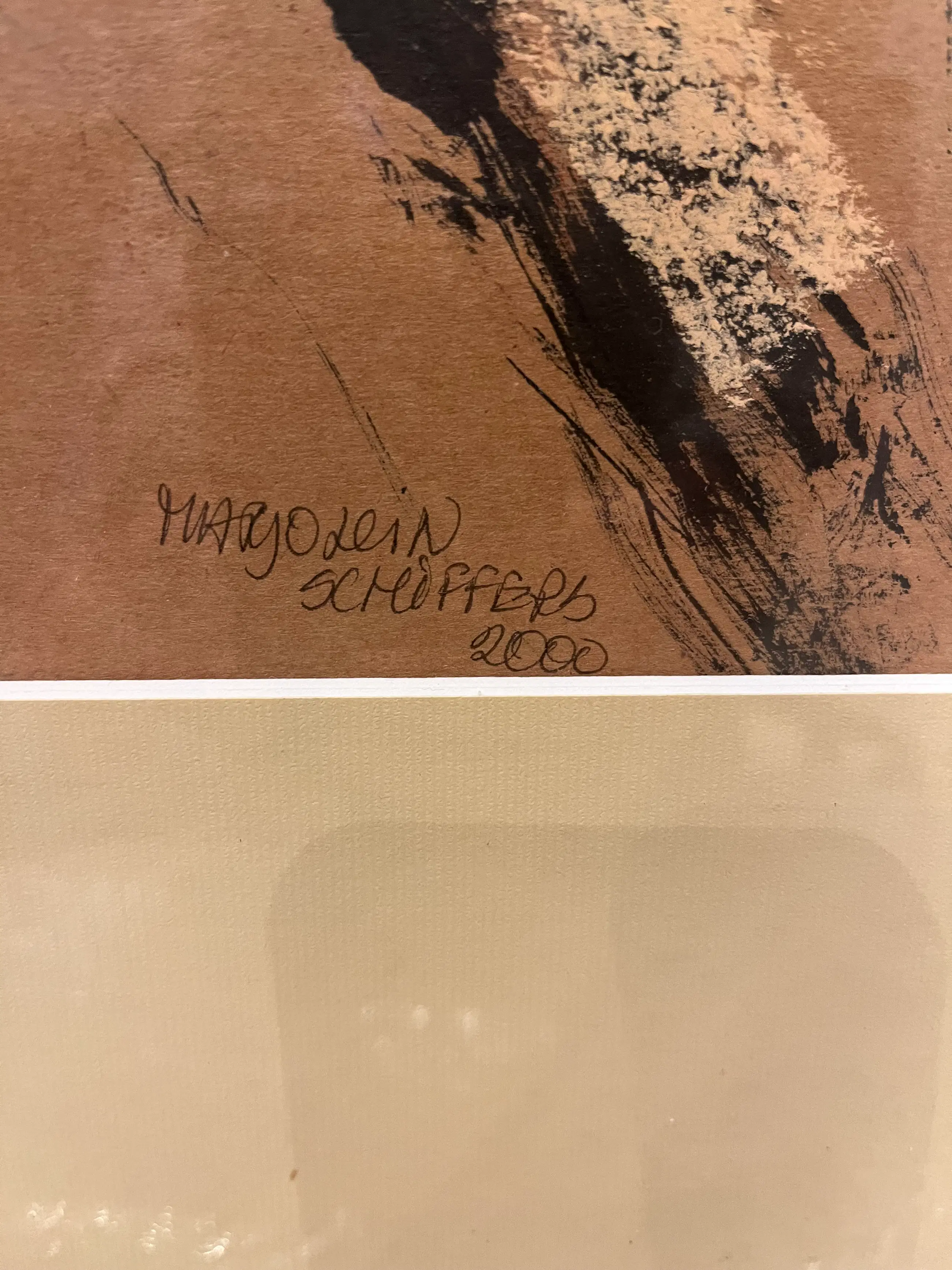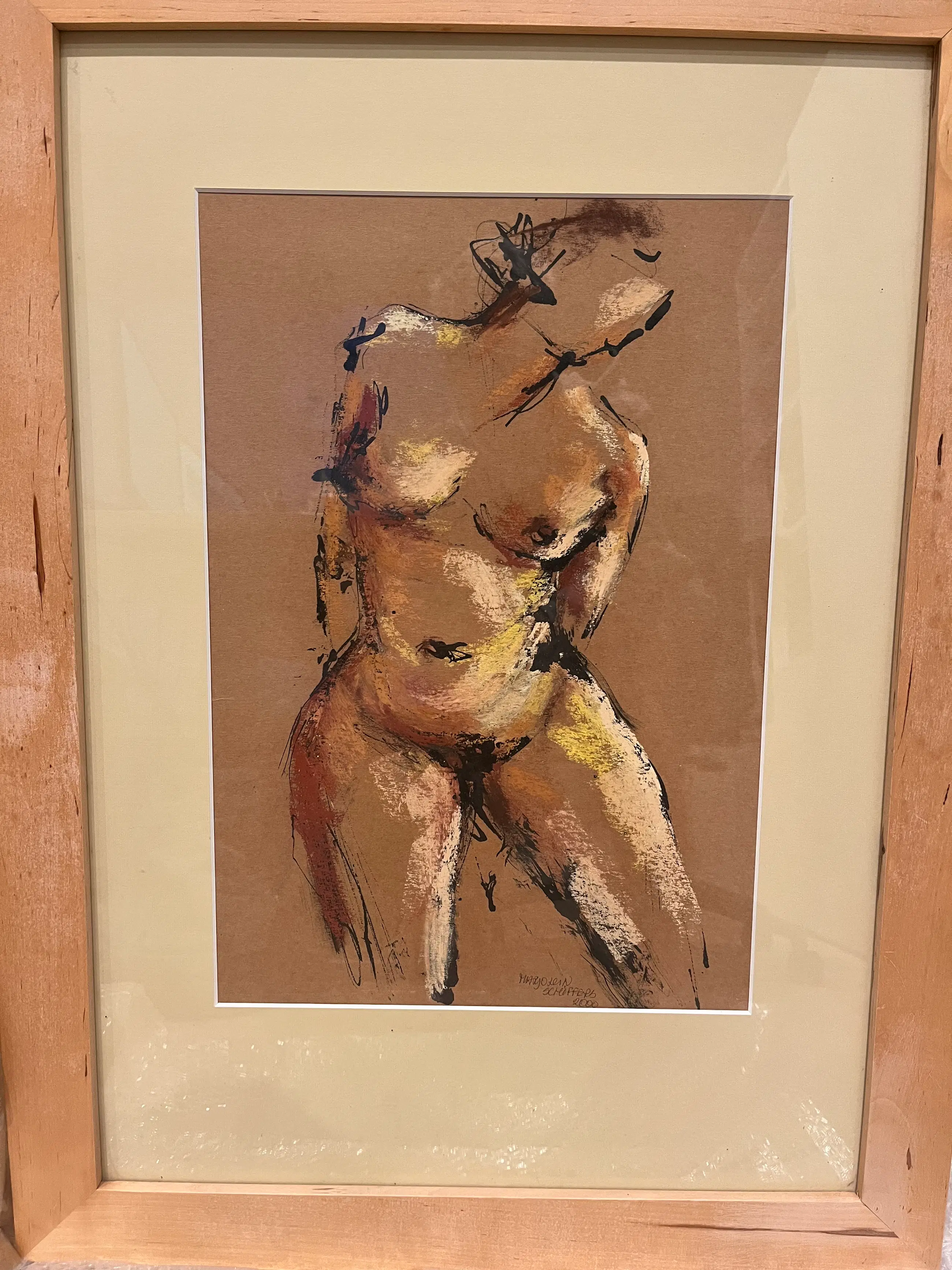 Naakte vrouwfiguur met pastelkrijt & oostindische inkt op bruin papier, in een modern houten lijst