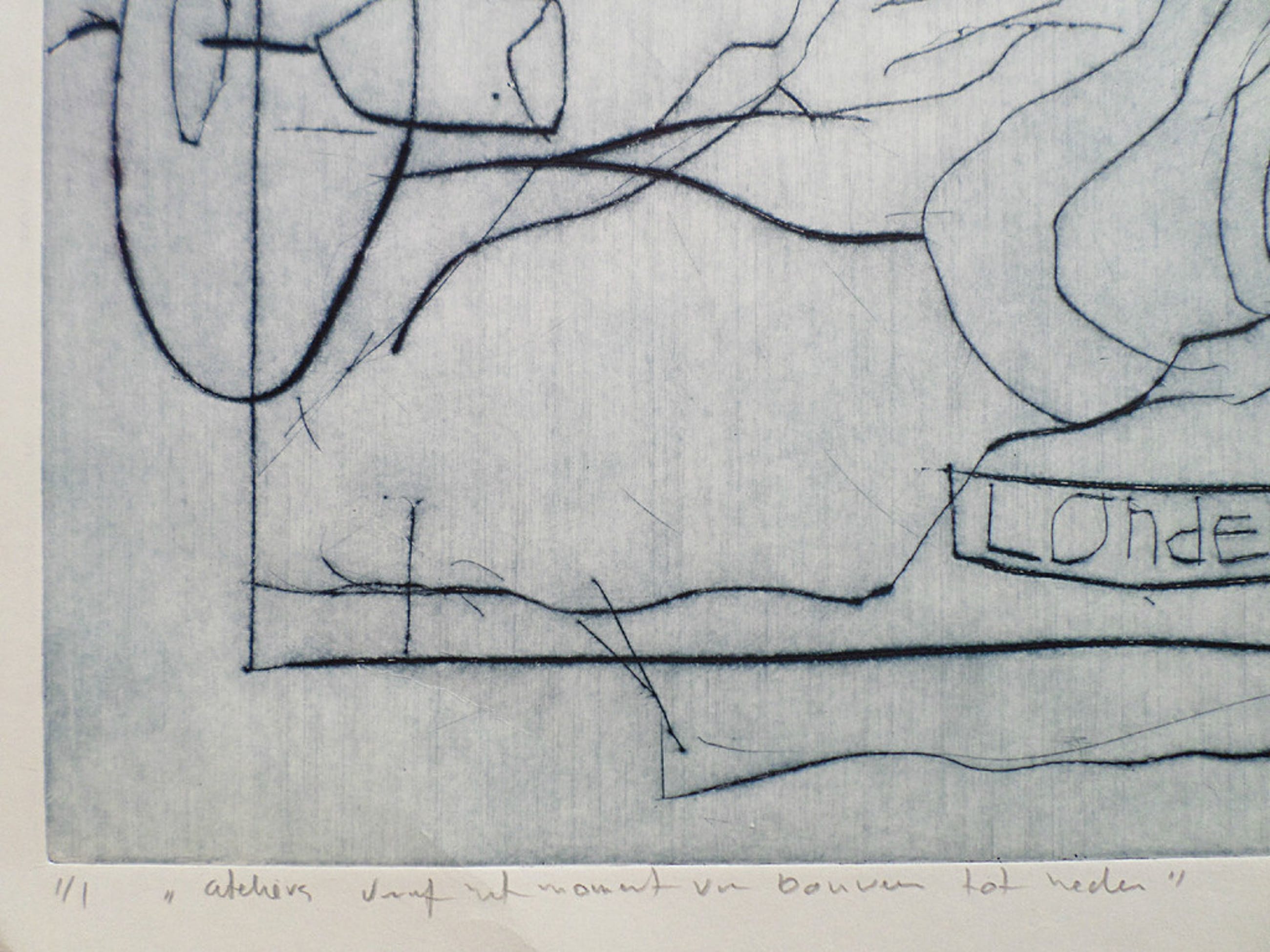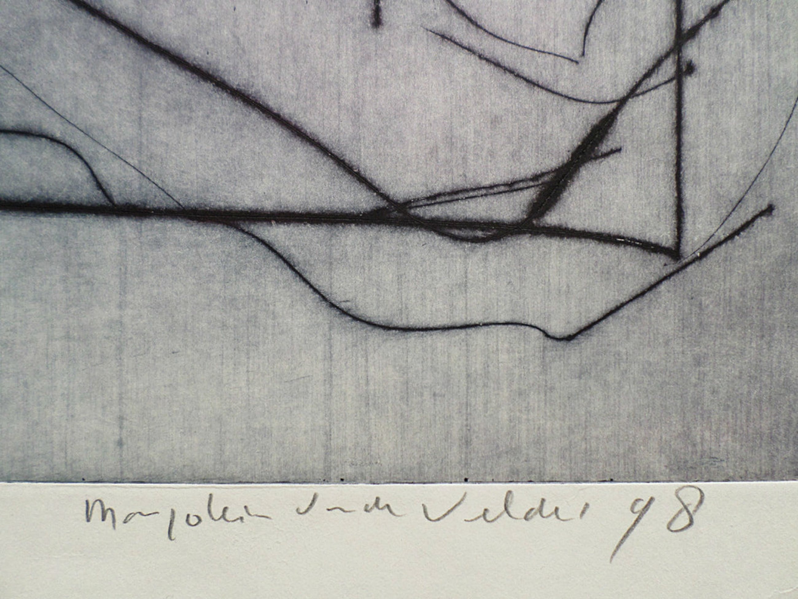 Aparte grote ets van Marjolein van de Velde uit 1998. Met potlood gesigneerd, getiteld, gedateerd en genummerd. Dit is nummer 1 uit een oplage van slechts 1, een unica dus! Afkomstig uit de kunstcollectie van ABNAMRO, in zeer goede conditie.
