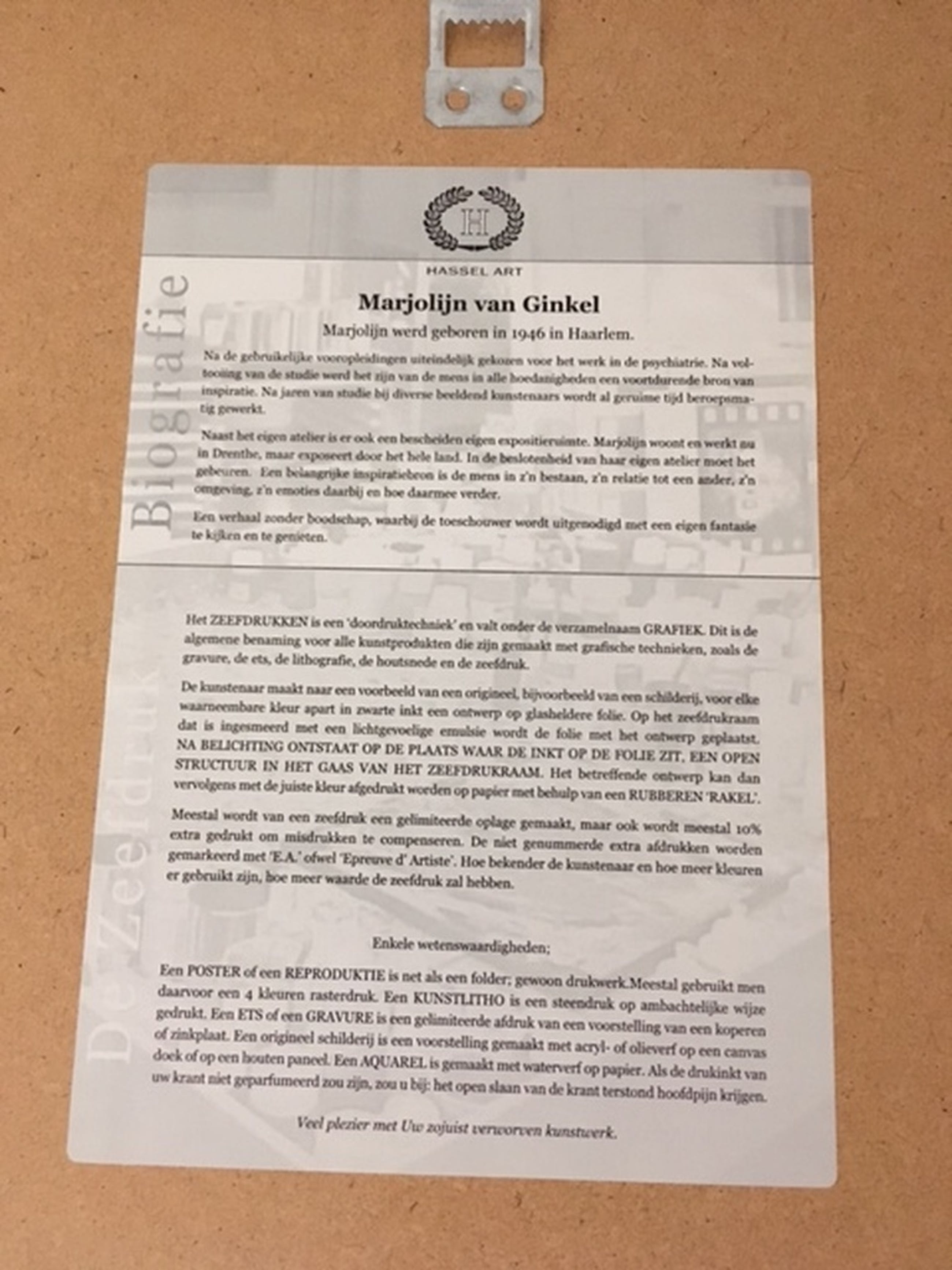 Afhalen | Het werk is af te halen op locatie. Als koper dient u zelf verpakkingsmateriaal mee te nemen. De locatie is: Haarlem, Nederland |