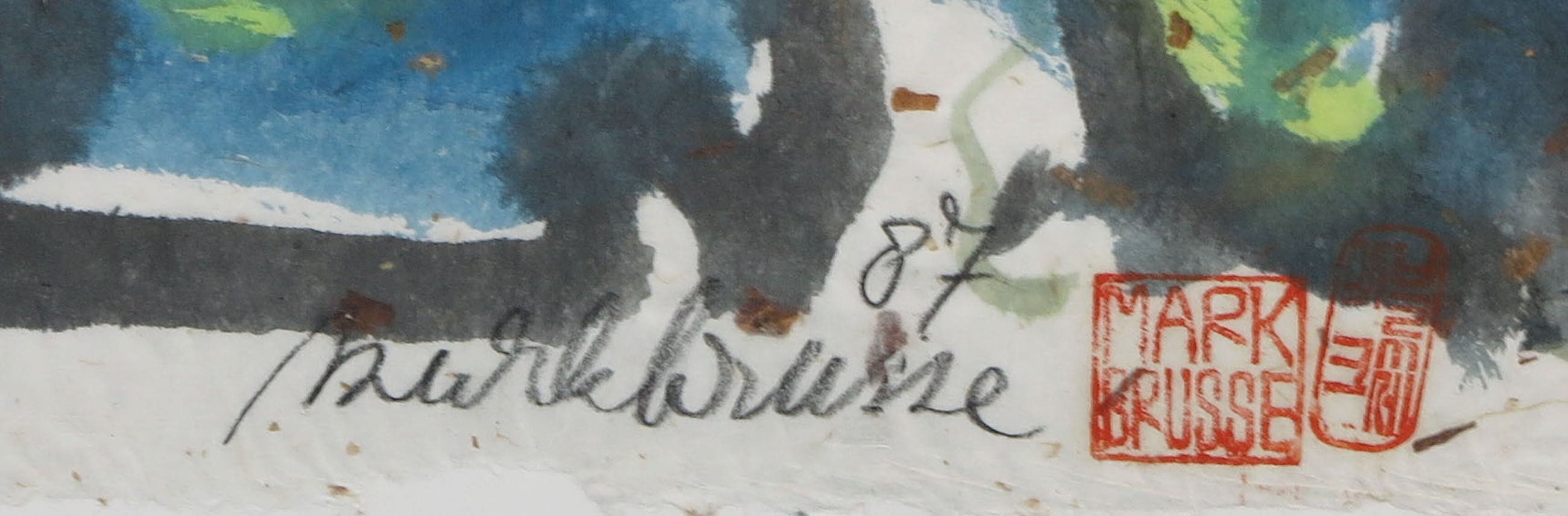 | De lijmrand waarmee het werk aan het achterblad is bevestigd schijnt door langs de bovenste rand van het werk. | |